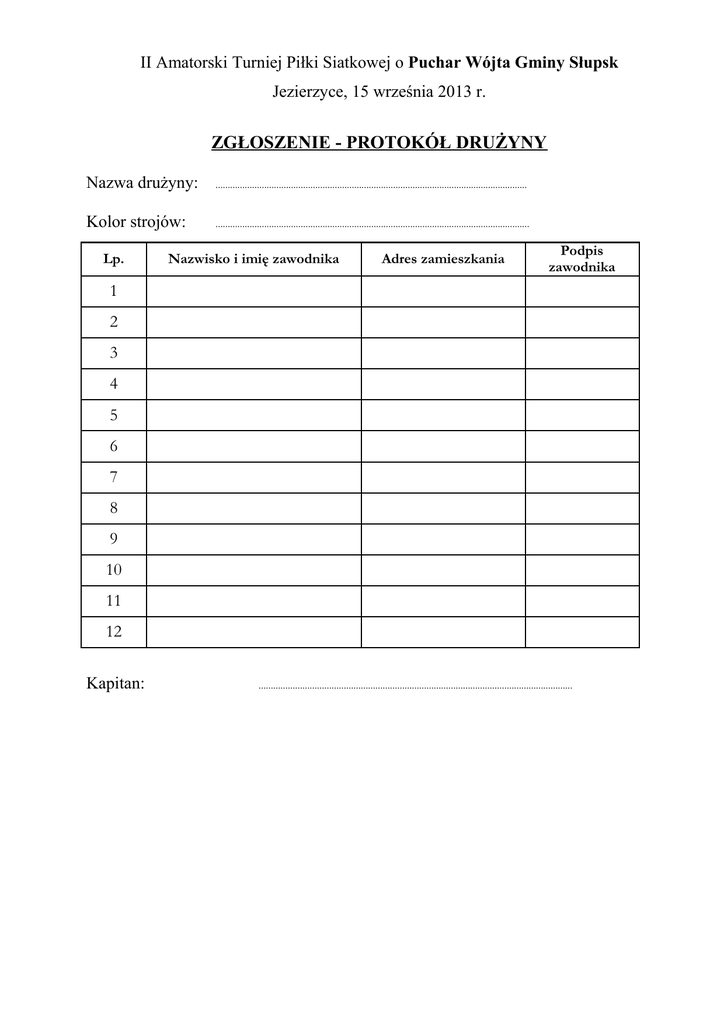 II Amatorski Turniej Piłki Siatkowej o Puchar Wójta Gminy Słupsk Jezierzyce, 15 września 2013 r. ZGŁOSZENIE - PROTOKÓŁ DRUŻYNY Nazwa drużyny: ................................................................................................................................ Kolor strojów: ................................................................................................................................. Lp. Nazwisko i imię zawodnika Adres zamieszkania Podpis zawodnika 1 2 3 4 5 6 7 8 9 10 11 12 Kapitan: .................................................................................................................................