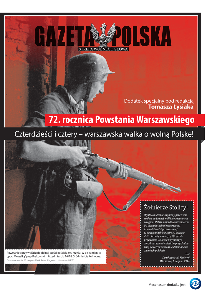 Dodatek specjalny pod redakcją Tomasza Łysiaka 72. rocznica Powstania Warszawskiego Czterdzieści i cztery – warszawska walka o wolną Polskę! Żołnierze Stolicy! Powstaniec przy wejściu do dolnej części kościoła św. Krzyża. W tle kamienica „pod Messalką” przy Krakowskim Przedmieściu 16/18. Śródmieście Północne. Data wykonania: 23 sierpnia 1944, Autor: Eugeniusz Haneman/MPW Wysłałem dziś upragniony przez was rozkaz do jawnej walki z odwiecznym wrogiem Polski, najeźdźcą niemieckim. Po pięciu latach nieprzerwanej i twardej walki prowadzonej w podziemiach konspiracji stajecie dziś z bronią w ręku, by Ojczyźnie przywrócić Wolność i wymierzyć zbrodniarzom niemieckim przykładną karę za terror i zbrodnie dokonane na ziemiach polskich. Bór Dowódca Armii Krajowej Warszawa, 1 sierpnia 1944 Mecenasem dodatku jest II 72. rocznica Powstania Warszawskiego DODATEK SPECJALNE 27 LIPCA 2016 Być zwyciężonym i nie ulec, to zwycięstwo Dramat bohaterów greckich tragedi i polegał na ich uwikłaniu w niezmien ny los. Jakiekolwiek decyzje by pod zrobili, nieubłagana konieczność pch jęli, cokolwiek by ała ich ku fatalnemu przeznaczeniu. Gd y 27 lipca gubernator dystryktu wa nakazał 100 tysiącom Polaków stawić rszawskiego Fischer się do pracy przy budowie umocnień , dowództwo Armii Krajowej straciło swobodę manewru, jaką miało dot nawet tę niewielką ychczas. Już nie było kwestii, czy będ zie powstanie w Warszawie – pozost pytanie, kiedy ono wybuchnie. Roz ała tylko odpowiedź na poczynał się ostatni akt polskiej trag edii okupacyjnej. Tomasz Panfil Z upełnie jasnym było, że władze Polskiego Państwa Podziemnego (PPP) nie mogą pozwolić na wykorzystanie 100 tys. (dwa dni później Himmler podwoił tę liczbę) warszawiaków do budowy umocnień. Oczywistym było też, że bojkot zarządzenia wywoła niemieckie represje. Brak reakcji struktur PPP – i to reakcji zbrojnej – oznaczałby tegoż państwa moralny i polityczny koniec. Na taki rozwój wypadków czekała komunistyczna agentura. Komuniści liczyli, że ich zakonspirowane komórki, niecofające się przed współpracą z gestapo dla osłabienia AK, w momencie spontanicznego wybuchu staną na czele pałającej żądzą odwetu warszawskiej młodzieży i zdobędą władzę w stolicy. Także cierpliwość żołnierzy AK wy- Stare Miasto. Sanitariuszka przy przewróconym tramwaju - fragmencie barykady przegradzającej ul. Miodową. Ujęcie z wylotu ul. Kapucyńskiej. Data wykonania: sierpień 1944 Autor: Jerzy Chojnacki „Chojna”/ MPW czekujących na możliwość podjęcia otwartej walki ze znienawidzonym okupantem była na wyczerpaniu. Festung Warschau W ostatnich dniach lipca Niemców w Warszawie ogarnęła panika: wydawało się, że nic nie jest w stanie zatrzymać sowieckich czołgów w niebywałym tempie pędzących ku polskiej stolicy. Warszawskimi ulicami przeciągały rozbite jednostki niemieckie, a śmiertelnie zmęczeni żołnierze w niczym nie przypominali dumnych zdobywców świata. W gorączkowym pośpiechu ewakuowały się niemieckie urzędy i instytucje, a warszawiakom umęczonym pięcioma latami okupacji wydawało się, że wolność jest już bardzo blisko. Lecz Niemcy szybko opanowali panikę: powrócili najważniejsi urzędnicy, złowrogą działalność wznowiło gestapo, na miasto znów wyszły 120-tysięcznej 1 Armii Wojska Polskiego, zbrojnego ramienia komunistycznego rządu lubelskiego. Armia ta, w składzie której obok ochotników walczyło również wielu przymusowo wcielonych żołnierzy AK, pojawiła się właśnie na pierwszej linii frontu. Za rozpoczęciem powstania w Warszawie przemawiały głównie względy polityczne – miało być ono dowodem poparcia społeczeństwa dla rządu emigracyjnego i zdolności AK do efektywnej współpracy z Armią Czerwoną. Przeciwnikiem walk w Warszawie był Naczelny Wódz generał Kazimierz Sosnkowski. Nie wierzył on Rosjanom i nie lekceważył armii niemieckiej, która choć bita na wszystkich frontach, wciąż dysponowała potężnymi siłami. Wiedząc o postanowieniach konferencji teherańskiej, nie ufał również zachodnim aliantom. Właśnie ten sceptyczny punkt widzenia przedstawił dowództwu AK wysłany do kraju emisariusz, Jan Nowak-Jeziorański. Powiedział wówczas, Olbrzymia większość Polaków – polityków, żołnierzy i zwykłych ludzi – wciąż, mimo że dawny świat na ich oczach rozsypywał się w gruzy, wierzyła w nieaktualne już zasady i idee: w honor, wolność, sprawiedliwość, wartość ludzkiego życia, w to, że umów należy dotrzymywać, a normy moralne i etyczne decydują o czynach. patrole wojskowe i policyjne. W okolice Warszawy ściągano nowe siły, w tym dwie doborowe dywizje pancerne SS, a także korpus węgierski. 26 lipca Hitler ogłosił Warszawę „twierdzą”, a dzień później na murach i słupach pojawiły się afisze ze wspomnianym rozporządzeniem Fischera. Kluczową kwestią było to, jak zachowają się wobec ewentualnego powstania Sowieci. Działania oddziałów Armii Czerwonej wskazywały, że celem ofensywy lipcowej jest zdobycie Warszawy, wielkiego węzła komunikacyjnego. Atak na stolicę zostałby znakomicie ułatwiony, gdyby powstańcom udało się wyprzeć Niemców z dzielnic nadbrzeżnych i uchwycić mosty. Armia Czerwona mogłaby łatwo przekroczyć Wisłę, uniknąć wyczerpujących walk w umocnionym mieście i wyzwolić spod niemieckiej okupacji pierwszą stolicę europejską. Na triumfalne wkroczenie do Warszawy liczył generał Zygmunt Berling, dowódca że decyzje podjęte w Teheranie przez Wielką Trójkę oddawały „całą Polskę bez zastrzeżeń, bez reszty, bez względu na dalszy bieg wypadków pod niepodzielną okupację czerwonej armii (…) rząd polski w Londynie i społeczeństwo w kraju walcząc o niepodległość, walczyły już o straconą pozycję”. Takich realistów jak generał Sosnkowski było niewielu: olbrzymia więk
