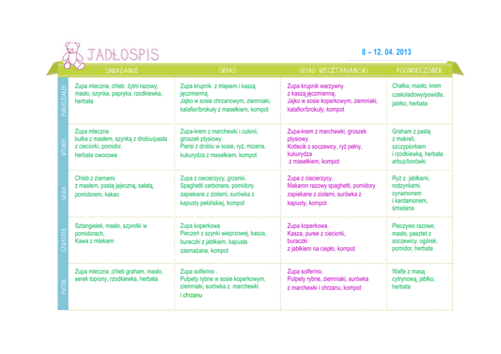 8 – 12. 04. 2013 Zupa mleczna, chleb żytni razowy, masło, szynka, papryka, rzodkiewka, herbata Zupa krupnik z mięsem i kaszą jęczmienną. Jajko w sosie chrzanowym, ziemniaki, kalafior/brokuły z masełkiem, kompot Zupa krupnik warzywny z kaszą jęczmienną. Jajko w sosie koperkowym, ziemniaki, kalafior/brokuły, kompot Chałka, masło, krem czekoladowy/powidła, jabłko, herbata Zupa mleczna bułka z masłem, szynką z drobiu/pasta z cieciorki, pomidor, herbata owocowa Zupa-krem z marchewki i cukinii, groszek ptysiowy. Piersi z drobiu w sosie, ryż, mizeria, kukurydza z masełkiem, kompot Zupa-krem z marchewki, groszek ptysiowy Kotlecik z soczewicy, ryż pełny, kukurydza z masełkiem, kompot Graham z pastą z makreli, szczypiorkiem i rzodkiewką, herbata arbuz/borówki Chleb z ziarnami z masłem, pastą jajeczną, sałatą, pomidorem, kakao Zupa z ciecierzycy, grzanki. Spaghetti carbonara, pomidory zapiekane z ziołami, surówka z kapusty pekińskiej, kompot Zupa z ciecierzycy. Makaron razowy spaghetti, pomidory zapiekane z ziołami, surówka z kapusty, kompot Ryż z jabłkami, rodzynkami, cynamonem i kardamonem, śmietana Sztangielek, masło, szprotki w pomidorach, Kawa z mlekiem Zupa koperkowa Pieczeń z szynki wieprzowej, kasza, buraczki z jabłkiem, kapusta zasmażana, kompot Zupa koperkowa. Kasza, puree z cieciorki, buraczki z jabłkiem na ciepło, kompot Pieczywo razowe, masło, pasztet z soczewicy, ogórek, pomidor, herbata Zupa mleczna ,chleb graham, masło, serek topiony, rzodkiewka, herbata Zupa solferino . Pulpety rybne w sosie koperkowym, ziemniaki, surówka z marchewki i chrzanu Zupa solferino. Pulpety rybne, ziemniaki, surówka z marchewki i chrzanu, kompot Wafle z masą cytrynową, jabłko, herbata