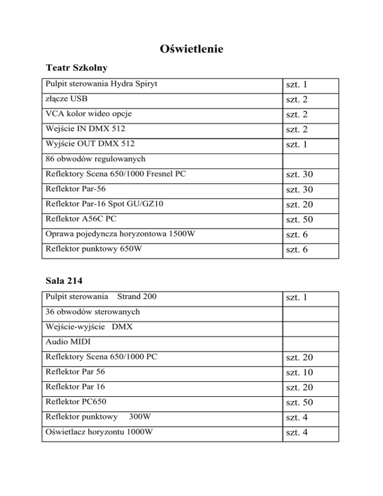Oświetlenie Teatr Szkolny Pulpit sterowania Hydra Spiryt szt. 1 złącze USB szt. 2 VCA kolor wideo opcje szt. 2 Wejście IN DMX 512 szt. 2 Wyjście OUT DMX 512 szt. 1 86 obwodów regulowanych Reflektory Scena 650/1000 Fresnel PC szt. 30 Reflektor Par-56 szt. 30 Reflektor Par-16 Spot GU/GZ10 szt. 20 Reflektor A56C PC szt. 50 Oprawa pojedyncza horyzontowa 1500W szt. 6 Reflektor punktowy 650W szt. 6 Sala 214 Pulpit sterowania Strand 200 szt. 1 36 obwodów sterowanych Wejście-wyjście DMX Audio MIDI Reflektory Scena 650/1000 PC szt. 20 Reflektor Par 56 szt. 10 Reflektor Par 16 szt. 20 Reflektor PC650 szt. 50 Reflektor punktowy 300W szt. 4 Oświetlacz horyzontu 1000W szt. 4 Nagłośnienie Teatr Szkolny Kolumny głośnikowe JBL JRX 125 Kolumny głośnikowe JBL JRX-115 Monitor odsłuchowy JBL JRX-112M Wzmacniacz mocy Crown XTi-2000 Mikser audio Soundkraft LX7\16 Zestaw bezprzewodowy odbiornik Shure L4 Nadajnik bodypack Shure L11-cm Zestaw bezprzewodowy JTS Mikrofony nagłowne Mikrofony do ręki Mikrofon pojemnościowy Shure Sm-81 Mikser audio Allen&Heath PA-12 Procesor pogłosowy Lexicon MX-300 Procesor głośnikowy DBX drive rack PA Odtwarzacz Cd Taskam CD-01U Odtwarzacz MD Onkyo szt. 2 szt. 2 szt. 2 szt. 2 szt. 1 szt. 4 szt. 4 szt. 4 szt. 8 szt. 4 szt. 2 szt. 2 szt. 1 szt. 1 szt. 2 szt. 1 Sala 214 Kolumny głośnikowe Dynacord FE-200 Mikser audio Behringer Xe1204FX Wzmacniacz Crown XLS 602 Odtwarzacz CD Technics SL-PG 480A szt. 2 szt. 1 szt. 1 szt. 2 Teatr Szkolny Sala 214