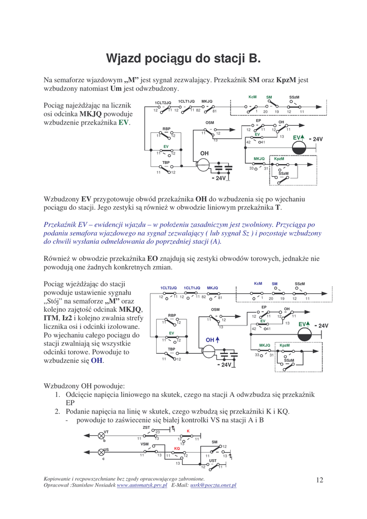 Wjazd poci gu do stacji B. Na semaforze wjazdowym „M” jest sygnał zezwalaj cy. Przeka nik SM oraz KpzM jest wzbudzony natomiast Um jest odwzbudzony. 1CLT1JQ 1CLT2JQ Poci g naje d aj c na licznik osi odcinka MKJQ powoduje wzbudzenie przeka nika EV. 11 12 12 KcM MKJQ 11 82 81 1 11 11 12 12 OH 11 13 MKJQ 33 12 11 OH - 24V EV 41 42 TBP 11 12 12 EV 13 12 19 11 12 EV 11 20 SSzM EP OSM RBP SM KpzM 31 SSzM - 24V Wzbudzony EV przygotowuje obwód przeka nika OH do wzbudzenia si po wjechaniu poci gu do stacji. Jego zestyki s równie w obwodzie liniowym przeka nika T. Przeka nik EV – ewidencji wjazdu – w poło eniu zasadniczym jest zwolniony. Przyci ga po podaniu semafora wjazdowego na sygnał zezwalaj cy ( lub sygnał Sz ) i pozostaje wzbudzony do chwili wysłania odmeldowania do poprzedniej stacji (A). Równie w obwodzie przeka nika EO znajduj si zestyki obwodów torowych, jednak e nie powoduj one adnych konkretnych zmian. Poci g wje d aj c do stacji powoduje ustawienie sygnału „Stój” na semaforze „M” oraz kolejno zaj to odcinak MKJQ, ITM, Iz2 i kolejno zwalnia strefy licznika osi i odcinki izolowane. Po wjechaniu całego poci gu do stacji zwalniaj si wszystkie odcinki torowe. Powoduje to wzbudzenie si OH. 1CLT2JQ 1CLT1JQ 11 12 12 KcM MKJQ 11 82 81 1 11 11 12 12 13 EV 11 EV 42 33 12 - 24V 12 11 11 12 13 41 MKJQ TBP 11 19 OH 11 12 OH 12 20 SSzM EP OSM RBP SM EV - 24V KpzM 31 SSzM Wzbudzony OH powoduje: 1. Odci cie napi cia liniowego na skutek, czego na stacji A odwzbudza si przeka nik EP 2. Podanie napi cia na lini w skutek, czego wzbudz si przeka niki K i KQ. - powoduje to za wiecenie si białej kontrolki VS na stacji A i B ZST VT b 11 K 23 13 12 13 KQ VSM US c 11 13 11 11 SM 12 13 12 11 UST 12 13 11 Kopiowanie i rozpowszechniane bez zgody opracowuj cego zabronione. Opracował :Stanisław Nosiadek www.automatyk.prv.pl E-Mail: [email protected] 12 KQ SM 3. Dzwonienie dzwonka liniowego na stacji B 61 VZT 63 31 21 HST 62 22 31 42 41 43 EP OH 32 61 33 4. Odwzbudzenie si przeka nika EV powoduje wysłanie napi cia na linie ( yły 5-6 ) na skutek czego na stacji A wzbudza si przeka nik T. Wzbudzony T powoduje wzbudzenie si przeka nika EO. T AKJQ 32 EO 31 42 ITA Iz1 41 TBP 72 71 OZ EO 42 41 62 61 VSM 72 71 Ten natomiast powoduje pojawienie si napi cia na linii a tym samym wzbudzenie si przeka nika EP na stacji B. Wzbudzony EP tworzy nowy obwód zasilania przeka nika OH, który pozostaje wzbudzony. 1CLT2JQ 12 1CLT1JQ 11 12 KcM MKJQ 11 82 81 1 11 12 11 12 13 EV 11 12 12 19 EV 42 OH - 24V 11 11 12 13 41 MKJQ 33 12 OH 11 12 TBP 11 20 SSzM EP OSM RBP SM EV - 24V KpzM 31 SSzM I w ten oto sposób urz dzenia wróciły do stanu pierwotnego, czyli mo na ze stacji A wyprawi nast pny poci g lub zmieni kierunek ruchu. Na stacji A wzbudzone s przeka niki : HST, OH, OSM, SM, OZ, K, KQ, T, EO wiec kontrolki: liniowe zaj to ci odcinków, zielona PS. Na stacji B wzbudzone s przeka niki : EO, OZ, UST, VSM,.OH ,K, KQ, EP wiec kontrolki: liniowe zaj to ci odcinków, czerwona US. Kopiowanie i rozpowszechniane bez zgody opracowuj cego zabronione. Opracował :Stanisław Nosiadek www.automatyk.prv.pl E-Mail: [email protected] 13