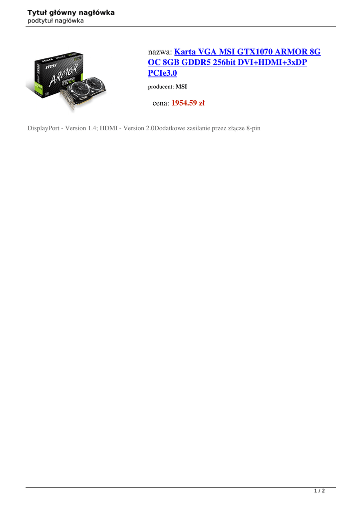 Tytuł główny nagłówka podtytuł nagłówka nazwa: Karta VGA MSI GTX1070 ARMOR 8G OC 8GB GDDR5 256bit DVI+HDMI+3xDP PCIe3.0 producent: MSI cena: 1954.59 zł DisplayPort - Version 1.4; HDMI - Version 2.0Dodatkowe zasilanie przez złącze 8-pin 1/2 Tytuł główny nagłówka podtytuł nagłówka Strona producenta Strona o towarze nazwa Wspierane systemy operacyjne Rodzaj chłodzenia Rozwiązania producenta VGA Minimalna moc zasilacza Liczba zajmowanych slotów w obudowie Wymiary [S x W] (mm) Okres rękojmi w miesiącach wartość http://www.msi.com.tw https://www.msi.com/Graphics-card/GeFor ce-GTX-1070-ARMOR-8G-OC.html Windows 10, Windows 7, Windows 8, Windows 8.1 Aktywne (wentylator+radiator) MSI Afterburner, MSI ARMOR 500 W Konstrukcja dwuslotowa 279 x 140 36 2/2