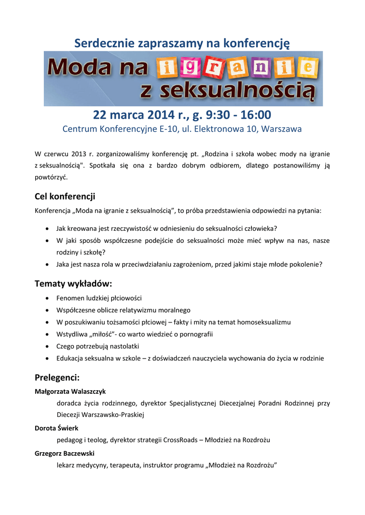 Serdecznie zapraszamy na konferencję 22 marca 2014 r., g. 9:30 - 16:00 Centrum Konferencyjne E-10, ul. Elektronowa 10, Warszawa W czerwcu 2013 r. zorganizowaliśmy konferencję pt. „Rodzina i szkoła wobec mody na igranie z seksualnością". Spotkała się ona z bardzo dobrym odbiorem, dlatego postanowiliśmy ją powtórzyć. Cel konferencji Konferencja „Moda na igranie z seksualnością”, to próba przedstawienia odpowiedzi na pytania: Jak kreowana jest rzeczywistość w odniesieniu do seksualności człowieka? W jaki sposób współczesne podejście do seksualności może mieć wpływ na nas, nasze rodziny i szkołę? Jaka jest nasza rola w przeciwdziałaniu zagrożeniom, przed jakimi staje młode pokolenie? Tematy wykładów: Fenomen ludzkiej płciowości Współczesne oblicze relatywizmu moralnego W poszukiwaniu tożsamości płciowej – fakty i mity na temat homoseksualizmu Wstydliwa „miłość”- co warto wiedzieć o pornografii Czego potrzebują nastolatki Edukacja seksualna w szkole – z doświadczeń nauczyciela wychowania do życia w rodzinie Prelegenci: Małgorzata Walaszczyk doradca życia rodzinnego, dyrektor Specjalistycznej Diecezjalnej Poradni Rodzinnej przy Diecezji Warszawsko-Praskiej Dorota Świerk pedagog i teolog, dyrektor strategii CrossRoads – Młodzież na Rozdrożu Grzegorz Baczewski lekarz medycyny, terapeuta, instruktor programu „Młodzież na Rozdrożu” Krzysztof Niemyski absolwent Uniwersytetu Medycznego specjalizujący się w naprotechnologii Urszula Nawrot pedagog specjalny, doradca rodzinny, instruktor programu „Młodzież na Rozdrożu” Katarzyna Krawczyk psycholog, współzałożycielka i dyrektor szkoły „Animus”, instruktor programu „Młodzież na Rozdrożu” Anna Niemyska polonistka i wieloletni nauczyciel wychowania do życia w rodzinie, instruktor programu „Młodzież na Rozdrożu”, współautorka podręcznika „Zanim wybierzesz” Koszt udziału w konferencji - 20 zł - obejmuje: materiały konferencyjne oraz poczęstunek (kawa, herbata, kanapka). Ze względów organizacyjnych prosimy o wcześniejsze zgłoszenia poprzez wypełnienie formularza na stronie www.igraniezseksualnoscia.pl. Kontakt: E-mail: [email protected] Telefon: +48 663 224 434 www.igraniezseksualnoscia.pl Organizatorem konferencji jest: CrossRoads – Młodzież na Rozdrożu to strategia działająca w ramach międzywyznaniowej, chrześcijańskiej Fundacji Ruchu Nowego Życia. Koncentruje się na kształtowaniu dobrego charakteru i rozwijaniu pozytywnych wartości wśród młodzieży i środowisk lokalnych w celu przeciwdziałania problemom społecznym. Głównym narzędziem jakie wykorzystuje jest profilaktyczno- wychowawczy program „Młodzież na Rozdrożu”, stosowany w ponad 50 krajach na świecie. Więcej informacji na stronie internetowej www.mlodzieznarozdrozu.pl. Partnerzy:
