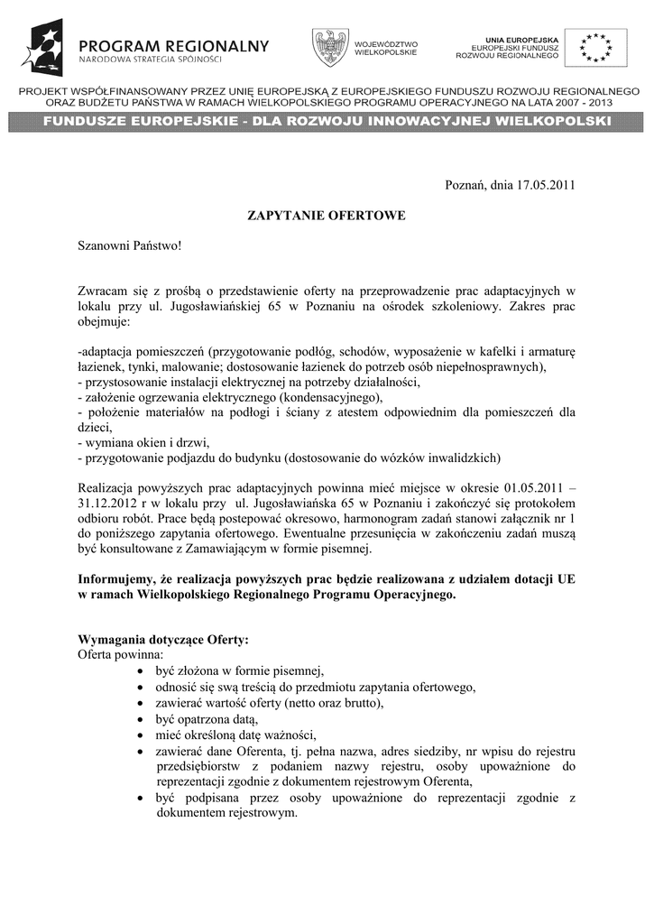 Poznań, dnia 17.05.2011 ZAPYTANIE OFERTOWE Szanowni Państwo! Zwracam się z prośbą o przedstawienie oferty na przeprowadzenie prac adaptacyjnych w lokalu przy ul. Jugosławiańskiej 65 w Poznaniu na ośrodek szkoleniowy. Zakres prac obejmuje: -adaptacja pomieszczeń (przygotowanie podłóg, schodów, wyposażenie w kafelki i armaturę łazienek, tynki, malowanie; dostosowanie łazienek do potrzeb osób niepełnosprawnych), - przystosowanie instalacji elektrycznej na potrzeby działalności, - założenie ogrzewania elektrycznego (kondensacyjnego), - położenie materiałów na podłogi i ściany z atestem odpowiednim dla pomieszczeń dla dzieci, - wymiana okien i drzwi, - przygotowanie podjazdu do budynku (dostosowanie do wózków inwalidzkich) Realizacja powyższych prac adaptacyjnych powinna mieć miejsce w okresie 01.05.2011 – 31.12.2012 r w lokalu przy ul. Jugosławiańska 65 w Poznaniu i zakończyć się protokołem odbioru robót. Prace będą postepować okresowo, harmonogram zadań stanowi załącznik nr 1 do poniższego zapytania ofertowego. Ewentualne przesunięcia w zakończeniu zadań muszą być konsultowane z Zamawiającym w formie pisemnej. Informujemy, że realizacja powyższych prac będzie realizowana z udziałem dotacji UE w ramach Wielkopolskiego Regionalnego Programu Operacyjnego. Wymagania dotyczące Oferty: Oferta powinna: być złożona w formie pisemnej, odnosić się swą treścią do przedmiotu zapytania ofertowego, zawierać wartość oferty (netto oraz brutto), być opatrzona datą, mieć określoną datę ważności, zawierać dane Oferenta, tj. pełna nazwa, adres siedziby, nr wpisu do rejestru przedsiębiorstw z podaniem nazwy rejestru, osoby upoważnione do reprezentacji zgodnie z dokumentem rejestrowym Oferenta, być podpisana przez osoby upoważnione do reprezentacji zgodnie z dokumentem rejestrowym. Miejsce składania ofert: LOGOS Karolina Dobska, Słoneczna 5 A, Poznań oraz drogą mailową pod adres [email protected]. Wybór najkorzystniejszej oferty nastąpi w oparciu o następujące kryteria: - cena 80% - doświadczenie wykonawcy 20% Termin składania ofert 01.06.2011 r. Okres ważności oferty: 30 dni licząc od daty upłynięcia terminu składania ofert. PYTANIA, ODPOWIEDZI, UDZIELANE WYJAŚNIEŃ Osoby upoważnione do kontaktów z Oferentami: Karolina Dobska LOGOS Tel.695 712 469 Załącznik nr 1 do Zapytania ofertowego z dnia 17.05.2011 Harmonogram zadań: -adaptacja pomieszczeń (przygotowanie podłóg, schodów, wyposażenie w kafelki i armaturę łazienek, tynki, malowanie) – termin realizacji do dnia:30.06.2011 - przystosowanie instalacji elektrycznej na potrzeby działalności - termin realizacji do dnia:31.08.2011 - założenie ogrzewania elektrycznego (kondensacyjnego) - termin realizacji do dnia: 30.11.2011 - położenie materiałów na podłogi i ściany z atestem odpowiednim dla pomieszczeń dla dzieci- termin realizacji do dnia: 31.03.2012 - wymiana okien i drzwi termin realizacji do dnia:31.07.2012 - przygotowanie podjazdu do budynku (dostosowanie do wózków inwalidzkich; dostosowanie łazienek do potrzeb osób niepełnosprawnych) - termin realizacji do dnia:31.10.2012.