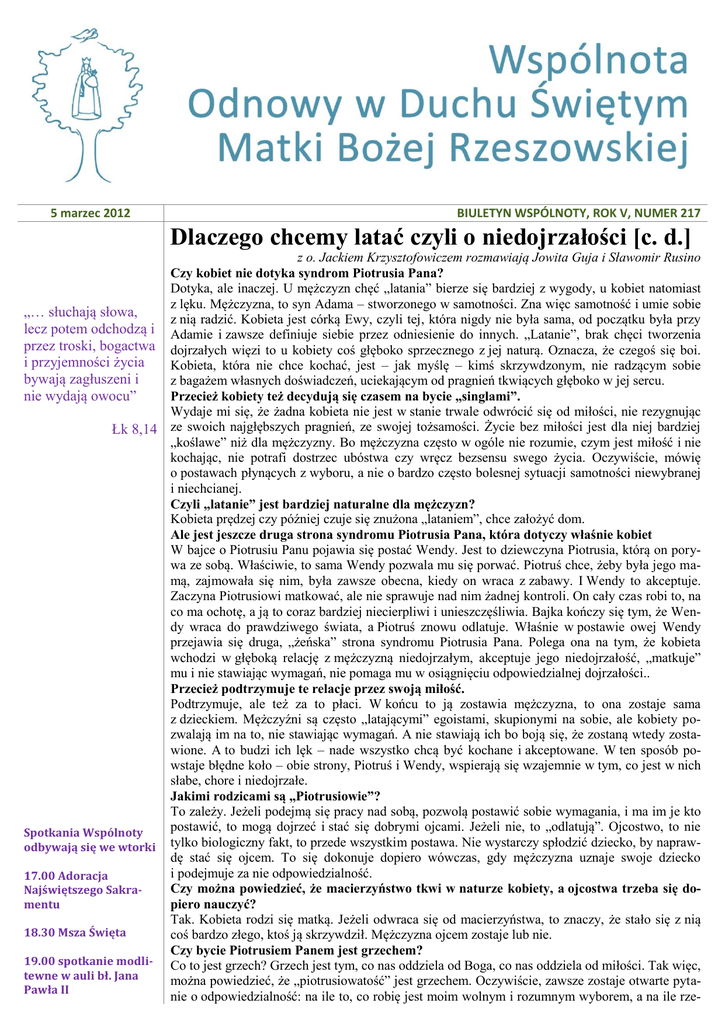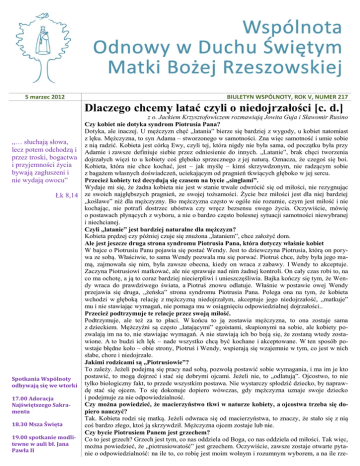 5 marzec 2012 BIULETYN WSPÓLNOTY, ROK V, NUMER 217 Dlaczego chcemy latać czyli o niedojrzałości [c. d.] z o. Jackiem Krzysztofowiczem rozmawiają Jowita Guja i Sławomir Rusino Czy kobiet nie dotyka syndrom Piotrusia Pana? Dotyka, ale inaczej. U mężczyzn chęć „latania” bierze się bardziej z wygody, u kobiet natomiast z lęku. Mężczyzna, to syn Adama – stworzonego w samotności. Zna więc samotność i umie sobie „… słuchają słowa, z nią radzić. Kobieta jest córką Ewy, czyli tej, która nigdy nie była sama, od początku była przy lecz potem odchodzą i Adamie i zawsze definiuje siebie przez odniesienie do innych. „Latanie”, brak chęci tworzenia przez troski, bogactwa dojrzałych więzi to u kobiety coś głęboko sprzecznego z jej naturą. Oznacza, że czegoś się boi. i przyjemności życia Kobieta, która nie chce kochać, jest – jak myślę – kimś skrzywdzonym, nie radzącym sobie bywają zagłuszeni i z bagażem własnych doświadczeń, uciekającym od pragnień tkwiących głęboko w jej sercu. nie wydają owocu” Przecież kobiety też decydują się czasem na bycie „singlami”. Wydaje mi się, że żadna kobieta nie jest w stanie trwale odwrócić się od miłości, nie rezygnując Łk 8,14 ze swoich najgłębszych pragnień, ze swojej tożsamości. Życie bez miłości jest dla niej bardziej „koślawe” niż dla mężczyzny. Bo mężczyzna często w ogóle nie rozumie, czym jest miłość i nie kochając, nie potrafi dostrzec ubóstwa czy wręcz bezsensu swego życia. Oczywiście, mówię o postawach płynących z wyboru, a nie o bardzo często bolesnej sytuacji samotności niewybranej i niechcianej. Czyli „latanie” jest bardziej naturalne dla mężczyzn? Kobieta prędzej czy później czuje się znużona „lataniem”, chce założyć dom. Ale jest jeszcze druga strona syndromu Piotrusia Pana, która dotyczy właśnie kobiet W bajce o Piotrusiu Panu pojawia się postać Wendy. Jest to dziewczyna Piotrusia, którą on porywa ze sobą. Właściwie, to sama Wendy pozwala mu się porwać. Piotruś chce, żeby była jego mamą, zajmowała się nim, była zawsze obecna, kiedy on wraca z zabawy. I Wendy to akceptuje. Zaczyna Piotrusiowi matkować, ale nie sprawuje nad nim żadnej kontroli. On cały czas robi to, na co ma ochotę, a ją to coraz bardziej niecierpliwi i unieszczęśliwia. Bajka kończy się tym, że Wendy wraca do prawdziwego świata, a Piotruś znowu odlatuje. Właśnie w postawie owej Wendy przejawia się druga, „żeńska” strona syndromu Piotrusia Pana. Polega ona na tym, że kobieta wchodzi w głęboką relację z mężczyzną niedojrzałym, akceptuje jego niedojrzałość, „matkuje” mu i nie stawiając wymagań, nie pomaga mu w osiągnięciu odpowiedzialnej dojrzałości.. Przecież podtrzymuje te relacje przez swoją miłość. Podtrzymuje, ale też za to płaci. W końcu to ją zostawia mężczyzna, to ona zostaje sama z dzieckiem. Mężczyźni są często „latającymi” egoistami, skupionymi na sobie, ale kobiety pozwalają im na to, nie stawiając wymagań. A nie stawiają ich bo boją się, że zostaną wtedy zostawione. A to budzi ich lęk – nade wszystko chcą być kochane i akceptowane. W ten sposób powstaje błędne koło – obie strony, Piotruś i Wendy, wspierają się wzajemnie w tym, co jest w nich słabe, chore i niedojrzałe. Jakimi rodzicami są „Piotrusiowie”? To zależy. Jeżeli podejmą się pracy nad sobą, pozwolą postawić sobie wymagania, i ma im je kto postawić, to mogą dojrzeć i stać się dobrymi ojcami. Jeżeli nie, to „odlatują”. Ojcostwo, to nie Spotkania Wspólnoty odbywają się we wtorki tylko biologiczny fakt, to przede wszystkim postawa. Nie wystarczy spłodzić dziecko, by naprawdę stać się ojcem. To się dokonuje dopiero wówczas, gdy mężczyzna uznaje swoje dziecko i podejmuje za nie odpowiedzialność. 17.00 Adoracja Czy można powiedzieć, że macierzyństwo tkwi w naturze kobiety, a ojcostwa trzeba się doNajświętszego Sakramentu piero nauczyć? Tak. Kobieta rodzi się matką. Jeżeli odwraca się od macierzyństwa, to znaczy, że stało się z nią 18.30 Msza Święta coś bardzo złego, ktoś ją skrzywdził. Mężczyzna ojcem zostaje lub nie. Czy bycie Piotrusiem Panem jest grzechem? 19.00 spotkanie modli- Co to jest grzech? Grzech jest tym, co nas oddziela od Boga, co nas oddziela od miłości. Tak więc, tewne w auli bł. Jana można powiedzieć, że „piotrusiowatość” jest grzechem. Oczywiście, zawsze zostaje otwarte pytaPawła II nie o odpowiedzialność: na ile to, co robię jest moim wolnym i rozumnym wyborem, a na ile rze- Odpowiedzialni za Wspólnotę o. Wiktor Tokarski OFM pasterz tel. 17.853.34.95 w. 125 Barbara K. lider Wiesława M. v-ce lider Jacek F. v-ce lider czywistością, z której nie zdaję sobie sprawy lub wobec której pozostaję zupełnie bezradny. A czy nie jest to bardziej nieszczęście? Czy mężczyzna jest szczęśliwy jako Piotruś? Czy egoizm i egocentryzm unieszczęśliwiają? Chyba przede wszystkim dotykają wszystkich wokół – tym mocniej im bardziej jest się od takiej osoby zależnym. Piotruś Pan, subiektywnie, niekoniecznie musi być nieszczęśliwy. Nie wie, że może być inaczej, bardziej, głębiej... Nie czuje tego w sobie. Natomiast na pewno żyje życiem ograniczonym. Nie jest dla niego dostępne, to, co stanowi o prawdziwej pełni i „smaku” życia. Na ogół też prędzej czy później odkrywa, jak bardzo jego życie jest samotne i puste. Często wówczas jest już jednak za późno. Słowo Boże do medytacji Animatorzy Diakonii Barbara K. diakonia adoracyjna Marta F. diakonia prorocka Jacek F. diakonia modlitwy wstawienniczej i uwolnienia Agnieszka R. diakonia nauczania Jolanta S. diakonia uwielbienia Barbara S. diakonia miłosierdzia Anna O. diakonia wprowadzająca dla kobiet Paweł K. diakonia wprowadzająca dla mężczyzn Wiesława M. diakonia organizacyjna Daniel Ch. diakonia p