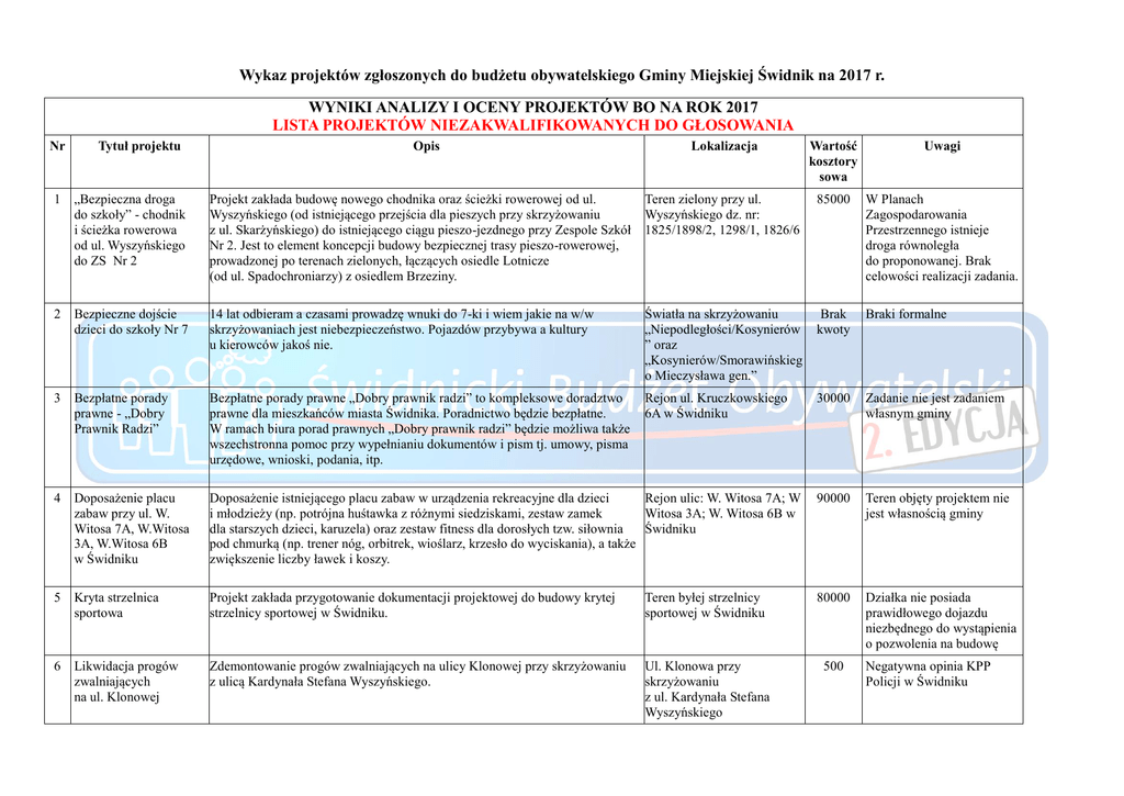 Wykaz projektów zgłoszonych do budżetu obywatelskiego Gminy Miejskiej Świdnik na 2017 r. WYNIKI ANALIZY I OCENY PROJEKTÓW BO NA ROK 2017 LISTA PROJEKTÓW NIEZAKWALIFIKOWANYCH DO GŁOSOWANIA Nr Tytuł projektu Opis Lokalizacja Wartość kosztory sowa Uwagi 1 „Bezpieczna droga do szkoły” - chodnik i ścieżka rowerowa od ul. Wyszyńskiego do ZS Nr 2 Projekt zakłada budowę nowego chodnika oraz ścieżki rowerowej od ul. Wyszyńskiego (od istniejącego przejścia dla pieszych przy skrzyżowaniu z ul. Skarżyńskiego) do istniejącego ciągu pieszo-jezdnego przy Zespole Szkół Nr 2. Jest to element koncepcji budowy bezpiecznej trasy pieszo-rowerowej, prowadzonej po terenach zielonych, łączących osiedle Lotnicze (od ul. Spadochroniarzy) z osiedlem Brzeziny. Teren zielony przy ul. Wyszyńskiego dz. nr: 1825/1898/2, 1298/1, 1826/6 85000 W Planach Zagospodarowania Przestrzennego istnieje droga równoległa do proponowanej. Brak celowości realizacji zadania. 2 Bezpieczne dojście dzieci do szkoły Nr 7 14 lat odbieram a czasami prowadzę wnuki do 7-ki i wiem jakie na w/w skrzyżowaniach jest niebezpieczeństwo. Pojazdów przybywa a kultury u kierowców jakoś nie. Światła na skrzyżowaniu „Niepodległości/Kosynierów ” oraz „Kosynierów/Smorawińskieg o Mieczysława gen.” Brak kwoty Braki formalne 3 Bezpłatne porady prawne - „Dobry Prawnik Radzi” Bezpłatne porady prawne „Dobry prawnik radzi” to kompleksowe doradztwo prawne dla mieszkańców miasta Świdnika. Poradnictwo będzie bezpłatne. W ramach biura porad prawnych „Dobry prawnik radzi” będzie możliwa także wszechstronna pomoc przy wypełnianiu dokumentów i pism tj. umowy, pisma urzędowe, wnioski, podania, itp. Rejon ul. Kruczkowskiego 6A w Świdniku 30000 Zadanie nie jest zadaniem własnym gminy 4 Doposażenie placu zabaw przy ul. W. Witosa 7A, W.Witosa 3A, W.Witosa 6B w Świdniku Doposażenie istniejącego placu zabaw w urządzenia rekreacyjne dla dzieci Rejon ulic: W. Witosa 7A; W i młodzieży (np. potrójna huśtawka z różnymi siedziskami, zestaw zamek Witosa 3A; W. Witosa 6B w dla starszych dzieci, karuzela) oraz zestaw fitness dla dorosłych tzw. siłownia Świdniku pod chmurką (np. trener nóg, orbitrek, wioślarz, krzesło do wyciskania), a także zwiększenie liczby ławek i koszy. 90000 Teren objęty projektem nie jest własnością gminy 5 Kryta strzelnica sportowa Projekt zakłada przygotowanie dokumentacji projektowej do budowy krytej strzelnicy sportowej w Świdniku. Teren byłej strzelnicy sportowej w Świdniku 80000 Działka nie posiada prawidłowego dojazdu niezbędnego do wystąpienia o pozwolenia na budowę 6 Likwidacja progów zwalniających na ul. Klonowej Zdemontowanie progów zwalniających na ulicy Klonowej przy skrzyżowaniu z ulicą Kardynała Stefana Wyszyńskiego. Ul. Klonowa przy skrzyżowaniu z ul. Kardynała Stefana Wyszyńskiego 500 Negatywna opinia KPP Policji w Świdniku 7 „Ławeczka dla juniora - Montaż 50 ławek oraz koszy wzdłuż chodników przy ulicach: Armii Krajowej, Miasto Świdnik ławeczka dla seniora” Kosynierów, Kusocińskiego, Racławickiej, Wyszyńskiego (w stronę cmentarza komunalnego) jako ułatwienie podczas spacerów wszystkim osobom – seniorom, niepełnosprawnym czy matkom z dziećmi. 8 Miejsca postojowe dla rowerów. Budowa wiaty rowerowej wraz ze stojakami rowerowymi przy targowisku miejskim Projekt zakłada zakup i montaż osłoniętej wiaty rowerowej na 20 rowerów wraz ze stojakami rowerowymi U-kształtnymi z poprzeczką ułatwiającą przypinanie rowerów za ramę. Umożliwi to mieszkańcom Świdnika bezpieczne pozostawianie swoich rowerów podczas robienia zakupów na targowisku miejskim. 9 Modernizacja targowiska w Świdniku. Stworzenie wizualizacji oraz opracowanie dokumentacji projektowej przebudowy 52000 Proponowane lokalizacje nie znajdują się na terenie należącym do gminy 30000 Zadanie ujęte w planach inwestycyjnych gminy Celem inicjatywy jest realizacja pierwszego etapu kompleksowej modernizacji Targowisko Miejskie targowiska miejskiego w Świdniku. Przedmiotem opracowania jest projekt budowlany przebudowy targowiska oraz jego cyfrowa wizualizacja. Przedstawione w nim rozwiązania mają podkreślić charakter tego miejsca przedstawiony w nowoczesny sposób zgodny z obecnymi trendami i kierunkami współczesnej architektury. 40000 Zadanie ujęte w budżecie gminy 10 Nowe miejsca parkingowe przy ul. Skarżyńskiego Projekt zakłada budowę ok 28 szt. nowych miejsc parkingowych w obszarze pasa drogowego ul. Skarżyńskiego (odc. od ulicy Wyszyńskiego). Pas drogowy ul. Skarżyńskiego ( dz. nr 1873/1, 1875/1) 77000 Koszt realizacji projektu przekracza maksymalną wartość wniosku do BO 11 Sterylizacja kotów i psów właścicielskich oraz czipowanie psów właścicielskich z terenu Gminy Świdnik Projekt przewiduje wykonanie około 200 zabiegów sterylizacji kotów (kotek) i 200 zabiegów sterylizacji psów (suczek) właścicielskich z terenu Gminy Świdnik oraz zachipowanie około 200 psów posiadających właściciela. Bezpośrednimi realizatorami projektu będą wytypowane przez nas lecznice weterynaryjne, które wykonują zabiegi sterylizacji. Ceny zabiegów zostaną uzgodnione na tym samym poziomie w każdej z wybranych lecznic. Gmina Świdnik 100000 Zadanie nie jest zadaniem własnym gminy 12 Wykonanie dokumentacji projektowej budowy ul. Widokowej i ul. Barwnej w Świdniku Celem przedsięwzięcia jest sporządzenie kompletnej dokumentacji projektowej budowy ul. Widokowej i ul. Barwnej, niezbędnej do wykonywania prac budowlanych, obejmujących zmianę nawierzchni ulic z gruntowo-żwirowej na nawierzchnię utwardzoną. Planowany układ ulic: Widokowa – ciąg pieszojezdny o szer. 5,5m, Barwna - jezdnia o szer. 5,5m z jednostronnym chodnikiem o szer. 2,0 m. Świdnik ul. Widokowa całość 98000 (600mb) i ul. Barwna – odcinek od ul. Widokowej do ul. Wiejskiej (210mb) Targowisko Miejskie; przy zachodniej stroni