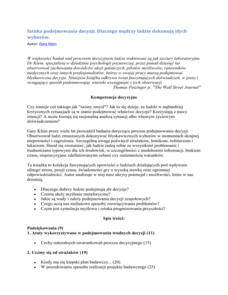 Sztuka podejmowania decyzji. Dlaczego mądrzy ludzie dokonują złych wyborów. Autor: Gary Klein W większości badań nad procesem decyzyjnym ludzie traktowani są jak szczury laboratoryjne. Dr Klein, specjalista w dziedzinie psychologii poznawczej, przez ponad dziesięć lat obserwował zachowania dowódców akcji gaśniczych, pilotów myśliwców, ratowników medycznych oraz innych profesjonalistów, którzy w swojej pracy muszą podejmować błyskawiczne decyzje. Niniejsza książka odkrywa świat fascynujących doświadczeń, w jasny i wciągający sposób podsumowując wnioski wyciągnięte z tych obserwacji Thomas Petzinger jr, "The Wall Street Journal" Kompetencje decyzyjne Czy istnieje coś takiego jak "szósty zmysł"? Jak to się dzieje, że ludzie w najbardziej krytycznych sytuacjach są w stanie podejmować właściwe decyzje? Korzystają z mocy intuicji? A może kierują się racjonalną analizą sytuacji albo własnym życiowym doświadczeniem? Gary Klein przez wiele lat prowadził badania dotyczące procesu podejmowania decyzji. Obserwował ludzi zmuszonych dokonywać błyskawicznych wyborów w momentach skrajnej niepewności i zagrożenia. Szczególną uwagę poświęcił strażakom, lotnikom, żołnierzom i lekarzom. Starał się zrozumieć, jak ludzie radzą sobie ze wszystkimi problemami i trudnościami typowymi dla ich środowisk, w szczególności z niedoborem informacji, brakiem czasu, nieprecyzyjnie zdefiniowanymi celami czy zmiennością warunków. Ta książka to kolekcja fascynujących opowieści o ludziach działających pod wpływem silnego stresu, presji czasu, świadomości gry o wysoką stawkę oraz ogromnej odpowiedzialności. Autor analizuje w niej nasz ukryty potencjał i możliwości, które w nas drzemią. Dlaczego dobrzy ludzie podejmują złe decyzje? Czemu służy myślenie metaforyczne? Jakie są wady i zalety podejmowania decyzji zespołowych? Czego uczą nas nieliniowe sposoby rozwiązywania problemów? Czym jest symulacja myślowa i sztuka prognozowania przyszłości? Spis treści: Podziękowania (9) 1. Atuty wykorzystywane w podejmowaniu trudnych decyzji (11) Cechy naturalnych uwarunkowań procesu decyzyjnego (15) 2. Uczmy się od strażaków (19) Kiedy ma się kiepski plan badawczy... (20) W poszukiwaniu sposobu realizacji projektu badawczego (25) 3. Model podejmowania decyzji na podstawie rozpoznania (29) Słuchanie danych (31) Porównywanie kategorii (39) Definiowanie modelu podejmowania decyzji na podstawie rozpoznania (39) Teoretyczne znaczenie modelu RPD (44) 4. Intuicja (49) Zakażone dzieci (59) Koszty związane z prowadzeniem badań w terenie (60) 5. Symulacja myślowa (65) Polska gospodarka (74) Modele symulacji myślowej (78) Wyjaśnianie sytuacji (79) Prognozowanie przyszłości (82) Symulacje myślowe czasami zawodzą (85) 6. Strzały z USS Vincennes (95) Strzały z USS Vincennes - chronologia zdarzeń (96) Wydarzenia wcześniejsze (98) 7. Symulacja myślowa a podejmowanie decyzji (109) Symulacja myślowa a model RPD (109) Przewidywania (112) Sposób działania (112) Testy modelu RPD w różnych dziedzinach (117) 8. Dostrzeganie punktów dźwigni (133) 9. Nieliniowe aspekty rozwiązywania problemów (143) Tradycyjne modele rozwiązywania problemów (150) Modele etapowe (151) Model sztucznej inteligencji (154) Misja Apollo 13 - studium przypadku w zakresie rozwiązywania problemów (159) Rozwiązywanie problemów a podejmowanie decyzji (166) 10. Zobaczyć to, co niedostrzegalne (173) Prawidłowości (176) Anomalie (177) Całościowy obraz, czyli orientacja w sytuacji (179) Mechanizmy funkcjonowania (180) Okazje i improwizacja (181) Przeszłość i przyszłość (182) Drobne różnice (186) Własne ograniczenia (186) Doświadczenie a podejmowanie decyzji (190) 11. Opowiadania (207) Cechy dobrego opowiadania (211) Posługiwanie się opowiadaniami w celu zrozumienia istoty wydarzeń (214) 12. Analogie i metafory (229) Logika myślenia metaforycznego (230) Logika myślenia analogicznego (233) 13. Czytanie w myślach (249) Zamiar (256) 14. Umysł zespołowy (267) Koncepcja umysłu zespołowego (267) Funkcje umysłu zespołowego (270) Jak rozwija się umysł zespołowy (271) Zespołowe podejmowanie decyzji (275) Chaotyczna natura umysłu zespołowego (284) Umysł zespołowy jako metafora myślenia (288) 15. Racjonalna analiza i problem hiperracjonalizmu (293) Znaczenie analizy racjonalnej (294) Istota racjonalnego myślenia (296) Ograniczenia logicznego myślenia (297) Chochlik (300) 16. Dlaczego dobrzy ludzie podejmują złe decyzje? (307) Czy złe decyzje są skutkiem błędów poznawczych? (307) Skąd biorą się błędy w sytuacjach naturalnych? (310) Wpływ stresu na podejmowanie decyzji (313) Problem niepewności (314) Doświadczenie a przesądy (318) 17. Podsumowanie (323) Twierdzenia zebrane (325) Łączenie kompetencji (326) Czy można to nazwać nauką? (328) Uwagi i spostrzeżenia końcowe (330) Bibliografia (333)