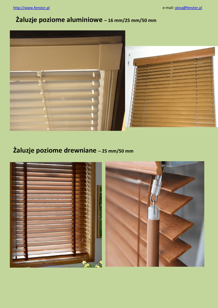 http://www.fenster.pl Żaluzje poziome aluminiowe – 16 mm/25 mm/50 mm Żaluzje poziome drewniane – 25 mm/50 mm e-mail: [email protected] http://www.fenster.pl Żauzje pionowe (verticale) - sterowanie ręczne Żaluzje pionowe (verticale) - sterowanie elektryczne (24V) e-mail: [email protected]