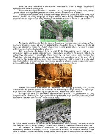 Mam na imię Dominika i chciałabym opowiedzieć Wam o mojej trzydniowej wycieczce w Góry Świętokrzyskie. Wyjechaliśmy w poniedziałek 17 czerwca 2013r, około godziny ósmej spod szkoły. Oprócz naszej klasy jechały jeszcze dwie inne. Podróż trwała około 4 godzin. Pierwszym miejscem jakie zobaczyliśmy tego dnia była Skarżysko-Kamienna, czyli polskie „Wilno”, w której znajduje się kopia obrazu Matki Bożej Ostrobramskiej. Dalej pojechaliśmy do Zagdańska, żeby zobaczyć najstarsze drzewo w Polsce – Dąb Bartek. Następnie udaliśmy się do internatu w Chęcinach, miejsca naszych noclegów. Tam zjedliśmy smaczny obiad, po którym pojechaliśmy do Jaskini Raj. Jej nazwa pochodzi od pewnego zdarzenia, kiedy to dwóch studentów weszło przez otwór w skale i widząc jaskinię powiedzieli: „O raju, ale tu pięknie”. Gdy weszliśmy do jaskini było w niej 8o C. Przewodnik, który nas po niej oprowadzał ostrzegał przed nietoperzami i jadowitymi pająkami. W jaskini widzieliśmy stalagmity, stalagnaty i stalaktyty które tworzyły się tam przez setki tysięcy lat. Widzieliśmy również obumarłą rafę koralową, która jest dowodem na to, że kiedyś było tam morze. Pan przewodnik pokazał nam różne przedmioty, które utworzyła woda, czyli nacieki, kształtem przypominające np. sfinksa, pączka z lukrem, owcę ze spadochronem, świętego Mikołaja, kobietę, która moczy nogi, pana z okularami i inne. Potem wróciliśmy autokarem do internatu. Na kolację poszliśmy do „Pizzerii u Dominika”. Po posiłku powrót do internatu na wieczorną toaletę i nocleg. Po kąpieli ja i moje koleżanki rozmawiałyśmy o jutrzejszym dniu, dopóki nie zmógł nas sen. Następnego dnia po śniadaniu spakowaliśmy plecaki i wyjechaliśmy w Góry Świętokrzyskie. Wchodząc na Łysicę widzieliśmy gołoborza, czyli rumowiska skalne, które powstały na skutek zamarzania i rozmarzania wody. Na trasie naszej wspinaczki było muzeum interaktywne. Zobaczyliśmy tam mieszkańców Gór Świętokrzyskich, etapy rozwoju fauny i flory, amonity oraz wiele ciekawych wystaw. Po wyjściu z muzeum weszliśmy do Klasztoru Benedyktyńskiego, gdzie widzieliśmy relikwie Świętego Krzyża i najtwardsze drzewo na świecie –heban, które tonie w wodzie. Potem zeszliśmy drogą, którą kiedyś pątnicy pokonywali na kolanach. U podnóża góry znajduje się kamienny pielgrzym, któremu według legendy wydawało się, że szybko i bez trudu przejdzie tę drogę. Jednak został zamieniony w kamień i nigdy nie dojdzie do celu. Po górskiej wędrówce udaliśmy się do parku linowego w Krajno Zagórze. Tylko dwadzieścia z pięćdziesięciu osób miało odwagę zmierzyć się z wyzwaniem. Kiedy wszyscy chętni byli gotowi do wyjścia na tor, rozpętała się burza. Postanowiliśmy przeczekać ją w restauracji. W czasie burzy padał grad wielkości piłeczek pingpongowych. Po powrocie do internatu wspólnie przyrządziliśmy kolację w formie szwedzkiego stołu i urządziliśmy klasową imprezę. Trzeciego dnia 7.15 znieśliśmy swoje bagaże do autokaru. O godzinie ósmej, po pysznym śniadaniu, wyruszyliśmy do Kielc, gdzie widzieliśmy Rezerwat Przyrody Kadzielnia z pięciopoziomowymi jaskiniami. Potem pojechaliśmy obejrzeć Katedrę Wniebowzięcia Najświętszej Marii Panny. Następnie szliśmy słynną ulicą Sienkiewicza. Następnie udaliśmy się do Bałtowa do Jura Parku i oceanarium. Tam oglądaliśmy dinozaury. Po trzech dniach pełnych wrażeń wyruszyliśmy w drogę powrotną. Jestem bardzo zadowolona z tej wycieczki i nie mogę doczekać się następnej.