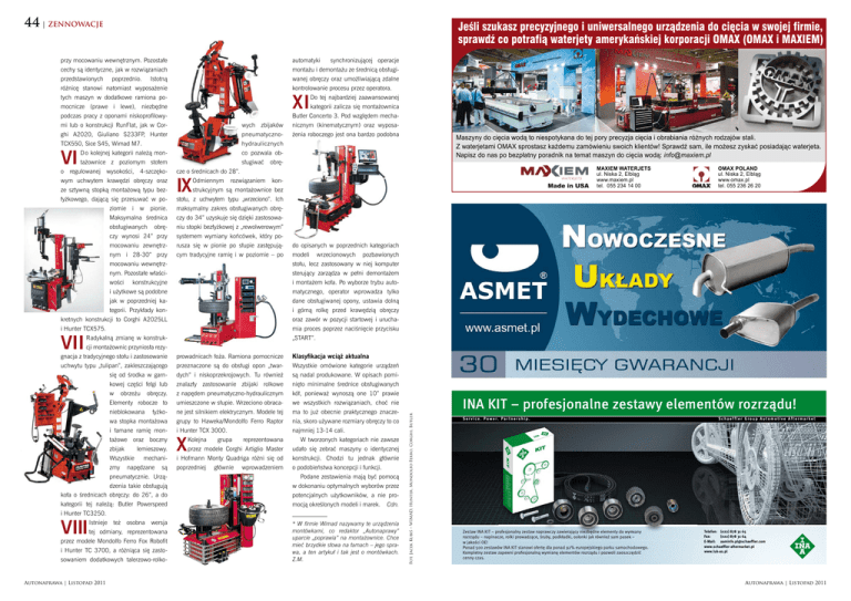 44 | ZENNOWACJE Jeśli szukasz precyzyjnego i uniwersalnego urządzenia do cięcia w swojej firmie, sprawdź co potrafią waterjety amerykańskiej korporacji OMAX (OMAX i MAXIEM) przy mocowaniu wewnętrznym. Pozostałe automatyki cechy są identyczne, jak w rozwiązaniach montażu i demontażu ze średnicą obsługi- przedstawionych wanej obręczy oraz umożliwiającą zdalne poprzednio. Istotną synchronizującej operacje kontrolowanie procesu przez operatora. różnicę stanowi natomiast wyposażenie XI tych maszyn w dodatkowe ramiona pomocnicze (prawe i lewe), niezbędne Do tej najbardziej zaawansowanej kategorii zalicza się montażownica Butler Concerto 3. Pod względem mecha- podczas pracy z oponami niskoprofilowymi lub o konstrukcji RunFlat, jak w Cor- wych zbijaków nicznym (kinematycznym) oraz wyposa- ghi A2020, Giuliano S233FP, Hunter pneumatyczno- żenia roboczego jest ona bardzo podobna TCX550, Sice S45, Wimad M7. hydraulicznych D o kolejnej kategorii należą mon- co pozwala ob- tażownice z poziomym stołem o regulowanej wysokości, 4-szczękowym uchwytem krawędzi obręczy oraz ze sztywną stopką montażową typu bezłyżkowego, dającą się przesuwać w poziomie sługiwać obrę- rozwiązaniem kon- MAXIEM WATERJETS ul. Niska 2, Elbląg www.maxiem.pl tel. 055 234 14 00 cze o średnicach do 28”. IX Odmiennym strukcyjnym są montażownice bez maksymalny zakres obsługiwanych obrę- Maksymalna średnica czy do 34” uzyskuje się dzięki zastosowa- obsługiwanych obrę- niu stopki bezłyżkowej z „rewolwerowym” czy wynosi 24” przy systemem wymiany końcówek, który po- mocowaniu zewnętrz- rusza się w pionie po słupie zastępują- do opisanych w poprzednich kategoriach nym i 28-30” przy cym tradycyjne ramię i w poziomie – po modeli wrzecionowych pozbawionych mocowaniu wewnętrz- stołu, lecz zastosowany w niej komputer nym. Pozostałe właści- sterujący zarządza w pełni demontażem wości konstrukcyjne i montażem koła. Po wyborze trybu auto i użytkowe są podobne matycznego, operator wprowadza tylko jak w poprzedniej ka- dane obsługiwanej opony, ustawia dolną tegorii. Przykłady kon- i górną rolkę przed krawędzią obręczy kretnych konstrukcji to Corghi A2025LL oraz zawór w pozycji startowej i urucha- i Hunter TCX575. mia proces poprzez naciśnięcie przycisku VII OMAX POLAND ul. Niska 2, Elbląg www.omax.pl tel. 055 236 26 20 stołu, z uchwytem typu „wrzeciono”. Ich i w pionie. Radykalną zmianę w konstruk- „START”. cji montażownic przyniosła rezy- gnacja z tradycyjnego stołu i zastosowanie prowadnicach łoża. Ramiona pomocnicze Klasyfikacja wciąż aktualna uchwytu typu „tulipan”, zakleszczającego przeznaczone są do obsługi opon „twar- Wszystkie omówione kategorie urządzeń się od środka w garn- dych” i niskoprzekrojowych. Tu również są nadal produkowane. W opisach pomi- kowej części felgi lub znalazły zastosowanie zbijaki rolkowe nięto minimalne średnice obsługiwanych w obrzeżu obręczy. z napędem pneumatyczno-hydraulicznym kół, ponieważ wynoszą one 10” prawie Elementy robocze to umieszczone w słupie. Wrzeciono obraca- we wszystkich rozwiązaniach, choć nie nieblokowana łyżko- ne jest silnikiem elektrycznym. Modele tej ma to już obecnie praktycznego znacze- wa stopka montażowa grupy to Haweka/Mondolfo Ferro Raptor nia, skoro używane rozmiary obręczy to co i łamane ramię mon- i Hunter TCX 3000. najmniej 13-14 cali. tażowe oraz boczny zbijak lemieszowy. Wszystkie zmy mechani- napędzane są X Kolejna grupa reprezentowana W tworzonych kategoriach nie zawsze przez modele Corghi Artiglio Master udało się zebrać maszyny o identycznej i Hofmann Monty Quadriga różni się od konstrukcji. Chodzi tu jednak głównie poprzedniej o podobieństwa koncepcji i funkcji. głównie wprowadzeniem pneumatycznie. Urzą- Podane zestawienia mają być pomocą dzenia takie obsługują w dokonaniu optymalnych wyborów przez koła o średnicach obręczy: do 26”, a do potencjalnych użytkowników, a nie pro- kategorii tej należą: Butler Powerspeed mocją określonych modeli i marek. Cdn. i Hunter TC3250. VIII Istnieje też osobna wersja tej odmiany, reprezentowana przez modele Mondolfo Ferro Fox Robofit i Hunter TC 3700, a różniąca się zastosowaniem dodatkowych talerzowo-rolko- * W firmie Wimad nazywamy te urządzenia montówkami, co redaktor „Autonaprawy” uparcie „poprawia” na montażownice. Chce mieć brzydkie słowa na łamach – jego sprawa, a ten artykuł i tak jest o montówkach. Z.M. Fot. Jacek Kubiś – WIMAD, Hunter, Mondolfo Ferro, Corghi, Butler VI Maszyny do cięcia wodą to niespotykana do tej pory precyzja cięcia i obrabiania różnych rodzajów stali. Z waterjetami OMAX sprostasz każdemu zamówieniu swoich klientów! Sprawdź sam, ile możesz zyskać posiadając waterjeta. Napisz do nas po bezpłatny poradnik na temat maszyn do cięcia wodą: [email protected] INA KIT – profesjonalne zestawy elementów rozrządu! Service. Power. Partnership. Zestaw INA KIT – profesjonalny rofesjonalny zestaw naprawczy zawierający niezbędne elementy do wymia wymiany miany rozrządu – napinacze, cze, rolki prowadzące, śruby, podkładki, osłonki jak również sam pasek k– w jakości OE! Ponad 500 zestawów INA KIT stanowi ofertę dla ponad 92% europejskiego parku samochodowego. Kompletny zestaw zapewni profesjonalną wymianę elementów rozrządu i pozwoli zaoszczędzić cenny czas. 186x86_INA KIT_2010_auto_PL_green_gray.indd 1 Autonaprawa | Listopad 2011 Schaeffler Group Automotive Aftermarket Telefon: (022) 878 31 65 Fax: (022) 878 31 64 E-Mail: [email protected] www.schaeffler-aftermarket.pl www.luk-as.pl 10.2.2011 15:49:40 Autonaprawa | Listopad 2011