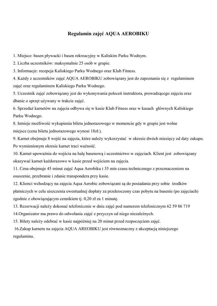 Regulamin zajęć AQUA AEROBIKU 1. Miejsce: basen pływacki i basen rekreacyjny w Kaliskim Parku Wodnym. 2. Liczba uczestników: maksymalnie 25 osób w grupie. 3. Informacje: recepcja Kaliskiego Parku Wodnego oraz Klub Fitness. 4. Każdy z uczestników zajęć AQUA AEROBIKU zobowiązany jest do zapoznania się z regulaminem zajęć oraz regulaminem Kaliskiego Parku Wodnego. 5. Uczestnik zajęć zobowiązany jest do wykonywania poleceń instruktora, prowadzącego zajęcia oraz dbanie o sprzęt używany w trakcie zajęć. 6. Sprzedaż karnetów na zajęcia odbywa się w kasie Klub Fitness oraz w kasach głównych Kaliskiego Parku Wodnego. 8. Istnieje możliwość wykupienia biletu jednorazowego w momencie gdy w grupie jest wolne miejsce (cena biletu jednorazowego wynosi 18zł.). 9. Karnet obejmuje 8 wejść na zajęcia, które należy wykorzystać w okresie dwóch miesięcy od daty zakupu. Po wymienionym okresie karnet traci ważność. 10. Karnet upoważnia do wejścia na halę basenową i uczestnictwo w zajęciach. Klient jest zobowiązany okazywać karnet każdorazowo w kasie przed wejściem na zajęcia. 11. Cena obejmuje 45 minut zajęć Aqua Aerobiku i 35 min czasu technicznego z przeznaczeniem na osuszenie, przebranie i zdanie transpondera przy kasie. 12. Klienci wchodzący na zajęcia Aqua Aerobic zobowiązani są do posiadania przy sobie środków płatniczych w celu uiszczenia ewentualnej dopłaty za przekroczony czas pobytu na basenie (po zajęciach) zgodnie z obowiązującym cennikiem tj. 0,20 zł za 1 minutę. 13. Rezerwacji należy dokonać telefonicznie w dniu zajęć pod numerem telefonicznym 62 59 86 719 14.Organizator ma prawo do odwołania zajęć z przyczyn od niego niezależnych. 15. Bilety należy odebrać w kasie najpóźniej na 20 minut przed rozpoczęciem zajęć. 16.Zakup karnetu na zajęcia AQUA AREOBIKU jest równoznaczny z akceptacją niniejszego regulaminu.