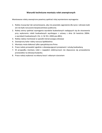 Warunki techniczne montażu rolet zewnętrznych Montowane rolety zewnętrzne powinny spełniać niżej wymienione wymagania: 1. Rolety muszą być tak zamontowane, aby nie powstało zagrożenie dla życia i zdrowia ludzi ani nie było naruszone bezpieczeństwo publiczne; 2. Rolety winny spełniać wymagania wyrobów budowlanych nadających się do stosowania przy wykonaniu robót budowlanych wynikające z ustawy z dnia 16 kwietnia 2004r. o wyrobach budowlanych ( Dz. U. Nr 92 z 2004 poz.881); 3. Rolety należy montować w sposób nienaruszający elewacji 4. Zewnętrzny kolor rolety narzuca Spółdzielnia 5. Montażu może dokonać tylko specjalistyczna firma 6. Prace należy prowadzić zgodnie z obowiązującymi przepisami i sztuką budowlaną 7. W przypadku montażu rolet z napędem elektrycznym nie dopuszcza się prowadzenia przewodów na elewacji budynku. 8. Prace należy wykonać na własny koszt i własnym staraniem
