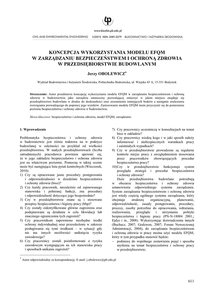 KONCEPCJA WYKORZYSTANIA MODELU EFQM W ZARZĄDZANIU BEZPIECZEŃSTWEM I OCHRONĄ ZDROWIA W PRZEDSIĘBIORSTWIE BUDOWLANYM Jerzy OBOLEWICZ∗ Wydział Budownictwa i Inżynierii Środowiska, Politechnika Białostocka, ul. Wiejska 45 A, 15-351 Białystok Streszczenie: Autor przedstawia koncepcję wykorzystania modelu EFQM w zarządzaniu bezpieczeństwem i ochroną zdrowia w budownictwie jako narzędzia samooceny pozwalającej zmierzyć w jakim miejscu znajduje się przedsiębiorstwo budowlane w drodze do doskonałości oraz zrozumienia istniejących braków a następnie znalezienia rozwiązania prowadzącego do poprawy jego wyników. Zastosowanie modelu EFQM może przyczynić się do poniesienia poziomu bezpieczeństwa i ochrony zdrowia w budownictwie. Słowa kluczowe: bezpieczeństwo i ochrona zdrowia, model EFQM, zarządzanie. 1. Wprowadzenie Problematyka bezpieczeństwa i ochrony zdrowia w budownictwie jest różnie traktowa na w praktyce budowlanej w zależności na przykład od wielkości przedsiębiorstwa. W małych przedsiębiorstwach (liczba zatrudnionych) pracodawca powinien upewnić się, że w jego zakładzie bezpieczeństwo i ochrona zdrowia jest na właściwym poziomie. Pomocną w takiej ocenie może być następująca lista pytań kontrolnych (Wieczorek, 2010): 1) Czy są opracowane jasne procedury postępowania i odpowiedzialności w dziedzinie bezpieczeństwa i ochrony zdrowia (bioz)? 2) Czy każdy pracownik, niezależnie od zajmowanego stanowiska i pełnionej funkcji, zna procedury i odpowiedzialność dotyczące jego bezpośrednio? 3) Czy w przedsiębiorstwie znane są i stosowane przepisy bezpieczeństwa i higieny pracy (bhp)? 4) Czy zostały zidentyfikowane główne zagrożenia oraz podejmowane są działania w celu likwidacji lub znacznego ograniczenia tych zagrożeń? 5) Czy pracownikom zapewniono niezbędne środki ochrony indywidualnej oraz przeszkolenie w zakresie posługiwania się tymi środkami – w sytuacji gdy nie ma innych możliwości uniknięcia ryzyka zawodowego? 6) Czy pracownicy zostali poinformowani o ryzyku zawodowym występującym na ich stanowisku pracy i sposobach unikania zagrożeń? ∗ 7) Czy pracownicy uczestniczą w konsultacjach na temat bioz w zakładzie? 8) Czy pracownicy wiedzą kogo i w jaki sposób należy informować i niebezpiecznych warunkach pracy i zaistniałych wypadkach? 9) Czy w przedsiębiorstwie prowadzone są regularne kontrole miejsc pracy z uwzględnieniem stosowania przez pracowników obowiązujących procedur bezpieczeństwa pracy? 10) Czy w przedsiębiorstwie funkcjonuje system przeglądu strategii i procedur bezpieczeństwa i ochrony zdrowia? Duże przedsiębiorstwa budowlane potrzebują w obszarze bezpieczeństwa i ochrony zdrowia ustanowienia odpowiedniego systemu zarządzania. System zarządzania bezpieczeństwem i ochroną zdrowia jest wtedy częścią ogólnego systemu zarządzania, który obejmuje strukturę organizacyjną, planowanie, odpowiedzialność, zasady postępowania, procedury, procesy, zasoby potrzebne do opracowania, wdrażania, realizowania, przeglądu i utrzymania polityki bezpieczeństwa i higieny pracy (PN-N-18004 2001,; Ejdys i in., 2008). Wykorzystując doświadczenia innych (Buchacz, 2007; Godzwon, 2007; Forum Nowoczesnej Administracji, 2004), do zarządzania bezpieczeństwem i ochroną zdrowia w pracy można użyć modelu EFQM, który w tym przypadku stanowić będzie: − podstawę do wspólnego zestawienia pojęć i sposobu myślenia na temat bezpieczeństwa i ochrony pracy w przedsiębiorstwie; Autor odpowiedzialny za korespondencję. E-mail: [email protected] 611 Civil and Environmental Engineering / Budownictwo i Inżynieria Środowiska 2 (2011) 611-619 − strukturę pozycjonującą istniejące inicjatywy na rzecz bezpieczeństwa i ochrony zdrowia w pracy będącą bazą dla systemu zarządzania bezpieczeństwem i ochroną zdrowia w pracy; − narzędzie samooceny pozwalające mierzyć w jakim miejscu w utrzymaniu bezpieczeństwa i ochrony zdrowia w pracy znajduje się analizowane przedsiębiorstwo budowlane (Buchacz, 2005a; Chomać, 2003). 2) pracownicy – planowanie i doskonalenie zasobów ludzkich, identyfikacja i utrwalanie poziomu wiedzy i kompetencji, angażowanie pracowników, komunikacja, motywacja (Buchacz, 2005i); 3) strategia i planowanie – metody budowy strategii, uwzględnienie przyszłych potrzeb, podejmowanie decyzji na podstawie faktów, wdrażanie ich w organizacji (Buchacz, 2005h); 4) partnerstwo i zasoby – zarządzanie relacjami z dostawcami, zarządzanie finansami, infrastrukturą, technologią, informacjami i wiedzą (Buchacz, 2006a); 5) procesy, produkty i usługi – projektowanie i doskonalenie procesów, projektowanie i wytwarzanie wyrobów w oparciu o potrzeby i oczekiwania klientów, rozwijanie relacji z klientami (Buchacz, 2006b). Obszar WYNIKI (tab. 2) obejmuje cztery kolejne kryteria modelu: 1) wyniki w relacjach z pracownikami – dokonywanie pomiarów skuteczności motywacji zadowolenia klientów, osiągnięć pracowników, zaangażowania; 2) wyniki w relacjach z obywatelami, klientami – stosowanie mierników postrzegania organizacji przez klientów i wskaźników wyników działalności; 3) społeczne wyniki działalności – badanie wizerunku, społeczna odpowiedzialność, zmniejszenie uciążliwości produktów dla otoczenia, kontakty z władzami; 4) kluczowe wyniki działalności – wyniki działalności przedsiębiorstwa w obszarze bezpieczeństwa i ochrony zdrowia w pracy. 2. Model EFQM w zarządzaniu bezpieczeństwem i ochroną zdrowia Europejska Fundacja Zarządzania Jakością (European Foundation for Quality Management) opracowała model EFQM oparty na europejskim podejściu do modelowania doskonałości (Buchacz, 2005b; Krajowa Organizacja Partnerska Umbrella, 2006). Struktura ramowa modelu (rys. 1) złożona jest z dziewięciu elementów. Pięć z nich określa się mianem POTENCJAŁ a cztery mianem WYNIKI. Kryteria POTENCJAŁ-u obejmują d