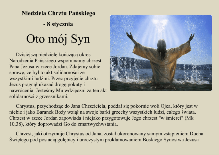 Niedziela Chrztu Pańskiego - 8 stycznia Oto mój Syn Dzisiejszą niedzielę kończącą okres Narodzenia Pańskiego wspominamy chrzest Pana Jezusa w rzece Jordan. Zdajemy sobie sprawę, że był to akt solidarności ze wszystkimi ludźmi. Przez przyjęcie chrztu Jezus pragnął ukazać drogę pokuty i nawrócenia. Jesteśmy Mu wdzięczni za ten akt solidarności z grzesznikami. Chrystus, przychodząc do Jana Chrzciciela, poddał się pokornie woli Ojca, który jest w niebie i jako Baranek Boży wziął na swoje barki grzechy wszystkich ludzi, całego świata. Chrzest w rzece Jordan zapowiada i niejako przygotowuje Jego chrzest "w śmierci" (Mk 10,38), który doprowadzi Go do zmartwychwstania. Chrzest, jaki otrzymuje Chrystus od Jana, został ukoronowany samym zstąpieniem Ducha Świętego pod postacią gołębicy i uroczystym proklamowaniem Boskiego Synostwa Jezusa przez Ojca z niebios. Jest także zapowiedzią zesłania Ducha Świętego, czyli inauguracji chrztu w Duchu dla całego Kościoła i dla wszystkich, którzy do niego wstąpią. Moment chrztu Jezusa rozpoczyna Jego mesjańską, publiczną działalność na uświęconej ówczesnej ziemi. Ojciec Niebieski ustanawia Chrystusa przymierzem dla ludzi i świata, dla wszystkich narodów. Kiedy mówimy o chrzcie Jezusa, wspomnijmy i nasz chrzest, który dokonał się kilka, kilkanaście czy kilkadziesiąt lat temu. Zostaliśmy wtedy wszczepieni w Mistyczne Ciało Chrystusa, jakim jest Kościół. Wycisnął on na naszej duszy niezatarte znamię, którego nikt i nic nie może wymazać. Staliśmy się współdziedzicami Królestwa Bożego. Bóg oczyścił nas z grzechu pierworodnego i wyznał miłość każdemu z nas. Wypowiedział słowa znad Jordanu: "Tyś mój Syn, w Tobie mam upodobanie". Syn, którego umiłowałem. Wiemy, że Jezus jest światłością narodów. A czyja, zwykły człowiek, jestem światłością dla innych? Czym jest dla mnie chrzest? Czy pamiętam o obowiązkach wynikających z przyjęcia tego sakramentu? Przecież wszyscy na mocy chrztu staliśmy się dziećmi Bożymi, mamy prawo i jednocześnie obowiązek składać Ofiarę Nowego Przymierza razem z Jezusem Chrystusem, głosić wielkie dzieją Boże, zmieniać świat na lepsze i dawać świadectwo wiary swoim życiem. Po przyjęciu sakramentu chrztu jesteśmy zdolni do wybierania dobra i odrzucania zła. Dawajmy więc świadectwo naszej wiary i wybierajmy dobro każdego dnia. Odrzucajmy zło i dobrem je zwyciężajmy. Jezu, dopomóż nam, byśmy byli zawsze dobrymi chrześcijanami! Źródło: Adonai.pl