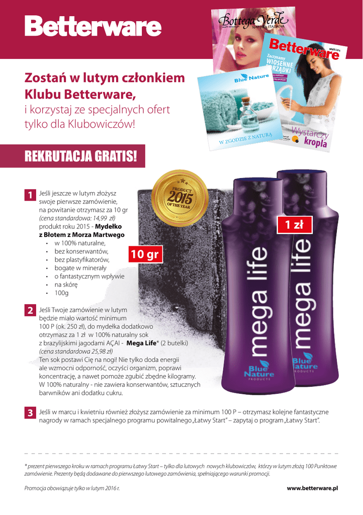 MARZEC-KWIECEIŃ 2016 NATURA ITALIANA MARZEC 201 6 Zaczynam y Zostań w lutym członkiem Klubu Betterware, Przywitaj wiosnę PROMIENNĄ CERĄ -50% WIOS PORZĄEDNKNE I PROSTE PRZEPIS Y SPRAWDZONE SPOSOB Y Sprawdź promocje na stronie 27. i korzystaj ze specjalnych ofert tylko dla Klubowiczów! W ZGO REKRUTACJA GRATIS! 1 Jeśli jeszcze w lutym złożysz swoje pierwsze zamówienie, na powitanie otrzymasz za 10 gr (cena standardowa: 14,99 zł) produkt roku 2015 - Mydełko z Błotem z Morza Martwego • w 100% naturalne, • bez konserwantów, • bez plastyfikatorów, • bogate w minerały • o fantastycznym wpływie • na skórę • 100g NOWOŚĆ! DZIE Z Ą NATUR 367456 Cytrus owy żel do myc szczegóły ia naczyń na stron ie 41. Wystarc 11 90 15 90 zy kropla 1 zł 10 gr 2 Jeśli Twoje zamówienie w lutym będzie miało wartość minimum 100 P (ok. 250 zł), do mydełka dodatkowo otrzymasz za 1 zł w 100% naturalny sok z brazylijskimi jagodami AÇAI - Mega Life* (2 butelki) (cena standardowa 25,98 zł) Ten sok postawi Cię na nogi! Nie tylko doda energii ale wzmocni odporność, oczyści organizm, poprawi koncentrację, a nawet pomoże zgubić zbędne kilogramy. W 100% naturalny - nie zawiera konserwantów, sztucznych barwników ani dodatku cukru. 3 Jeśli w marcu i kwietniu również złożysz zamówienie za minimum 100 P – otrzymasz kolejne fantastyczne nagrody w ramach specjalnego programu powitalnego „Łatwy Start” – zapytaj o program „Łatwy Start”. * prezent pierwszego kroku w ramach programu Łatwy Start – tylko dla lutowych nowych klubowiczów, którzy w lutym złożą 100 Punktowe zamówienie. Prezenty będą dodawane do pierwszego lutowego zamówienia, spełniającego warunki promocji. Promocja obowiązuje tylko w lutym 2016 r. www.betterware.pl 4,90 zł Zaproś w lutym do Klubu Betterware nowe osoby i odbierz specjalną nagrodę. Za każdą zarejestrowaną w lutym osobę, która w lutym złoży zamówienie za minimum 100 P, otrzymasz za 4,90 zł Zestaw: kawiarka + kawa z kolagenem (cena zestawu: ok. 90 zł) Czajniczek ciśnieniowy do parzenia kawy, który doceni każdy smakosz tego napoju. Dzięki niemu odkryjesz prawdziwy smak i aromat swojej ulubionej kawy. Prosty sposób użycia: Do kawiarki nalewamy wodę, do zaznaczonego poziomu. Filtr uzupełniamy kawą, nakładamy na pojemnik z wodą, łączymy pozostałe części i stawiamy na źródle ciepła (kuchenka gazowa, elektryczna, indukcyjna). Smacznego! Kawiarka wykonana jest ze stali nierdzewnej, wymiary: 16,5 x 12 x 9 cm, pojemność zbiornika: 300 ml Kawa z kolagenem to jedyna taka kawa na rynku! Połączenie najwyższej jakości kawy 100% Arabica i najlepiej przyswajalnego kolagenu tworzy z tego napoju fenomenalny eliksir dla zdrowia i urody. Zachęć swojego nowego Klubowicza, by zaprosił swoich znajomych do Klubu Betterware i skorzystał z tej akcji. Aby otrzymać nagrodę, sam musisz złożyć w lutym zamówienie za minimum 100 P. Nagroda zostanie automatycznie dołączona za 4,90zł / zestaw do Twojego pierwszego zamówienia marcowego. Promocja obowiązuje tylko w lutym 2016 r. www.betterware.pl PL156