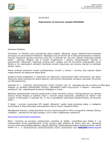 Miasto Żywiec 34-300 Żywiec, Rynek 2 33-475-42-00, 33-475-42-01 03.09.2015 Zaproszenie na koncerty zespołu BLESSING Szanowni Państwo Przesyłam na Państwa ręce premierową płytę zespołu „Blessing” grupy wokalno-instrumentalnej tworzącej na warszawskich Kabatach. Występuje ona od dwóch lat w kilkunastoosobowym składzie, tworząc regularnie oprawę muzyczną mszy św. w kościele św. Ojca Pio. Śpiewa tradycyjne polskie pieśni i piosenki religijne, ale w swoich oryginalnych i nowych interpretacjach. Słychać w wykonaniach „Blessingu” inspirację muzyką soul i gospel, jest też brzmienie tradycyjnego rocka. Można w ich aranżacjach odnaleźć harmonię muzyki klasycznej, ale czerpią również ze stylistyki bluesa i jazzu. Mamy ambicje tworzenia muzyki profesjonalnej, muzyki „z duszą” i chcemy, aby poprzez śpiew mogło dotrzeć do odbiorców Słowo Boże. Zespół pracuje projektowo, w zależności od repertuaru wykorzystuje takie instrumenty, jak gitara klasyczna, gitara akustyczna, gitara basowa, instrumenty klawiszowe, skrzypce, perkusja, flet prosty czy flet poprzeczny. Wokaliści #℣佐⌡⌀猀漀瀀爀愀渀礀Ⰰ 洀攀稀稀漀猀漀瀀爀愀渀礀Ⰰ 愀氀琀礀Ⰰ 琀攀渀漀爀礀Ⰰ 戀愀猀⌡⍃倣℣ śpiewają solo lub w chórze na kilka głosó składzie są zarówno profesjonalni muzycy, absolwenci szkół muzycznych II stopnia i kierunków wokalnych, jak i utalentowani amatorzy działający w scholi. BlesSing zaprezentował szerszej publiczności swoje autorskie utwory, skomponowane do tekstów wierszy Karola Wojtyły w kwietniu 2014 r. Koncert poezji śpiewanej „Uwielbiam tę miłość” miał miejsce w Warszawie, w kościele św. O. Pio w przeddzień kanonizacji Papieża-Polaka, 26 kwietnia 2014 r. Z okazji I rocznicy kanonizacji JPII zespół „Blessing” wydał swoja pierwszą płytę, a następnie koncertował w kilku kościołach warszawskich oraz w innych miastach Polski. Występował również z okazji pierwszej rocznicy kanonizacji JPII w TVP1 w programie „Miedzy Ziemią, a Niebem”, poniżej link do tego występu, oraz w kilku rozgłośniach radiowych. http://www.santosubito.org.pl/filmy Płyta i koncerty są wyrazem wdzięczności artystów za Osobę i pontyfikat Jana Pawła II i są równocześnie formą upamiętnienia 10-tej rocznicy Jego odejścia do Domu Ojca jak i pierwszej rocznicy kanonizacji Polaka Papieża. Zespół „BlesSing” działa pod patronatem Stowarzyszenia „Santo Subito” #℣佐⌡⌀漀 搀稀椀愁䈀愀氀渀漁嬀挀椀 匀琀漀眀愀爀稀礀猀稀攀渀椀愀 洀漁簀渀愀 瀀爀稀攀挀稀礀琀愁 ܀瀀漀搀 愀搀爀攀猀攀洀 www.santosubito.org.pla Strona 1/2 Miasto Żywiec 34-300 Żywiec, Rynek 2 33-475-42-00, 33-475-42-01 więcej o zespole na jego stronie internetowej www.blessing.com.pl Jednocześnie mamy zaszczyt zaprosić wszystkich mieszkańców Gilowic na najbliższe koncerty: - 12.09.2015 w Kalwarii Zebrzydowskiej w Bazylice Matki Bożej Anielskiej u Ojców Bernardynów na godzinę 20.15; - 13.09.2015 w Żywcu w Miejskim Centrum Kultury (Al. Wolności 4) na godzinę 17 Wstęp na koncerty wolny. Z pozdrowieniami Marcin Trybulec oraz Jędrek Wingralek Strona 2/2 Powered by TCPDF (www.tcpdf.org)