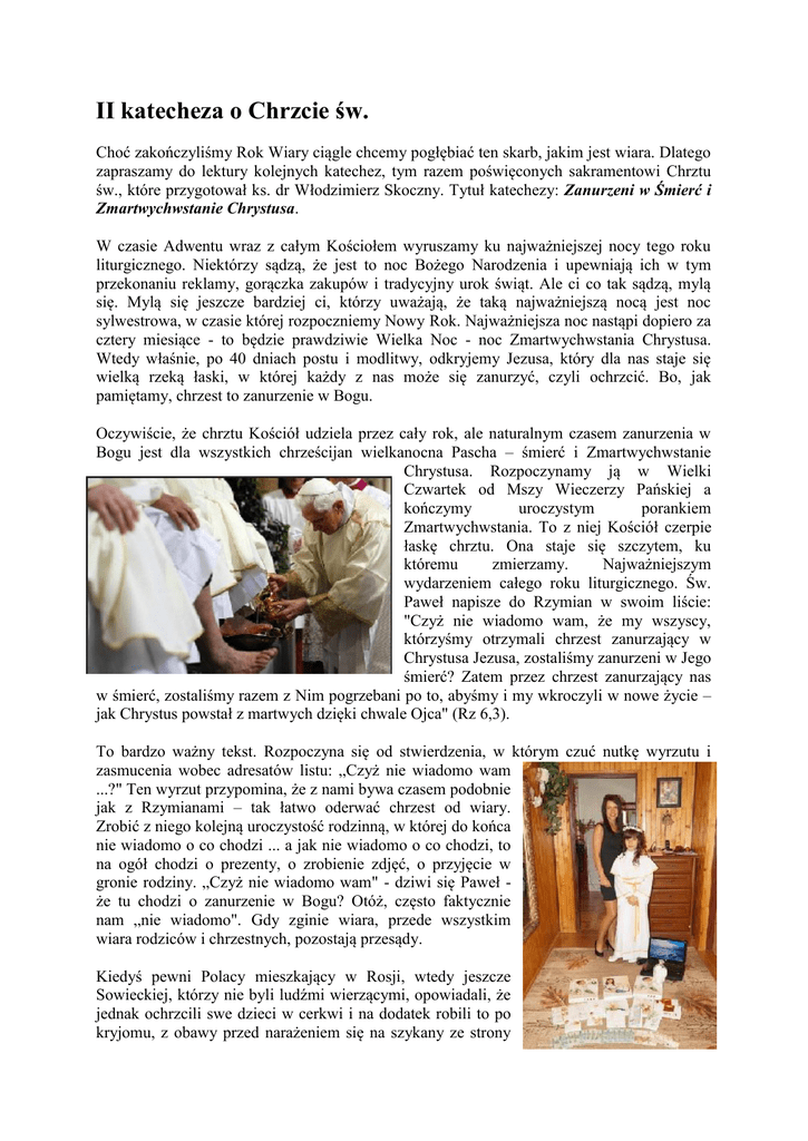 II katecheza o Chrzcie św. Choć zakończyliśmy Rok Wiary ciągle chcemy pogłębiać ten skarb, jakim jest wiara. Dlatego zapraszamy do lektury kolejnych katechez, tym razem poświęconych sakramentowi Chrztu św., które przygotował ks. dr Włodzimierz Skoczny. Tytuł katechezy: Zanurzeni w Śmierć i Zmartwychwstanie Chrystusa. W czasie Adwentu wraz z całym Kościołem wyruszamy ku najważniejszej nocy tego roku liturgicznego. Niektórzy sądzą, że jest to noc Bożego Narodzenia i upewniają ich w tym przekonaniu reklamy, gorączka zakupów i tradycyjny urok świąt. Ale ci co tak sądzą, mylą się. Mylą się jeszcze bardziej ci, którzy uważają, że taką najważniejszą nocą jest noc sylwestrowa, w czasie której rozpoczniemy Nowy Rok. Najważniejsza noc nastąpi dopiero za cztery miesiące - to będzie prawdziwie Wielka Noc - noc Zmartwychwstania Chrystusa. Wtedy właśnie, po 40 dniach postu i modlitwy, odkryjemy Jezusa, który dla nas staje się wielką rzeką łaski, w której każdy z nas może się zanurzyć, czyli ochrzcić. Bo, jak pamiętamy, chrzest to zanurzenie w Bogu. Oczywiście, że chrztu Kościół udziela przez cały rok, ale naturalnym czasem zanurzenia w Bogu jest dla wszystkich chrześcijan wielkanocna Pascha – śmierć i Zmartwychwstanie Chrystusa. Rozpoczynamy ją w Wielki Czwartek od Mszy Wieczerzy Pańskiej a kończymy uroczystym porankiem Zmartwychwstania. To z niej Kościół czerpie łaskę chrztu. Ona staje się szczytem, ku któremu zmierzamy. Najważniejszym wydarzeniem całego roku liturgicznego. Św. Paweł napisze do Rzymian w swoim liście: "Czyż nie wiadomo wam, że my wszyscy, którzyśmy otrzymali chrzest zanurzający w Chrystusa Jezusa, zostaliśmy zanurzeni w Jego śmierć? Zatem przez chrzest zanurzający nas w śmierć, zostaliśmy razem z Nim pogrzebani po to, abyśmy i my wkroczyli w nowe życie – jak Chrystus powstał z martwych dzięki chwale Ojca" (Rz 6,3). To bardzo ważny tekst. Rozpoczyna się od stwierdzenia, w którym czuć nutkę wyrzutu i zasmucenia wobec adresatów listu: „Czyż nie wiadomo wam ...?" Ten wyrzut przypomina, że z nami bywa czasem podobnie jak z Rzymianami – tak łatwo oderwać chrzest od wiary. Zrobić z niego kolejną uroczystość rodzinną, w której do końca nie wiadomo o co chodzi ... a jak nie wiadomo o co chodzi, to na ogół chodzi o prezenty, o zrobienie zdjęć, o przyjęcie w gronie rodziny. „Czyż nie wiadomo wam" - dziwi się Paweł że tu chodzi o zanurzenie w Bogu? Otóż, często faktycznie nam „nie wiadomo". Gdy zginie wiara, przede wszystkim wiara rodziców i chrzestnych, pozostają przesądy. Kiedyś pewni Polacy mieszkający w Rosji, wtedy jeszcze Sowieckiej, którzy nie byli ludźmi wierzącymi, opowiadali, że jednak ochrzcili swe dzieci w cerkwi i na dodatek robili to po kryjomu, z obawy przed narażeniem się na szykany ze strony władzy. Dlaczego się w ogóle na to decydowali? Odpowiedzieli, że chodziło im o to, by się zabezpieczyć... tak na wszelki wypadek - by dziecko nie chorowało, no i by babcia się już nie dopytywała, a w końcu... wiele to nie kosztuje. Można traktować chrzest jako „polisę" u Pana Boga. Św. Paweł zaznacza dalej w cytowanym powyżej Liście do Rzymian, że chrzest to zanurzenie w Chrystusie, że On jest źródłem wody żywej, bo chrzest w nas „grzebie" starego człowieka, abyśmy rozpoczęli „nowe życie". Umieram, by Zmartwychwstać. W zanurzeniu w Chrystusie są nieustannie obecne te dwa elementy powiązane ze sobą, a jednak tak różne – śmierć i Zmartwychwstanie; „zejście do grobu", czyli „pogrzebanie" i „wyjście z grobu"; „stary człowiek" i „stare życie" oraz „nowy człowiek", ten, który się „powtórnie narodził". Pierwszy z tych elementów nie jest zbyt popularny, bo mówienie o śmierci i umieraniu, to smutna konieczność spychana jak tylko się da na margines naszego życia. Nie wypada o niej mówić na chrzcie, ślubie czy imieninach. Tam trzeba składać życzenia zdrowia, 100 lat i szczęścia w życiu osobistym. A przecież Jezus mówił, że „jeśli ziarno wpadłszy w ziemie nie obumrze .. zostanie tylko samo", i te słowa dotyczą całego życia. Jeśli „ziarno nie obumrze" ... nigdy nie będzie zdrowe, nigdy nie będzie prawdziwie żyć, nigdy nie będzie szczęśliwe. Bo zdrowie, życie i szczęście wiedzie przez krzyż, śmierć i pogrzebanie - tak było w historii Pana Jezusa. Tak jest w każdej ludzkiej historii. Św. Franciszek z Asyżu pokazał nam, co to znaczy żyć Ewangelią i często rozmyślał nad prawdą o potrzebie „umierania" i „krzyża" w swoim życiu. W jednej z pierwszych biografii możemy się dowiedzieć, że oto któregoś dnia „Franciszek sporządza sobie tunikę wyobrażającą krzyż (1), aby jego obraz w niej odganiał wszelkie diabelskie pokusy" (2). Po dziś dzień franciszkański habit przypomina krzyż. To był kolejny etap długiego procesu w czasie którego Franciszek dorastał do „umierania" w Chrystusie , a którego finałem były stygmaty, czyli rany na ciele - fizyczny znak jedności z Tym, w którego „ranach jest nasze zdrowie". „Śmierć" i „pogrzebanie" łączy się z inną prawdą, równie niepopularną; z tym, że rodzę się grzesznikiem. Noszę na sobie brzemię grzechu pierworodnego i moje osobiste grzechy, z których może mnie wyswobodzić tylko Chrystus. To mój grzech sprawia śmierć, to jego trzeba „pogrzebać", „zatopić' jak wojska faraona, to on jest przyczyną mojej prawdziwej „starości". W niedawnym wywiadzie przeprowadzonym z papieżem Franciszkiem padła prośba, by Ojciec Święty sam się określił: kim jest Jose Maria Bergoglio? Papież odpowiedział: "Nie wiem, jaka byłaby najlepsza definicja... Ja jestem grzesznikiem. To jest ta najlepsza z definicji. Jestem grzesznikiem. Tak, ta najlepsza synteza, która pochodzi z wewnątrz i którą uważam za najprawdziwszą, brzmi właśnie tak: 'jestem