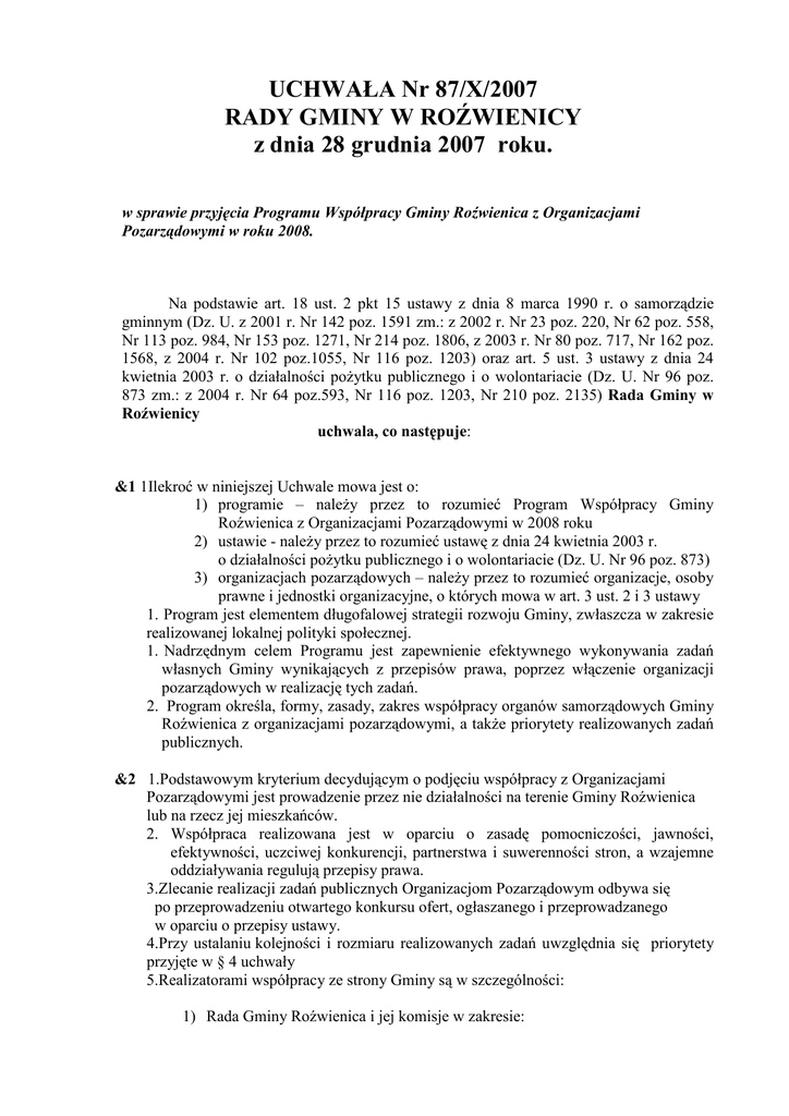 UCHWAŁA Nr 87/X/2007 RADY GMINY W ROŹWIENICY z dnia 28 grudnia 2007 roku. w sprawie przyjęcia Programu Współpracy Gminy Roźwienica z Organizacjami Pozarządowymi w roku 2008. Na podstawie art. 18 ust. 2 pkt 15 ustawy z dnia 8 marca 1990 r. o samorządzie gminnym (Dz. U. z 2001 r. Nr 142 poz. 1591 zm.: z 2002 r. Nr 23 poz. 220, Nr 62 poz. 558, Nr 113 poz. 984, Nr 153 poz. 1271, Nr 214 poz. 1806, z 2003 r. Nr 80 poz. 717, Nr 162 poz. 1568, z 2004 r. Nr 102 poz.1055, Nr 116 poz. 1203) oraz art. 5 ust. 3 ustawy z dnia 24 kwietnia 2003 r. o działalności poŜytku publicznego i o wolontariacie (Dz. U. Nr 96 poz. 873 zm.: z 2004 r. Nr 64 poz.593, Nr 116 poz. 1203, Nr 210 poz. 2135) Rada Gminy w Roźwienicy uchwala, co następuje: &1 1Ilekroć w niniejszej Uchwale mowa jest o: 1) programie – naleŜy przez to rozumieć Program Współpracy Gminy Roźwienica z Organizacjami Pozarządowymi w 2008 roku 2) ustawie - naleŜy przez to rozumieć ustawę z dnia 24 kwietnia 2003 r. o działalności poŜytku publicznego i o wolontariacie (Dz. U. Nr 96 poz. 873) 3) organizacjach pozarządowych – naleŜy przez to rozumieć organizacje, osoby prawne i jednostki organizacyjne, o których mowa w art. 3 ust. 2 i 3 ustawy 1. Program jest elementem długofalowej strategii rozwoju Gminy, zwłaszcza w zakresie realizowanej lokalnej polityki społecznej. 1. Nadrzędnym celem Programu jest zapewnienie efektywnego wykonywania zadań własnych Gminy wynikających z przepisów prawa, poprzez włączenie organizacji pozarządowych w realizację tych zadań. 2. Program określa, formy, zasady, zakres współpracy organów samorządowych Gminy Roźwienica z organizacjami pozarządowymi, a takŜe priorytety realizowanych zadań publicznych. &2 1.Podstawowym kryterium decydującym o podjęciu współpracy z Organizacjami Pozarządowymi jest prowadzenie przez nie działalności na terenie Gminy Roźwienica lub na rzecz jej mieszkańców. 2. Współpraca realizowana jest w oparciu o zasadę pomocniczości, jawności, efektywności, uczciwej konkurencji, partnerstwa i suwerenności stron, a wzajemne oddziaływania regulują przepisy prawa. 3.Zlecanie realizacji zadań publicznych Organizacjom Pozarządowym odbywa się po przeprowadzeniu otwartego konkursu ofert, ogłaszanego i przeprowadzanego w oparciu o przepisy ustawy. 4.Przy ustalaniu kolejności i rozmiaru realizowanych zadań uwzględnia się priorytety przyjęte w § 4 uchwały 5.Realizatorami współpracy ze strony Gminy są w szczególności: 1) Rada Gminy Roźwienica i jej komisje w zakresie: a)określania strategii rozwoju Gminy ze szczególnym uwzględnieniem szeroko rozumianej polityki społecznej, b)nawiązywania merytorycznej współpracy z organizacjami pozarządowymi, c)utrzymywania kontaktów pomiędzy poszczególnymi komisjami stałymi, a Organizacjami Pozarządowymi, realizującymi zadania w obszarach będących jednocześnie obszarami działań komisji. 2) Wójt Gminy Roźwienica w zakresie: a) realizacji zadań wynikających z Programu poprzez ogłaszanie otwartych konkursów ofert w celu powierzenia lub wsparcia realizacji zadania i przekazania odpowiednich na ten cel środków w ramach budŜetu, b) kontroli i oceny stanu realizacji zleconego zadania pod względem efektywności i jakości przy pomocy Sekretarza Gminy, Skarbnika Gminy, Kierowników gminnych jednostek organizacyjnych i Kierowników referatów Urzędu Gminy Roźwienica oraz osób zajmujących samodzielne stanowiska pracy. 3) Komisja konkursowa powołana przez Wójta Gminy w skład której wchodzi trzech przedstawicieli Rady Gminy i dwóch pracowników Urzędu Gminy. Zadaniem komisji konkursowej jest przeprowadzenie postępowania i przedłoŜenie wyników konkursu Wójtowi do zatwierdzenia. Szczegółowy tryb pracy komisji określa regulamin zatwierdzony przez Wójta. 1. Realizatorami współpracy ze strony Organizacji Pozarządowych są zgłoszone w rejestrach ich organy statutowe. &3 1.Współdziałanie Gminy Roźwienica z Organizacjami Pozarządowymi obejmuje współpracę o charakterze finansowym i pozafinansowym. 2Współpraca finansowa polega na zlecaniu realizacji zadań Gminy Roźwienica Organizacjom Pozarządowym poprzez: 1) powierzenie wykonania zadania publicznego wraz z udzieleniem dotacji na jego realizację, 2) wsparcie wykonania zadania publicznego wraz z udzieleniem dotacji na częściowe dofinansowanie jego realizacji, 3. Współpraca pozafinansowa polega na: 1) wzajemnym informowaniu się o planowanych kierunkach działalności poprzez: a) przekazywanie bieŜących informacji związanych z realizacją Programu na tablicy ogłoszeń w Urzędzie Gminy. b) zapoznanie Organizacji Pozarządowych z obszarami działań, w które mogą się włączyć jako realizatorzy powierzonych przez Gminę zadań, c) bieŜące informowanie o sesjach Rady Gminy i posiedzeniach komisji, podczas których omawiane będą zagadnienia związane z działalnością statutową Organizacji Pozarządowych w zakresie realizowania zadań publicznych, 2) konsultowaniu aktów prawnych w dziedzinach dotyczących statutowej działalności poŜytku publicznego Organizacji Pozarządowych poprzez: a) udział przedstawicieli Organizacji Pozarządowych i władz samorządowych w spotkaniach, mających na celu merytoryczne diagnozowanie potrzeb społeczności lokalnej, b) udostępnianie Organizacjom Pozarządowym projektów uchwał z dziedzin związanych z ich statutową działalnością, 3) tworzeniu wspólnych zespołów o charakterze doradczym i inicjatywnym, skupiających przedstawicieli władz Gminy i Organizacji Pozarządowych w celu definiowania priorytetowych dla Gminy obszarów problemowych, w rozwiązanie których, Organizacje Pozarządowe mogą włączyć się jako realizator zadania 4) inne formy współpracy mogą być realizowane poprzez: a) inicjowanie zadań aktywizujących i integrujących Organizacje Pozarządowe, b) udostępnianie Organizacjom Pozarządowym lokali na spotkania ogólnodost