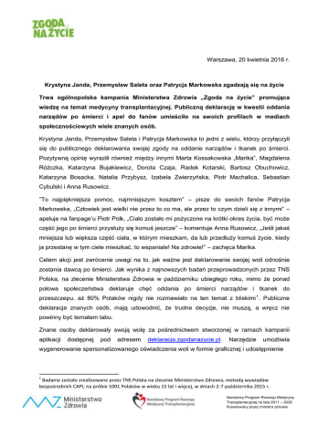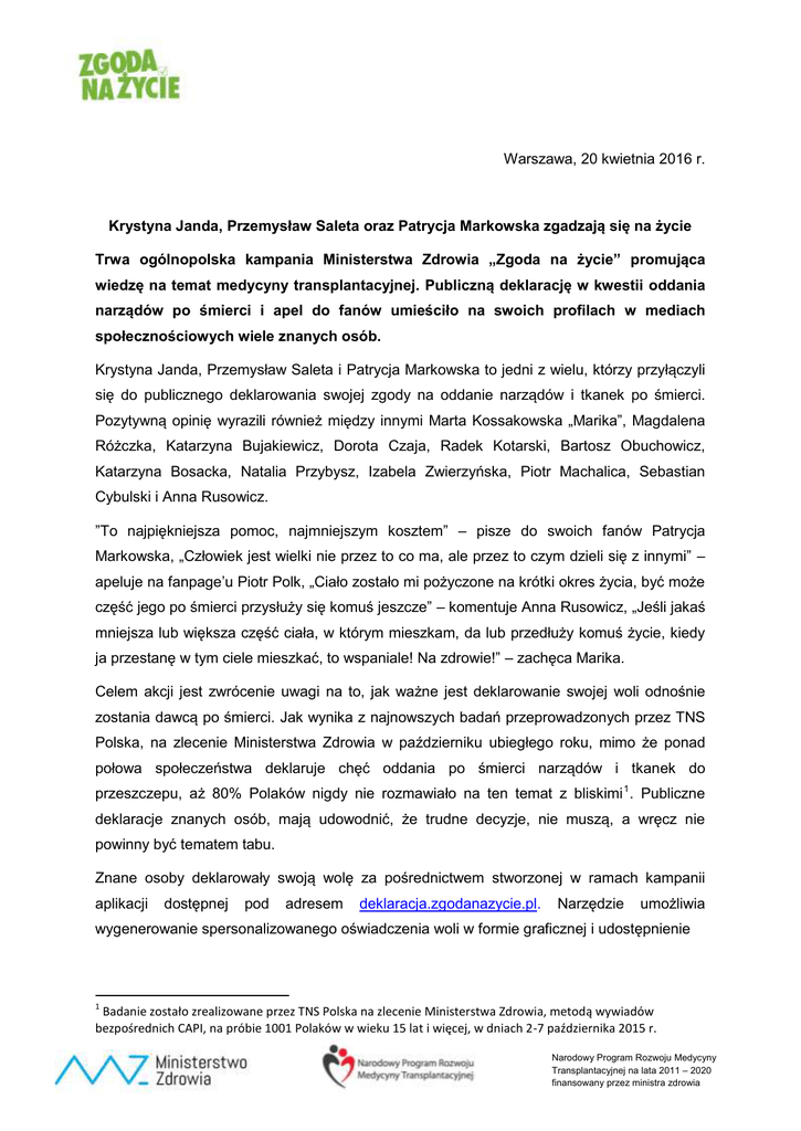 Warszawa, 20 kwietnia 2016 r. Krystyna Janda, Przemysław Saleta oraz Patrycja Markowska zgadzają się na życie Trwa ogólnopolska kampania Ministerstwa Zdrowia „Zgoda na życie” promująca wiedzę na temat medycyny transplantacyjnej. Publiczną deklarację w kwestii oddania narządów po śmierci i apel do fanów umieściło na swoich profilach w mediach społecznościowych wiele znanych osób. Krystyna Janda, Przemysław Saleta i Patrycja Markowska to jedni z wielu, którzy przyłączyli się do publicznego deklarowania swojej zgody na oddanie narządów i tkanek po śmierci. Pozytywną opinię wyrazili również między innymi Marta Kossakowska „Marika”, Magdalena Różczka, Katarzyna Bujakiewicz, Dorota Czaja, Radek Kotarski, Bartosz Obuchowicz, Katarzyna Bosacka, Natalia Przybysz, Izabela Zwierzyńska, Piotr Machalica, Sebastian Cybulski i Anna Rusowicz. ”To najpiękniejsza pomoc, najmniejszym kosztem” – pisze do swoich fanów Patrycja Markowska, „Człowiek jest wielki nie przez to co ma, ale przez to czym dzieli się z innymi” – apeluje na fanpage’u Piotr Polk, „Ciało zostało mi pożyczone na krótki okres życia, być może część jego po śmierci przysłuży się komuś jeszcze” – komentuje Anna Rusowicz, „Jeśli jakaś mniejsza lub większa część ciała, w którym mieszkam, da lub przedłuży komuś życie, kiedy ja przestanę w tym ciele mieszkać, to wspaniale! Na zdrowie!” – zachęca Marika. Celem akcji jest zwrócenie uwagi na to, jak ważne jest deklarowanie swojej woli odnośnie zostania dawcą po śmierci. Jak wynika z najnowszych badań przeprowadzonych przez TNS Polska, na zlecenie Ministerstwa Zdrowia w październiku ubiegłego roku, mimo że ponad połowa społeczeństwa deklaruje chęć oddania po śmierci narządów i tkanek do przeszczepu, aż 80% Polaków nigdy nie rozmawiało na ten temat z bliskimi 1 . Publiczne deklaracje znanych osób, mają udowodnić, że trudne decyzje, nie muszą, a wręcz nie powinny być tematem tabu. Znane osoby deklarowały swoją wolę za pośrednictwem stworzonej w ramach kampanii aplikacji dostępnej pod adresem deklaracja.zgodanazycie.pl. Narzędzie umożliwia wygenerowanie spersonalizowanego oświadczenia woli w formie graficznej i udostępnienie 1 Badanie zostało zrealizowane przez TNS Polska na zlecenie Ministerstwa Zdrowia, metodą wywiadów bezpośrednich CAPI, na próbie 1001 Polaków w wieku 15 lat i więcej, w dniach 2-7 października 2015 r. Narodowy Program Rozwoju Medycyny Transplantacyjnej na lata 2011 – 2020 finansowany przez ministra zdrowia go w mediach społecznościowych. Wypełnienie deklaracji nie ma mocy prawnej, ale jest niezwykle ważne, bo dzięki niej nasi bliscy mają szansę dowiedzieć się jaka jest nasz wola. Część osób, które zaangażowały się w kampanię, nie tylko zadeklarowało swoją wolę za pośrednictwem mediów społecznościowych, ale również wzięło udział w krótkim filmie. Uczestnicy nagrania komentowali dlaczego warto przekazać swoje narządy do przeszczepu, dając jednocześnie innym szanse na nowe życie. Film został nagrany podczas największej w Polsce imprezy sportowej promującej transplantologię - „Biegu Po Nowe Życie”, 19 marca w Wiśle. Materiał jest dostępny pod linkiem: https://youtu.be/JLoZqeqK5IY Kampania „Zgoda na życie” Kampania „Zgoda na życie” potrwa do końca 2016 r. Jej celem jest upowszechnienie w społeczeństwie wiedzy na temat medycyny transplantacyjnej, zachęcenie Polaków do publicznego deklarowania swojej woli w kwestii dawstwa narządów oraz zostawania potencjalnymi dawcami szpiku kostnego. Kampania finansowana jest w ramach Narodowego Programu Rozwoju Medycyny Transplantacyjnej na lata 2011 – 2020. Więcej informacji znaleźć można na stronie www.zgodanazycie.pl. Więcej informacji udzielają: Maria Zakrzewska Fabryka Komunikacji Społecznej [email protected] (22) 616 12 17 Anna Iżyńska Fabryka Komunikacji Społecznej [email protected] (22) 616 12 17 Narodowy Program Rozwoju Medycyny Transplantacyjnej na lata 2011 – 2020 finansowany przez ministra zdrowia