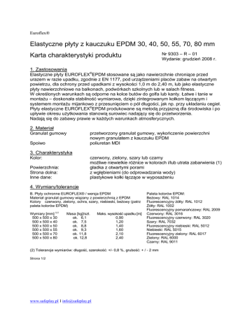 Euroflex® Elastyczne płyty z kauczuku EPDM 30, 40, 50, 55, 70, 80 mm Nr 9303 – R – 01 Wydanie: grudzień 2008 r. Karta charakterystyki produktu 1. Zastosowania Elastyczne płyty EUROFLEX®EPDM stosowane są jako nawierzchnie chroniące przed urazem w razie upadku, zgodnie z EN 1177, pod urządzeniami placów zabaw na otwartym powietrzu, dla ochrony przed upadkami z wysokości 1,0 m do 2,40 m, lub jako elastyczne płyty nawierzchniowe na balkonach, podwórkach szkolnych lub w salach fitness. W określonych warunkach są odporne na kolce butów do golfa lub kanty. Łatwe i tanie w montażu – doskonała stabilność wymiarowa, dzięki zintegrowanym kołkom łączącym i systemem montażu mijankowo z przesunięciem o pół długości, jak np. przy układaniu cegieł. Płyty elastyczne EUROFLEX®EPDM produkowane są metodą przyjazną dla środowiska i po upływie okresu użytkowania stanowią surowiec nadający się do przetworzenia. Nadają się do zabawy prawie w każdych warunkach atmosferycznych. 2. Materiał Granulat gumowy Spoiwo przetworzony granulat gumowy, wykończenie powierzchni nowym granulatem z kauczuku EPDM poliuretan MDI 3. Charakterystyka Kolor: czerwony, zielony, szary lub czarny możliwe niewielkie różnice w kolorach i/lub utrata zabarwienia (1) gładka z otwartymi porami z wgłębieniami (do odprowadzania wody) plastykowe kołki łączące w wyposażeniu Powierzchnia: Strona dolna: Inne dane: 4. Wymiary/tolerancje B. Płyty ochronne EUROFLEX® / wersja EPDM Materiał granulat gumowy wiązany z powierzchnią z EPDM Kolory czerwony, zielony, ochra, szary, niebieski, beżowy (patrz paleta kolorów EPDM) (2) Wymiary [mm] 500 x 500 x 30 500 x 500 x 40 500 x 500 x 50 500 x 500 x 55 500 x 500 x 70 500 x 500 x 80 Masa [kg]/szt. ok. 6,1 ok. 7,5 ok. 8,8 ok. 9,3 ok. 11,8 ok. 12,8 Maks. wysokość upadku [m] 0,90 1,20 1,40 1,60 2,10 2,40 Paleta kolorów EPDM: Beżowy: RAL 1014 Fluorescencyjny żółty: RAL 1012 Żółty: RAL 1002 Fluorescencyjny pomarańczowy: RAL 2009 Czerwony: RAL 3016 Fluorescencyjny czerwony: RAL 3020 Szary: RAL 7032 Fluorescencyjny niebieski: RAL 5012 Niebieski: RAL 5015 Fluorescencyjny zielony: RAL 6017 Zielony: RAL 6000 Czarny: RAL 9011 (2) Tolerancje wymiarów: długość, szerokość: +/- 0,8 %, grubość: + / - 2 mm Strona 1/2 www.safeplay.pl I [email protected] Euroflex® Elastyczne płyty z kauczuku EPDM 30, 40, 50, 55, 70, 80 mm Karta charakterystyki produktu Nr 9303 – R – 01 Wydanie: grudzień 2008 r. 5. Dane z badań Dopuszczalna wysokość upadku: HIC 1000 zgodnie z DIN EN 1177:2008, EN 1177:2008 zgodnie z ASTM 1292-2004 zgodnie z DIN EN 1176-1:2008, EN 1176-1:2008 Ogniotrwałość: klasa E DIN EN 13501-1, 2002 Klasa B s1 dla powierzchni EPDM dostępna na życzenie ok. 40% DIN 53571 rV 5,9 DIN 18035 część 6 BS 7188-4 w określonych warunkach odporny na kwasy i zasady odporny zgodnie z DIN EN ISO 175, DIN EN ISO 3386-2 Wydłużenie całkowite: Odporność na ścieranie: Odporność chemiczna: Odporność na wodę morską: Odporność na złamanie w niskich temperaturach: Odporność na pękanie w niskich temperaturach: Właściwości antypoślizgowe: Strumień krytyczny promieniowania cieplnego: Tarcie dynamiczne: Próba przenikalności wody: Wytrzymałość na rozciąganie Kontrola zakładu produkcyjnego 24 godz. / -40oC, bez złamania 5 godz. / -30oC, bez pęknięć mokro: 50, 75, sucho: 50 zgodnie z ASTM E 303 0,08 watów/cm3 zgodnie z ASTM E 648/03 mokro: 0,57 µ, suche 0,65 µ zgodnie z DIN 18032-2, 2001-04 płyta 40 mm: 0,011 gpm/in3, płyta 70 mm: 0,015 gpm/in3 min. 0,75 N/mm2 DIN 53571 6. Montaż Położyć równą warstwę chudego betonu lub żwiru na podłożu, w którym nie tworzy się wolny lód. Jeśli pokrywana powierzchnia jest nawierzchnią betonową lub asfaltową, zapewnić zachowanie odpowiedniego spadku odwadniającego i wyrównać wszelkie nierówności. Stosować płyty krawędziowe i narożne wokół nawierzchni, w celu ograniczenia ryzyka potknięcia się. Płyty układać z przesunięciem o połowę długości, tak jak np. przy układaniu cegieł, tzn. co drugi rząd rozpoczynać połową płyty. Wkładać na całą głębokość kołki łączące do otworów. W celu zapewnienia stabilnego rozłożenia, nałożyć zaprawę w poprzek złączy pierwszego i ostatniego rzędu. Jako spoiwo zastosować jednoskładnikową poliuretanową zaprawę klejącą. Płyty przycinać wyrzynarką elektryczną. Zapoznać się z kompletną instrukcją montażu. Żadne informacje nie podlegają gwarancji, zastrzega się prawo wprowadzania zmian. Zmiany w niniejszej karcie charakterystyki nie są objęte obowiązkiem ich komunikowania. Strona 2/2 www.safeplay.pl I [email protected]