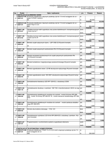 Instal Telet Al Brzóz.KST KSIĄŻKA PRZEDMIARÓW BUDOWA BIBLIOTEKI Z SALAMI DYDAKTYCZNYMI I ŁĄCZNIKIEM 05-500 PIASECZNO ; Al. Brzóz 26 Lp. Podst Opis i wyliczenia 1 INSTALACJA ALARMOWA SSWN 1 KNR-W 5-08 Przewody kabelkowe o łącznym przekroju żył do 7.5 mm2 wciągane do rur d.1 0207-01 kabel YnTKSY 2x2x0,8 65 2 KNR-W 5-08 Przewody kabelkowe o łącznym przekroju żył do 7.5 mm2 wciągane do rur d.1 0207-01 kabel Ytdy 8 x 0,5 800 3 KNR 7-08 d.1 0512-01 4 KNR 7-08 d.1 0512-02 5 KNR 7-08 d.1 0402-04 6 KNR 7-08 d.1 0402-04 7 KNR 7-08 d.1 0402-04 8 KNR 7-08 d.1 0402-04 9 KNR 7-08 d.1 0402-04 11 KNR 5-06 d.1 1602-02 12 KNR 5-06 d.1 1601-10 13 KNR 5-06 d.1 1603-02 14 KNR 5-06 d.1 1603-02 15 KNR 5-04 d.1 0505-02 16 KNR 5-06 d.1 1602-02 17 KNR 5-07 d.1 1201-01 Poszcz Razem m m 65.000 RAZEM 65.000 800.000 RAZEM 800.000 2.000 RAZEM 2.000 104.000 RAZEM 104.000 23.000 RAZEM 23.000 12.000 RAZEM 12.000 6.000 RAZEM 6.000 28.000 RAZEM 28.000 2.000 RAZEM 2.000 1.000 RAZEM 1.000 1.000 RAZEM 1.000 1.000 RAZEM 1.000 1.000 RAZEM 1.000 1.000 RAZEM 1.000 1.000 RAZEM 1.000 1.000 RAZEM 1.000 1.000 RAZEM 1.000 m m Obróbka końców kabli sygnalizac.oraz przew.kabelkowych i kompensacyjnych końc. o ilości żył do 7 2 końc. Obróbka końców kabli sygnalizac.oraz przew.kabelkowych i kompensacyjnych końc. o ilości żył do 24 104 końc. Montaż czujek optycznych dymu - LEP OSD 23.Wycenić komplet. ukł. 23 ukł. Montaż czujek pasywnych podczerwieni Rk 410.Wycenić komplet. ukł. 12 ukł. Montaż soczewek korytarzowych do czujek pasywnych podczerwieni Rk 410.Wycenić komplet. 6 ukł. Montaż kontaktronu magnetycznego powierzchniowego.Wycenić komplet. ukł. 28 ukł. ukł. Montaż sygnalizatora wewn. LD-96 akustyczno-optycznego.Wycenić komplet. ukł. 2 10 KNR 7-08 d.1 0402-04 j.m. ukł. Montaż sygnalizatora zewn. SD-3001 akustyczno-optycznego.Wycenić komp- ukł. let. 1 ukł. Zainstalowanie klawiatury LED RP 128 KCL z obudową LCD/B szt. 1 szt. Zainstalowanie obudowy z zamkiem OB 7/40 z transformatorem 40VA na ceg- szt. le 1 szt. Zainstalowanie dodatkowych modułow do centrali - moduł 8-liniowy RP-296 szt. EZ8 , moduł 16-liniowy RP-296 EZ 16 , moduł zasilacza dodatkowego RP 296 EPS 1 szt. Zainstalowanie dodatkowych modułow do centrali - moduł zasilacza dodatko- szt. wego RP 296 EPS 1 szt. Montaż akumulatora żelowego - 17Ah 12V blok. 1 blok. Zainstalowanie szyfratora LCD 8-linii RP-296 KCS z obudową i zamkiem. Wy- szt. cenić komplet. 1 szt. Programowanie i uruchomienie systemu sygnalizacji włamania zestr. 1 zestr. 2 INSTALACJA TELEFONICZNA I KOMPUTEROWA 18 KNR-W 5-08 Przewody kabelkowe YTKSY 3 x 2 x 0,5 mm2 o łącznym przekroju żył do 7.5 d.2 0207-01 mm2 wciągane do rur 250 -1- Norma PRO Wersja 4.01, Marzec 2003 r. m m 250.000 Instal Telet Al Brzóz.KST Lp. Podst KSIĄŻKA PRZEDMIARÓW BUDOWA BIBLIOTEKI Z SALAMI DYDAKTYCZNYMI I ŁĄCZNIKIEM 05-500 PIASECZNO ; Al. Brzóz 26 Opis i wyliczenia j.m. 19 KNR-W 5-08 Przewody kabelkowe - SKRĘTKA 4-PAROWA utp KAT. 5 o łącznym przekro- m d.2 0207-01 ju żył do 7.5 mm2 wciągane do rur 1200 m 20 KNR 7-08 d.2 0512-01 21 KNR 7-08 d.2 0512-02 Obróbka końców kabli sygnalizac.oraz przew.kabelkowych i kompensacyjnych końc. o ilości żył do 7 6 końc. Obróbka końców kabli sygnalizac.oraz przew.kabelkowych i kompensacyjnych końc. o ilości żył do 24 22 końc. 22 KNR-W 5-08 Montaż na gotowym podłożu puszek p.t.bakelitowych o śr.do 60mm d.2 0302-01 14 23 KNR 5-06 d.2 1704-03 24 KNR 5-06 d.2 1704-03 3 INSTALACJA GŁOŚNIKOWA 25 KNR-W 5-08 Przewody kabelkowe radiofoniczne TLYp 2 x 1 mm2 o łącznym przekroju żył d.3 0207-01 do 7.5 mm2 wciągane do rur 120 26 KNR 7-08 d.3 0512-01 28 KNR 5-06 d.3 0803-06 29 Analiza d.3 własna szt. szt. 32 KNR 7-08 d.4 0512-01 33 KNR 5-06 d.4 1704-03 34 KNR 5-06 d.4 1704-03 35 KNR 5-06 d.4 0204-04 m aparat Uruchomienie systemu rozgłaszania szt. 1 szt. Montaż wtyków bnc na kablach współosiowych o sr.do 10 mm szt. 1 szt. Obróbka końców kabli sygnalizac.oraz przew.kabelkowych i kompensacyjnych końc. o ilości żył do 7 6 końc. Zainstalowanie gniazda ANTENOWEGO rtv GAP-xx-BG -DK szt. 6 szt. Zainstalowanie gniazda ANTENOWEGO rtv GAP-BG-DK szt. 1 szt. Instalowanie panelowych 1- kanałowych wzmacniaczy RTV we wnęce lub na ścianie murowanej 1 wzm. -2- Norma PRO Wersja 4.01, Marzec 2003 r. 6.000 RAZEM 6.000 22.000 RAZEM 22.000 14.000 RAZEM 14.000 3.000 RAZEM 3.000 11.000 RAZEM 11.000 120.000 RAZEM 120.000 18.000 RAZEM 18.000 1.000 RAZEM 1.000 6.000 RAZEM 6.000 1.000 RAZEM 1.000 200.000 RAZEM 200.000 1.000 RAZEM 1.000 6.000 RAZEM 6.000 6.000 RAZEM 6.000 1.000 RAZEM 1.000 1.000 RAZEM 1.000 aparat Instalowanie głośnika wnętrzowego 9/6w o mocy 10 W w obudowie zwykłej na szt. ścianie z cegły 6 szt. 5 ROBOTY POMOCNICZE 1200.000 m 4 INSTALACJA ANTENOWA RTV 30 KNR-W 5-08 Przewody kabelkowe YWDek 75-0, 6/3,7 o łącznym przekroju żył do 7.5 mm2 m d.4 0207-01 wciągane do rur 200 m 31 KNR 5-06 d.4 0710-02 1200.000 RAZEM szt. Obróbka końców kabli sygnalizac.oraz przew.kabelkowych i kompensacyjnych końc. o ilości żył do 7 18 końc. 27 KNR-W 5-08 Przygotowanie podłoża do zabudowania aparatów - kucie mechan. pod kołki d.3 0401-12 kotwiące M10 w podł. z cegły - aparat o 3-4 otworach mocujących 1 Razem 250.000 szt. Zainstalowanie gniazda wtykowego RJ-12 pojedyncze do aparatów telefonicz- szt. nych na podłożu z drewna lub cegły.Wycenić komplet. 3 szt. Zainstalowanie gniazda RJ-45 UTP kat. 5 pojedynczego z ramką wtykowego do aparatów telefonicznych na podłożu z drewna lub cegły. Wycenić komplet. 11 Poszcz RAZEM wzm. Instal Telet Al Brzóz.KST KSIĄŻKA PRZEDMIARÓW BUDOWA BIBLIOTEKI Z SALAMI DYDAKTYCZNYMI I ŁĄCZNIKIEM 05-500 PIASECZNO ; Al. Brzóz 26 Lp. Podst Opis i wyliczenia 36 KNR-W 4-03 Mechaniczne przebijanie otworów w ścianach lub stropach z cegły o długości d.5 1003-01 przebicia do 1/2 ceg. - śr.rury do 25 mm 8 j.m. otw. otw. 37 KNR-W 4-03 Mechaniczne przebijanie otworów w 