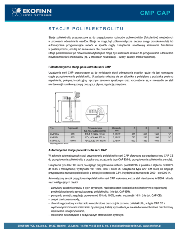 CMP CAP STACJE POLIELEKTROLITU Stacje polielektrolitu przeznaczone są do przygotowania roztworów polielektrolitów (flokulantów) niezbędnych w procesach odwadniania osadów. Stacje te mogą być półautomatyczne (ręczny zasyp proszku/emulsji) lub automatycznie przygotowujące roztwór w sposób ciągły. Urządzenia umoŜliwiają stosowanie flokulantów w postaci proszku, emulsji lub zamiennie w obu postaciach. Stacje polielektrolitów po niewielkich modyfikacjach mogą być stosowane równieŜ do przygotowania i dozowania innych roztworów i chemikaliów (np. w procesach neutralizacji – kwasy, zasady, mleko wapienne). Półautomatyczne stacje polielektrolitu serii CMP Urządzenia serii CMP przeznaczone są do mniejszych stacji odwadniania osadów, gdzie nie jest wymagane ciągłe przygotowywanie polielektrolitu. Urządzenia składają się ze zbiornika z polietylenu z podziałką poziomu napełnienia, pokrywą inspekcyjną i ręcznym zaworem spustowym oraz wyposaŜone są w mieszadło ze stali nierdzewnej i nurnikową pompę dozującą z płynną regulacją przepływu. Typ Pojemność CMP03-M CMP05-L CMP10-XL 300 l 500 l 1000 l Pompa dozująca typ, moc, wydajność max PD-M, 0,24 kW, 125 l/h PD-L, 0,30 kW, 200 l/h PD-XL, 0,30 kW, 300 l/h Mieszadło, moc 0,18 kW 0,18 kW 0,75 kW A B C D 660 780 1000 1050 1250 1320 1380 1590 1660 ¾” ¾” ¾” Wymiary podano w mm. Automatyczne stacje polielektrolitu serii CAP W zakresie automatycznych stacji przygotowania polielektrolitu serii CAP oferowane są urządzenia typu CAP CE do przygotowania polielektrolitu z proszku oraz urządzenia typu CAP EM do przygotowania polieletrolitu z emulsji. Urządzenia typu CAP CE słuŜą do ciągłego przygotowania roztworu polielektrolitu z proszku o stęŜeniu od 0.05% do 0.3% i maksymalnej wydajności 750, 1500, 3000 i 6000 l/h. Urządzenia typu CAP EM słuŜą do ciągłego przygotowania roztworu polielektrolitu z emulsji o stęŜeniu do 0,8% i wydajności roztworu do 2000 i do 6000 l/h. Automatyczny zespół przygotowania polielektrolitu serii CAP wykonany jest ze stali nierdzewnej AISI304 i składa się z następujących części: - zamykany zasobnik proszku z lejem zsypowym, rozdrabniaczem i podajnikiem ślimakowym o regulowanej prędkości podawania sproszkowanego polielektrolitu, (nie dot. CAP EM), - pompa do emulsji z regulacją przepływu od 10% do 100%, maks. wydajność 16 l/h (nie dot. CAP CE), - zespół dawkowania wody, - zbiornik wyposaŜony w mieszadło wolnoobrotowe oraz czujnik poziomu polielektrolitu, w typie CAP CE z wydzielonymi komorami mieszania i dyspersyjną, kaŜdą wyposaŜoną w mieszadło wolnoobrotowe oraz komorą dojrzewania i magazynowania, - sterowanie automatyczne z dedykowanym sterownikiem cyfrowym. EKOFINN-POL sp. z o.o., 80-297 Banino, ul. Leśna, tel./fax +48 58 684 87 03, e-mail:[email protected], www.ekofinn.pl CMP CAP CAP CE Polielektrolit z zasobnika proszku transportowany jest przez podajnik ślimakowy z rozdrabniaczem do strefy, gdzie jest wstępnie mieszany z odpowiednią ilością wody. Następnie roztwór wpływa do komory rozpuszczania z mieszadłem mechanicznym, skąd mieszanina przepływa do komory dyspersyjnej, równieŜ wyposaŜonej w mieszadło mechaniczne, by na końcu dostać się do komory, w której zachodzi proces dojrzewania roztworu polielektrolitu. Z tej komory roztwór polielektrolitu pompowany jest do miejsca przeznaczenia za pomocą zewnętrznej pompy dozującej. EM QE Q0 P3 Typ CAP07CE CAP15CE CAP30CE CAP60CE P2 P12 Wydajność [l/h] 750 1500 3000 6000 Moc [kW] 0,54 0,54 0,54 0,54 A 1398 1998 2098 3098 B 1722 2190 2307 3307 C 1800 1800 2350 2350 D 1113 1202 1513 2013 E 798 998 1298 1798 G ¾” GF ¾” GF 1’ GF 1’GF CAPOUT ¾” GF 1 ½” GF DN 65 DN 65 CT ¾” GF ¾” GF 1 ¼” GF 1 ¼” GF Wymiary podano w mm. CAP EM Polielektrolit w emusji dozowany jest przez pompę nurnikową do mieszacza, w którym zachodzi równomierne rozprowadzenie emulsji w wodzie podawanej przez zespół dawkowania wody. Następnie roztwór wpływa do komory z mieszadłem, skąd mieszanina przepływa do komory magazynowej roztworu polielektrolitu. Z tej komory roztwór polielektrolitu pompowany jest do miejsca przeznaczenia za pomocą zewnętrznej pompy dozującej. EMQE Q0 P3 Producent zastrzega sobie prawo do wprowadzania modyfikacji w celu ciągłego ulepszania produktów Typ CAP20EM CAP60EM P2 P12 Wydajność [l/h] 2000 6000 Moc [kW] 0,38 0,38 A 1146 1586 B 1350 1830 C 1643 1988 G ¾” GF 1” GF CAPOUT 1 ½” GF DN 65 Wymiary podano w mm. EKOFINN-POL sp. z o.o., 80-297 Banino, ul. Leśna, tel./fax +48 58 684 87 03, e-mail:[email protected], www.ekofinn.pl CT ¾” GF 1 ¼” GF