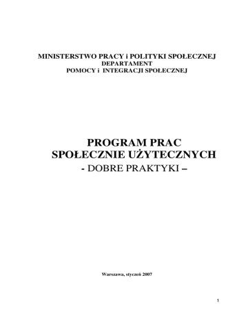 MINISTERSTWO PRACY i POLITYKI SPOŁECZNEJ DEPARTAMENT POMOCY i INTEGRACJI SPOŁECZNEJ PROGRAM PRAC SPOŁECZNIE UŻYTECZNYCH - DOBRE PRAKTYKI – Warszawa, styczeń 2007 1 Opracowanie: Wydział Aktywnych Form Pomocy, Departamentu Pomocy i Integracji Społecznej, Ministerstwa Pracy i Polityki Społecznej pod kierunkiem: Bogdana Sochy, Podsekretarza Stanu, Krystyny Wyrwickiej, Zastępcy Dyrektora Departamentu COPYRGHT BY: Ministerstwo Pracy i Polityki Społecznej, 00-513 Warszawa, ul. Nowogrodzka 1/3/5 ISBN ............................................................ Zakład Wydawniczo-Poligraficzny, Ministerstwa Pracy i Polityki Społecznej 00-502 Warszawa, ul. Bracka 4 2 Szanowni Państwo, Rok 2006 był okresem pierwszych doświadczeń w korzystaniu przez samorządy gminne z programów prac społecznie użytecznych w aktywizowaniu osób zaliczanych do kategorii szczególnego ryzyka wykluczenia społecznego. Ta, aktywna forma pomocy osobom będącym w najtrudniejszej sytuacji na rynku pracy – osoby bezrobotne, pozbawione prawa do zasiłku, korzystające ze świadczeń pomocy społecznej – wprowadzona została do pakietu instrumentów aktywizacji społeczno-zawodowej z dniem 1 listopada 2005r., na podstawie przepisów ustawy z dnia 28 lipca 2005r. o zmianie ustawy o promocji zatrudnienia i instytucjach rynku pracy oraz zmianie niektórych ustawy (Dz. U. Nr 64, poz. 1366). Inicjatorem programów prac społecznie użytecznych (dalej: skrót PSU) jest samorząd gminy, który wykorzystując własne jednostki organizacyjne (ośrodki pomocy społecznej), przy współpracy z pracodawcami oraz powiatowym urzędem pracy, planuje oraz organizuje konkretne rodzaje tych prac w interesie społeczności lokalnej. Doświadczenia samorządów gminnych z 2006r., które zdecydowały się na skorzystanie z tej formy aktywizacji przyczyniły się do wypracowania w kraju dwóch modeli organizacyjnych PSU, a także pozwoliły ustalić zestaw rodzajów prac, tryb ich przebiegu. W opinii samorządów gminnych, pracowników ośrodków pomocy społecznej oraz samych zainteresowanych, ten instrument okazał się cennym narzędziem aktywizacji społeczno-zawodowej. Pomógł on w wielu przypadkach „wyciągnąć z domu”, po bardzo długim czasie osoby bezrobotne, korzystające ze świadczeń pomocy społecznej i włączyć je w „rytm dnia pracy”. To pierwszy plus tej aktywnej formy pomocy. Drugą pozytywną cechą stała się możliwość kontaktu takich osób z pracodawcami, a głównie możliwość „bliższej obserwacji” przez pracodawców postaw osób, skierowanych do programów PSU. Pozytywne oceny dotyczące postawy osób wykonujących prace społecznie użyteczne doprowadziły w wielu przypadkach do uzyskania przez te osoby zatrudnienia (umów o pracę). Minister Pracy i Polityki Społecznej przeprowadził w 2006r. dwa konkursy wśród samorządów gmin, organizujących programu PSU, w wyniku których uzyskano katalog dobrych praktyk tej aktywnej formy pomocy. Dla poszerzenia praktycznej wiedzy na temat programów prac społecznie użytecznych opracowano II edycję materiału informacyjnego o charakterze szkoleniowym. Pierwsza ukazała się na początku 2006r. pod nazwą: Organizacja prac społecznie użytecznych – pytania i odpowiedzi. Obecna jest poszerzeniem wiedzy, szczególnie w kontekście wskazania dobrych praktyk organizatorskich. Wyrażamy nadzieję, że wzorem poprzedniej stanie się ona potrzebnym zbiorem informacji dla tych, którzy chcą we właściwy sposób uaktywniać osoby zagrożone wykluczeniem społecznym, tym samym zmniejszając obszar bezrobocia i ubóstwa w kraju. /- / Zespół Redakcyjny 3 CZĘŚĆ I: OGÓLNE INFORMACJE SPOŁECZNIE UŻYTECZNYCH I.1 UWARUNKOWANIA UŻYTECZNYUCH PRAWNE O PRAC PRACACH SPOŁECZNIE I.1.1 WYPIS Z USTAWY Z DNIA 20 KWIETNIA 2004 R. O PROMOCJI ZATRUDNIENIA I INSTYTUCJACH RYNKU PRACY (DZ. U. NR 99, POZ. 1001, Z PÓŹN. ZM.): Art.2 ust.1 pkt 23 a Prace społecznie użyteczne- oznacza to prace wykonywane przez bezrobotnych bez prawa do zasiłku na skutek skierowania przez starostę, organizowane przez gminę w jednostkach organizacyjnych pomocy społecznej, organizacjach lub instytucjach statutowo zajmujących się pomocą charytatywną lub na rzecz społeczności lokalnej; art. 73a. (117) 1. Na wniosek gminy starosta może skierować bezrobotnego bez prawa do zasiłku korzystającego ze świadczeń z pomocy społecznej do wykonywania prac społecznie użytecznych w miejscu zamieszkania lub pobytu w wymiarze do 10 godzin w tygodniu. 2. Wykonywanie prac społecznie użytecznych odbywa się na podstawie porozumienia zawartego między starostą a gminą, na rzecz której prace społecznie użyteczne będą wykonywane. 3. Bezrobotnemu nieposiadającemu prawa do zasiłku przysługuje świadczenie w wysokości nie niższej niż 6 zł za każdą godzinę wykonywania prac społecznie użytecznych. Świadczenie podlega waloryzacji na zasadach określonych w art. 72 ust. 6. 4. Świadczenie nie przysługuje za okres niewykonywania pracy, udokumentowanej niezdolności do pracy. w tym za okres 5. Starosta refunduje gminie ze środków Funduszu Pracy do 60 % minimalnej kwoty świadczenia przysługującego bezrobotnemu. 6. Minister właściwy do spraw pracy określi, w drodze rozporządzenia, szczegółowy sposób i tryb organizowania prac społecznie użytecznych, w tym warunki ustalania świadczenia, o którym mowa w ust. 3, uwzględniając dobro społeczności lokalnej, potrzeby aktywizacji osób bezrobotnych oraz konieczność zapewnienia pomocy finansowej bezrobotnym bez prawa do zasiłku. Art.3. (20) Badania lekarskie mające na celu stwierdzenie zdolności bezrobotnego do wykonywania pracy, odbywania stażu, przygotowania zawodowego w miejscu pracy, wykonywania prac społecznie użytecznych lub wykonywania pracy na podstawie umowy aktywizacyjnej, o której mowa w art. 61c ust. 1, przeprowadzają, na wniosek powiatowego urzędu pracy, lekarze ubezpieczenia zdro
