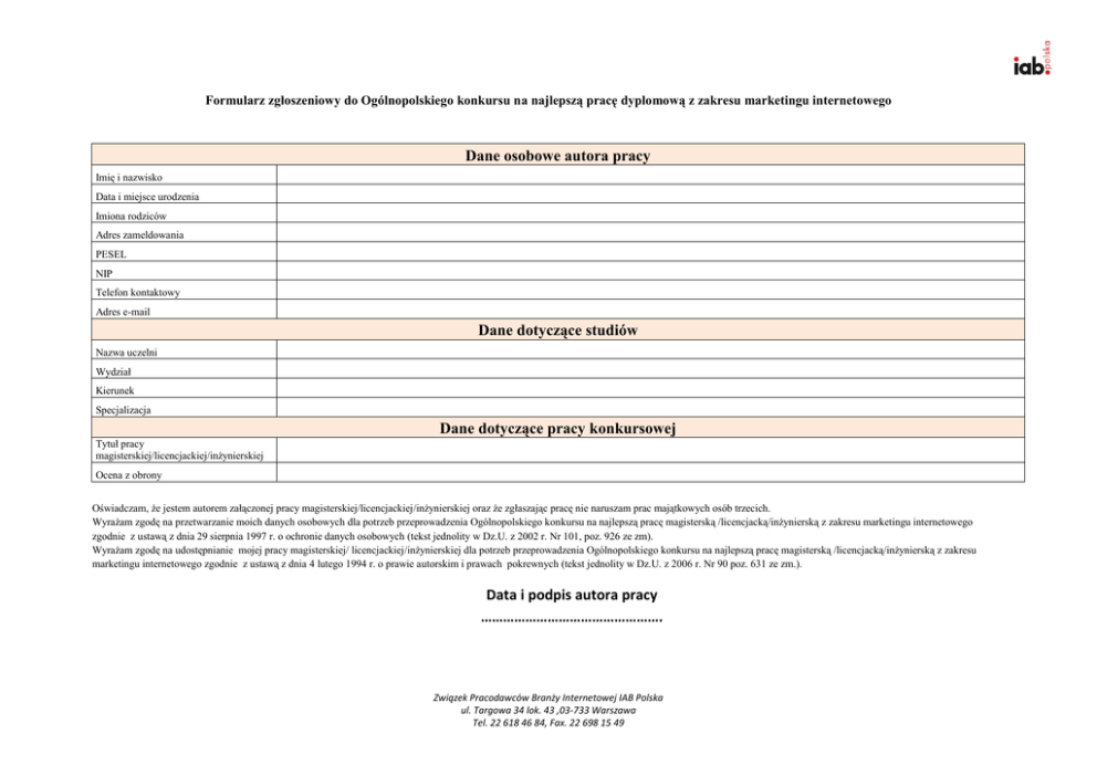 Formularz zgłoszeniowy do Ogólnopolskiego konkursu na najlepszą pracę dyplomową z zakresu marketingu internetowego Dane osobowe autora pracy Imię i nazwisko Data i miejsce urodzenia Imiona rodziców Adres zameldowania PESEL NIP Telefon kontaktowy Adres e-mail Dane dotyczące studiów Nazwa uczelni Wydział Kierunek Specjalizacja Dane dotyczące pracy konkursowej Tytuł pracy magisterskiej/licencjackiej/inżynierskiej Ocena z obrony Oświadczam, że jestem autorem załączonej pracy magisterskiej/licencjackiej/inżynierskiej oraz że zgłaszając pracę nie naruszam prac majątkowych osób trzecich. Wyrażam zgodę na przetwarzanie moich danych osobowych dla potrzeb przeprowadzenia Ogólnopolskiego konkursu na najlepszą pracę magisterską /licencjacką/inżynierską z zakresu marketingu internetowego zgodnie z ustawą z dnia 29 sierpnia 1997 r. o ochronie danych osobowych (tekst jednolity w Dz.U. z 2002 r. Nr 101, poz. 926 ze zm). Wyrażam zgodę na udostępnianie mojej pracy magisterskiej/ licencjackiej/inżynierskiej dla potrzeb przeprowadzenia Ogólnopolskiego konkursu na najlepszą pracę magisterską /licencjacką/inżynierską z zakresu marketingu internetowego zgodnie z ustawą z dnia 4 lutego 1994 r. o prawie autorskim i prawach pokrewnych (tekst jednolity w Dz.U. z 2006 r. Nr 90 poz. 631 ze zm.). Data i podpis autora pracy …………………………………………. Związek Pracodawców Branży Internetowej IAB Polska ul. Targowa 34 lok. 43 ,03-733 Warszawa Tel. 22 618 46 84, Fax. 22 698 15 49