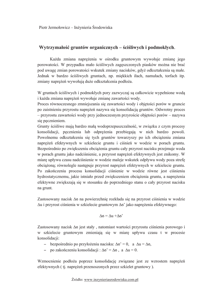 Piotr Jermołowicz – Inżynieria Środowiska Wytrzymałość gruntów organicznych – ściśliwych i podmokłych. Każda zmiana naprężenia w ośrodku gruntowym wywołuje zmianę jego porowatości. W przypadku mało ściśliwych zagęszczonych piasków można nie brać pod uwagę zmian porowatości wskutek zmiany nacisków, gdyż odkształcenia są małe. Jednak w bardzo ściśliwych gruntach, np. miękkich iłach, namułach, torfach itp. zmiany naprężeń wywołują duże odkształcenia podłoża. W gruntach ściśliwych i podmokłych pory zazwyczaj są całkowicie wypełnione wodą i każda zmiana naprężeń wywołuje zmianę zawartości wody. Proces równoczesnego zmniejszania się zawartości wody i objętości porów w gruncie po zaistnieniu przyrostu naprężeń nazywa się konsolidacją gruntów. Odwrotny proces – przyrostu zawartości wody przy jednoczesnym przyroście objętości porów – nazywa się pęcznieniem. Grunty ściśliwe mają bardzo małą wodoprzepuszczalność, w związku z czym procesy konsolidacji, pęcznienia lub odprężenia przebiegają w nich bardzo powoli. Powolnemu odkształceniu się tych gruntów towarzyszy po ich obciążeniu zmiana naprężeń efektywnych w szkielecie gruntu i ciśnień w wodzie w porach gruntu. Bezpośrednio po zwiększeniu obciążenia gruntu cały przyrost nacisku przejmuje woda w porach gruntu jako nadciśnienie, a przyrost naprężeń efektywnych jest znikomy. W miarę upływu czasu nadciśnienie w wodzie maleje wskutek odpływu wody poza strefę obciążoną; równolegle następuje przyrost naprężeń efektywnych w szkielecie gruntu. Po zakończeniu procesu konsolidacji ciśnienie w wodzie równe jest ciśnieniu hydrostatycznemu, jakie istniało przed zwiększeniem obciążenia gruntu, a naprężenia efektywne zwiększają się w stosunku do poprzedniego stanu o cały przyrost nacisku na grunt. Zastosowany nacisk ∆ϭ na powierzchnię rozkłada się na przyrost ciśnienia w wodzie ∆u i przyrost ciśnienia w szkielecie gruntowym ∆ϭ’ jako naprężenia efektywnego: ∆ϭ = ∆u +∆ϭ’ Zastosowany nacisk ∆ϭ jest stały , natomiast wartości przyrostu ciśnienia porowego i w szkielecie gruntowym zmieniają się w miarę upływu czasu t w procesie konsolidacji: −! bezpośrednio po przyłożeniu nacisku: ∆ϭ’ = 0, a ∆u = ∆ϭ, −! po zakończeniu konsolidacji : ∆ϭ’ = ∆ϭ , a ∆u = 0. Wzmocnienie podłoża poprzez konsolidację związane jest ze wzrostem naprężeń efektywnych ( tj. naprężeń przenoszonych przez szkielet gruntowy ). Źródło: www.inzynieriasrodowiska.com.pl Z tego względu wytrzymałość gruntów organicznych często opisuje się równaniem Coulomba – Hvorsleva : τt = (σn – u(t) ) tgØ' + c' (1) gdzie : σn – normalne naprężenie całkowite, u(t) – ciśnienie porowe ( przenoszone przez wodę ), Ø’ - efektywny kąt tarcia wewnętrznego, c' – efektywna spójność. Opis wytrzymałości z użyciem naprężeń efektywnych ( σn – u(t) ) dla słabych podłoży, zwłaszcza dla gruntów organicznych jest znacznie utrudniony. Występują bowiem trudności przy prognozowaniu rozkładu ciśnień wody w porach gruntu i wartości efektywnych parametrów wytrzymałościowych oraz kontrolowaniu ciśnienia wody w podłożu podczas budowy nasypu. Z tego względu opis wytrzymałości gruntów organicznych przeprowadza się z użyciem naprężeń całkowitych. Przy szybkim obciążeniu gruntu, gdy σn = u(t) , z równania (1) widać, że : τf = cu gdzie : cu – spójność Przy takim założeniu wartość τfmax wyznaczona sondą krzyżakową w badaniach terenowych odpowiada spójności cu określonej w aparacie trójosiowym. Wartość wytrzymałości na ścinanie torfów, wyznaczona w terenie sondą krzyżakową zależy między innymi od niejednorodności strukturalnej torfów, wobec czego zaleca się przyjmowanie obliczeniowej wartości τf(r) τf(r) = µ τtmax gdzie : µ = 0,45 dla torfów słabo rozłożonych µ = 0,55 dla torfów średnio rozłożonych τtmax - wytrzymałość uzyskana z badań sondą krzyżakową. Nośność graniczna słabego podłoża, tym samym stateczność nasypu wg Wiłuna można obliczyć ze wzoru : qf = 5,7 cu + γh · ht lub wg Janbu : qf = 5,55 cu gdzie : cu = τt – wytrzymałość przy szybkim ścinaniu ( bez odpływu ) słabego podłoża, γh – ciężar objętościowy gruntu między rzędną terenu a stropem słabej warstwy, kN/m3 ht - zagłębienie stropu słabej warstwy od powierzchni terenu. Źródło: www.inzynieriasrodowiska.com.pl Wiłun zaleca przyjmować „globalny” współczynnik bezpieczeństwa F = 1,2 – 1,5. Naprężenia graniczne porównuje się z naprężeniem σz działającym w stropie słabej warstwy, wyznaczając współczynnik pewności F : !" #$% #& Przy projektowaniu nasypu w końcowej fazie jego budowy w wartości σz oprócz ciężaru własnego nasypu należy również uwzględnić obciążenie użytkowe. Według Eurokodu 7 dla obciążenia pionowego i nasypu ( B/L ≈ 0 ) opór graniczny słabego podłoża (Øu ≈ 0 ) wynosi: qf = 5,14 cu + DγD gdzie : D - zagłębienie nasypu poniżej poziomu terenu , m, γD – ciężar objętościowy gruntu w strefie D, kN/m3. Opór graniczny pod nasypem dla gruntu normalnie skonsolidowanego wg Eurokodu 7 : qf = γDDNq + 0,5BγBNγ gdzie : Nq, Nγ - współczynnik nośności B – szerokość podstawy nasypu, m, γB - ciężar objętościowy słabego gruntu, kN/m3. Opór graniczny gruntu prekonsolidowanego ( c' ≠ 0, Ø' ≠ 0 ) według Eurokodu 7 wynosi : qf = c' Nc +γDDNq + 0,5BγBNγ W przypadku gdy Ø > 10o należy stosować wzór : qf = c Nc +γh ht Nq + γ b’ Nγ gdzie : γh – ciężar objętościowy gruntu między pow. terenu, a stropem słabej warstwy, ht – zagłębienie stropu słabej warstwy od pow, terenu, γ – ciężar objętościowy gruntu słabej warstwy (z uwzględnieniem wyporu wody) b’ – rzut poziomy skarpy nasypu Źródło: www.inzynier