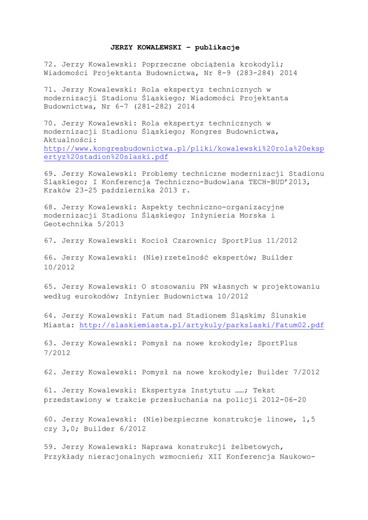 JERZY KOWALEWSKI – publikacje 72. Jerzy Kowalewski: Poprzeczne obciążenia krokodyli; Wiadomości Projektanta Budownictwa, Nr 8-9 (283-284) 2014 71. Jerzy Kowalewski: Rola ekspertyz technicznych w modernizacji Stadionu Śląskiego; Wiadomości Projektanta Budownictwa, Nr 6-7 (281-282) 2014 70. Jerzy Kowalewski: Rola ekspertyz technicznych w modernizacji Stadionu Śląskiego; Kongres Budownictwa, Aktualności: http://www.kongresbudownictwa.pl/pliki/kowalewski%20rola%20eksp ertyz%20stadion%20slaski.pdf 69. Jerzy Kowalewski: Problemy techniczne modernizacji Stadionu Śląskiego; I Konferencja Techniczno-Budowlana TECH-BUD’2013, Kraków 23-25 października 2013 r. 68. Jerzy Kowalewski: Aspekty techniczno-organizacyjne modernizacji Stadionu Śląskiego; Inżynieria Morska i Geotechnika 5/2013 67. Jerzy Kowalewski: Kocioł Czarownic; SportPlus 11/2012 66. Jerzy Kowalewski: (Nie)rzetelność ekspertów; Builder 10/2012 65. Jerzy Kowalewski: O stosowaniu PN własnych w projektowaniu według eurokodów; Inżynier Budownictwa 10/2012 64. Jerzy Kowalewski: Fatum nad Stadionem Śląskim; Ślunskie Miasta: http://slaskiemiasta.pl/artykuly/parkslaski/Fatum02.pdf 63. Jerzy Kowalewski: Pomysł na nowe krokodyle; SportPlus 7/2012 62. Jerzy Kowalewski: Pomysł na nowe krokodyle; Builder 7/2012 61. Jerzy Kowalewski: Ekspertyza Instytutu ……; Tekst przedstawiony w trakcie przesłuchania na policji 2012-06-20 60. Jerzy Kowalewski: (Nie)bezpieczne konstrukcje linowe, 1,5 czy 3,0; Builder 6/2012 59. Jerzy Kowalewski: Naprawa konstrukcji żelbetowych, Przykłady nieracjonalnych wzmocnień; XII Konferencja Naukowo- Badawcza Warsztat Pracy Rzeczoznawcy Budowlanego, KielceCedzyna 16-18 maja 2012 r. 58. Jerzy Kowalewski, Paweł Sulik: Praktyczne aspekty przygotowania opinii technicznych w orzecznictwie sądowym; Główny Urząd Nadzoru Budowlanego, Ogólnopolska Konferencja, Warszawa, 10-11 stycznia 2012 r. 57. Jerzy Kowalewski: Niestatyczne obciążenia próbne konstrukcji budynków; Przegląd Budowlany 10/2011 56. Jerzy Kowalewski: Perpetuum mobile czy poważny wynalazek, Sprawy nauki, Nr 11/154 listopad 2010 Wydanie elektroniczne WWW.sprawynauki.edu.pl 55. Jerzy Kowalewski: Krytycznie o monitoringu bezpieczeństwa konstrukcji budowlanych, VII Konferencja Problemy Przygotowania i Realizacji Inwestycji Budowlanych, Puławy 2010 54. Jerzy Kowalewski: Obciążenia próbne w diagnostyce konstrukcji budynków, Przegląd Budowlany 10/2010 53. Jerzy Kowalewski: Obciążenia próbne w diagnostyce konstrukcji budynków, 56 Konferencja Naukowa, Krynica 2010 52. Jerzy Kowalewski: Ocena wytrzymałości betonu na podstawie badań sklerometrycznych, Inżynier Budownictwa 9/2010 51. Jerzy Kowalewski: Procedury i oceny w obciążeniach próbnych, Materiały Budowlane 6/2010 50. Jerzy Kowalewski, Paweł Sulik: Wiarygodność i skuteczność monitoringu bezpieczeństwa konstrukcji budowlanych, XI Konferencja naukowo-techniczna „Problemy rzeczoznawstwa budowlanego” Warszawa 14-16 kwietnia 2010 r. 49. Jerzy Kowalewski: Obciążenia próbne konstrukcji budynków, Builder 03/2010 48. Jerzy Kowalewski: Monitorowanie bezpieczeństwa, Builder 12/2009 47. Jerzy Kowalewski: Nietypowe połączenie żelbetowe belka-słup; Inżynier Budownictwa 11/2009 46. Jerzy Kowalewski: Obciążenia próbne stropów; Przegląd Budowlany 11/2009 45. Jerzy Kowalewski: O pewnych aspektach obciążeń próbnych; Problemy przygotowania i realizacji inwestycji, Puławy 10-21 października 2009 44. Jerzy Kowalewski: Technologia wykonywania obciążeń próbnych; Inżynier Budownictwa 7-8/2009 43. Jerzy Kowalewski: Automatyczne monitorowanie zagrożeń konstrukcji budowlanych; Przegląd Budowlany 7-8/2009 42. Jerzy Kowalewski: Awaria warstwy elewacyjnej ściany trójwarstwowej; XXIV Konferencja naukowo-techniczna, Awarie budowlane, Międzyzdroje 26-29 maja 2009 41. Jerzy Kowalewski: Ulica Niespełnionych Nadziei, Builder 4/2009 40. Jerzy Kowalewski: Biurokratyczne perpetuum mobile, Przegląd Budowlany 10/2008 39. Jerzy Kowalewski: Monitorowanie zagrożeń konstrukcji budowlanych z wykorzystaniem automatycznych systemów; X Konferencja Naukowo-Techniczna Problemy Rzeczoznawstwa Budowlanego, Warszawa Miedzeszyn, 22-24 kwietnia 2008 r. 38. L. Runkiewicz, J. Kowalewski: O pracach diagnostycznych konstrukcji dawnej elektrowni tramwajowej – obecnie Muzeum Powstania Warszawskiego; Inżynieria i Budownictwo 9/2007 37. Leonard Runkiewicz, Jerzy Kowalewski: Ochrona i monitorowanie budynków znajdujących się w sąsiedztwie nowo powstających obiektów budowlanych (plomb); IX Konferencja Naukowo-Techniczna Problemy Rzeczoznawstwa Budowlanego Cedzyna 24-26 kwietnia 2006 36. Runkiewicz L., Kowalewski J.: Rzeczoznawcy budowlani – usytuowanie prawne oraz rola i zadania w budownictwie ; Przegląd Budowlany 4/2006 35. Leonard Runkiewicz, Jerzy Kowalewski: Podstawy prawne oraz metodologia postępowania przy naprawach, wzmacnianiu i rozbiórkach konstrukcji żelbetowych; XXI OGÓLNOPOLSKA KONFERENCJA WARSZTAT PRACY PROJEKTANTA KONSTRUKCJI Szczyrk, 811 marca 2006r. 34. Jerzy Kowalewski: Projekt ustawy o wyrobach budowlanych; portal internetowy IPIS.pl 33. Kowalewski J.: Dalej do Unii; Home & Market 3/2004 (140) 32. Kowalewski J.: Krytyczne uwagi do projektu ustawy o wyrobach budowlanych; Budownictwo i Prawo 6/03 i1/04 31. Jerzy Kowalewski: Krytyczne uwagi o projekcie ustawy o wyrobach budowlanych (projekt rządowy 2003.12.03).; portale internetowe: 1) Dziennik Budowy, 2) Kongres Budownictwa, Ekspertyzy i opinie 3) IPIS.pl 30. Kowalewski J.: Usługi budowlane jako przedmiot certyfikacji; Poradnik Inspektora Nadzoru, Kierownika Budowy i Inwestora, 9/02, WACETOB 29. Kowalewski J,: Certyfikacja usług budowlanych; Przegląd Budowlany; 7-8/2002 28. Kowalewski J.: Certyfikacja usług budowlanych w Instytucie Techniki Budowlanej; Prace Instytutu Techniki Budowlanej 2 (122) 2002 27. Kowalewski J.: Wbudowane „na lewo”; Przegląd Budowlany 5/2002 26. Kowalewski J.: Wbudow