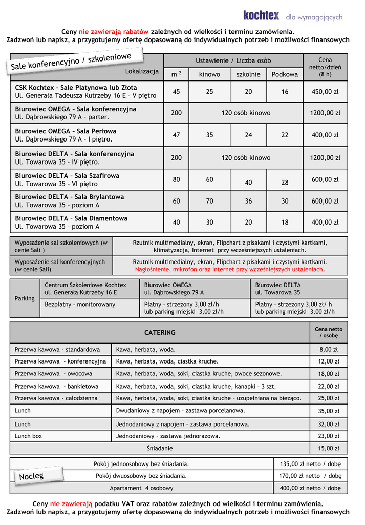 Ceny nie zawierają rabatów zależnych od wielkości i terminu zamówienia. Zadzwoń lub napisz, a przygotujemy ofertę dopasowaną do indywidualnych potrzeb i możliwości finansowych kinowo szkolnie Podkowa Cena netto/dzień (8 h) 25 20 16 450,00 zł Ustawienie / Liczba osób Lokalizacja m 2 CSK Kochtex – Sale Platynowa lub Złota Ul. Generała Tadeusza Kutrzeby 16 E – V piętro 45 Biurowiec OMEGA – Sala konferencyjna Ul. Dąbrowskiego 79 A – parter. 200 Biurowiec OMEGA – Sala Perłowa Ul. Dąbrowskiego 79 A – I piętro. 47 Biurowiec DELTA - Sala konferencyjna Ul. Towarowa 35 – IV piętro. 200 Biurowiec DELTA – Sala Szafirowa Ul. Towarowa 35 – VI piętro 80 60 40 28 600,00 zł Biurowiec DELTA – Sala Brylantowa Ul. Towarowa 35 – poziom A 60 70 36 30 600,00 zł Biurowiec DELTA – Sala Diamentowa Ul. Towarowa 35 – poziom A 40 30 20 18 400,00 zł 120 osób kinowo 35 24 1200,00 zł 22 120 osób kinowo 400,00 zł 1200,00 zł Wyposażenie sal szkoleniowych (w cenie Sali ) Rzutnik multimedialny, ekran, Flipchart z pisakami i czystymi kartkami, klimatyzacja, Internet przy wcześniejszych ustaleniach. Wyposażenie sal konferencyjnych (w cenie Sali) Rzutnik multimedialny, ekran, Flipchart z pisakami i czystymi kartkami. Nagłośnienie, mikrofon oraz Internet przy wcześniejszych ustaleniach. Parking Centrum Szkoleniowe Kochtex ul. Generała Kutrzeby 16 E Biurowiec OMEGA ul. Dąbrowskiego 79 A Biurowiec DELTA ul. Towarowa 35 Bezpłatny – monitorowany Płatny – strzeżony 3,00 zł/h lub parking miejski 3,00 zł/h Płatny – strzeżony 3,00 zł/ h lub parking miejski 3,00 zł/h Cena netto / osobę CATERING Przerwa kawowa - standardowa Kawa, herbata, woda. 8,00 zł Przerwa kawowa - konferencyjna Kawa, herbata, woda, ciastka kruche. 12,00 zł Przerwa kawowa - owocowa Kawa, herbata, woda, soki, ciastka kruche, owoce sezonowe. 18,00 zł Przerwa kawowa - bankietowa Kawa, herbata, woda, soki, ciastka kruche, kanapki – 3 szt. 22,00 zł Przerwa kawowa - całodzienna Kawa, herbata, woda, soki, ciastka kruche – uzupełniana na bieżąco. 25,00 zł Lunch Dwudaniowy z napojem – zastawa porcelanowa. 35,00 zł Lunch Jednodaniowy z napojem – zastawa porcelanowa. 32,00 zł Lunch box Jednodaniowy – zastawa jednorazowa. 23,00 zł Śniadanie 15,00 zł Pokój jednoosobowy bez śniadania. 135,00 zł netto / dobę Pokój dwuosobowy bez śniadania. 170,00 zł netto / dobę Apartament 4 osobowy 400,00 zł netto / dobę Ceny nie zawierają podatku VAT oraz rabatów zależnych od wielkości i terminu zamówienia. Zadzwoń lub napisz, a przygotujemy ofertę dopasowaną do indywidualnych potrzeb i możliwości finansowych