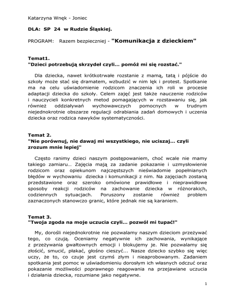Katarzyna Wnęk - Joniec DLA: SP 24 w Rudzie Śląskiej. PROGRAM: Razem bezpieczniej - "Komunikacja z dzieckiem" Temat1. "Dzieci potrzebują skrzydeł czyli… pomóż mi się rozstać." Dla dziecka, nawet krótkotrwałe rozstanie z mamą, tatą i pójście do szkoły może stać się dramatem, wzbudzić w nim lęk i protest. Spotkanie ma na celu uświadomienie rodzicom znaczenia ich roli w procesie adaptacji dziecka do szkoły. Celem zajęć jest także nauczenie rodziców i nauczycieli konkretnych metod pomagających w rozstawaniu się, jak również oddziaływań wychowawczych pomocnych w trudnym niejednokrotnie obszarze regulacji odrabiania zadań domowych i uczenia dziecka oraz rodzica nawyków systematyczności. Temat 2. "Nie porównuj, nie dawaj mi wszystkiego, nie uciszaj… czyli zrozum mnie lepiej" Często ranimy dzieci naszym postępowaniem, choć wcale nie mamy takiego zamiaru… Zajęcia mają za zadanie pokazanie i uzmysłowienie rodzicom oraz opiekunom najczęstszych nieświadomie popełnianych błędów w wychowaniu dziecka i komunikacji z nim. Na zajęciach zostaną przedstawione oraz szeroko omówione prawidłowe i nieprawidłowe sposoby reakcji rodziców na zachowanie dziecka w różnorakich, codziennych sytuacjach. Poruszony zostanie również problem zaznaczonych stanowczo granic, które jednak nie są karaniem. Temat 3. "Twoja zgoda na moje uczucia czyli… pozwól mi tupać!" My, dorośli niejednokrotnie nie pozwalamy naszym dzieciom przeżywać tego, co czują. Oceniamy negatywnie ich zachowania, wynikające z przeżywania gwałtownych emocji i blokujemy je. Nie pozwalamy się złościć, smucić, płakać, głośno cieszyć... Nasze dziecko szybko się więc uczy, że to, co czuje jest czymś złym i nieaprobowanym. Zadaniem spotkania jest pomoc w uświadomieniu dorosłym ich własnych odczuć oraz pokazanie możliwości poprawnego reagowania na przejawiane uczucia i działania dziecka, rozumiane jako negatywne. 1 Temat4. "Dzieci potrzebują korzeni czyli… o tajemnicy konsekwencji" Rodzice i nauczyciele wielokrotnie postawieni w obliczu uporu dziecka, powtarzają bez skutku mnóstwo razy te same zdania czy polecenia. Jak nie być bezsilnym wobec stanowczości dziecka? Spotkanie to dotyczy wychowawczego znaczenia wyznaczania granic. Konsekwencja, jako jedyna alternatywa kary, omówiona zostanie także jako środek zapoczątkowujący kształtowanie norm i systemu wartości u dziecka, zarysowujący obszar w którym z wzajemnym szacunkiem poruszać się mogą wszyscy członkowie komunikacji. Wychowawcy i rodzice będą mieli okazję nauczenia się zwracania uwagi dziecku oraz egzekwowania poleceń w sposób nie naznaczający - nie naruszający poczucia godności i własnej wartości dziecka. Temat 5: "Lepiej rozumiem - mądrzej kocham" Spotkanie dotyczące umiejętności świadomego słuchania siebie nawzajem w relacji. Słuchamy uważnie czy - tylko słyszymy? Słuchanie jest podstawą dobrej, skutecznej komunikacji między dorosłymi, a dzieckiem. To spotkanie o różnych sposobach słuchania, słyszenia i wzajemnego (nie) rozumienia. Uczestnicy będą mieli okazję do przećwiczenia tzw. słuchania wspierającego oraz poznania korzyści płynących z siły pozytywnych komunikatów. Ta część szkolenia dotyczyć będzie też ważnego tematu Potrzeb małego człowieka. Omówione i przypomniane zostaną potrzeby bezpieczeństwa, akceptacji, miłości, ale także te bardziej szczegółowe, jak potrzeba doświadczania i potrzeba odrębności. Katarzyna Wnęk - Joniec Instytut Psychologii UJ, Klinika Neonatologii SU Kraków. 2