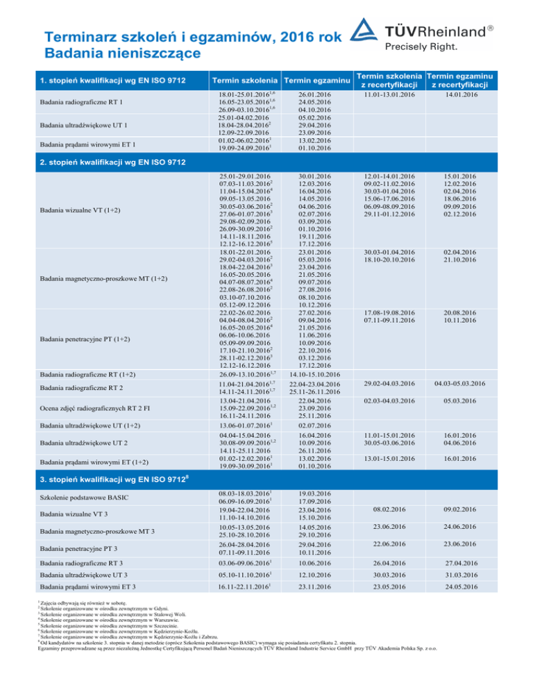 Terminarz szkoleń i egzaminów, 2016 rok Badania nieniszczące 1. stopień kwalifikacji wg EN ISO 9712 Termin szkolenia Termin egzaminu Termin szkolenia Termin egzaminu z recertyfikacji z recertyfikacji 18.01-25.01.20161,6 16.05-23.05.20161,6 26.09-03.10.20161,6 25.01-04.02.2016 18.04-28.04.20162 12.09-22.09.2016 01.02-06.02.20161 19.09-24.09.20161 26.01.2016 24.05.2016 04.10.2016 05.02.2016 29.04.2016 23.09.2016 13.02.2016 01.10.2016 11.01-13.01.2016 14.01.2016 25.01-29.01.2016 07.03-11.03.20162 11.04-15.04.20164 09.05-13.05.2016 30.05-03.06.20162 27.06-01.07.20163 29.08-02.09.2016 26.09-30.09.20162 14.11-18.11.2016 12.12-16.12.20165 18.01-22.01.2016 29.02-04.03.20162 18.04-22.04.20163 16.05-20.05.2016 04.07-08.07.20164 22.08-26.08.20162 03.10-07.10.2016 05.12-09.12.2016 22.02-26.02.2016 04.04-08.04.20162 16.05-20.05.20164 06.06-10.06.2016 05.09-09.09.2016 17.10-21.10.20162 28.11-02.12.20163 12.12-16.12.2016 26.09-13.10.20161,7 11.04-21.04.20161,7 14.11-24.11.20161,7 13.04-21.04.2016 15.09-22.09.20161,2 16.11-24.11.2016 30.01.2016 12.03.2016 16.04.2016 14.05.2016 04.06.2016 02.07.2016 03.09.2016 01.10.2016 19.11.2016 17.12.2016 23.01.2016 05.03.2016 23.04.2016 21.05.2016 09.07.2016 27.08.2016 08.10.2016 10.12.2016 27.02.2016 09.04.2016 21.05.2016 11.06.2016 10.09.2016 22.10.2016 03.12.2016 17.12.2016 14.10-15.10.2016 22.04-23.04.2016 25.11-26.11.2016 22.04.2016 23.09.2016 25.11.2016 12.01-14.01.2016 09.02-11.02.2016 30.03-01.04.2016 15.06-17.06.2016 06.09-08.09.2016 29.11-01.12.2016 15.01.2016 12.02.2016 02.04.2016 18.06.2016 09.09.2016 02.12.2016 30.03-01.04.2016 18.10-20.10.2016 02.04.2016 21.10.2016 17.08-19.08.2016 07.11-09.11.2016 20.08.2016 10.11.2016 29.02-04.03.2016 04.03-05.03.2016 02.03-04.03.2016 05.03.2016 13.06-01.07.20161 02.07.2016 04.04-15.04.2016 30.08-09.09.20161,2 14.11-25.11.2016 01.02-12.02.20161 19.09-30.09.20161 16.04.2016 10.09.2016 26.11.2016 13.02.2016 01.10.2016 11.01-15.01.2016 30.05-03.06.2016 16.01.2016 04.06.2016 13.01-15.01.2016 16.01.2016 08.03-18.03.20161 06.09-16.09.20161 19.04-22.04.2016 11.10-14.10.2016 10.05-13.05.2016 25.10-28.10.2016 26.04-28.04.2016 07.11-09.11.2016 19.03.2016 17.09.2016 23.04.2016 15.10.2016 14.05.2016 29.10.2016 29.04.2016 10.11.2016 08.02.2016 09.02.2016 23.06.2016 24.06.2016 22.06.2016 23.06.2016 03.06-09.06.20161 10.06.2016 26.04.2016 27.04.2016 Badania ultradźwiękowe UT 3 05.10-11.10.2016 1 12.10.2016 30.03.2016 31.03.2016 Badania prądami wirowymi ET 3 16.11-22.11.20161 23.11.2016 23.05.2016 24.05.2016 Badania radiograficzne RT 1 Badania ultradźwiękowe UT 1 Badania prądami wirowymi ET 1 2. stopień kwalifikacji wg EN ISO 9712 Badania wizualne VT (1+2) Badania magnetyczno-proszkowe MT (1+2) Badania penetracyjne PT (1+2) Badania radiograficzne RT (1+2) Badania radiograficzne RT 2 Ocena zdjęć radiograficznych RT 2 FI Badania ultradźwiękowe UT (1+2) Badania ultradźwiękowe UT 2 Badania prądami wirowymi ET (1+2) 3. stopień kwalifikacji wg EN ISO 9712 Szkolenie podstawowe BASIC Badania wizualne VT 3 Badania magnetyczno-proszkowe MT 3 Badania penetracyjne PT 3 Badania radiograficzne RT 3 1 8 Zajęcia odbywają się również w sobotę. Szkolenie organizowane w ośrodku zewnętrznym w Gdyni. Szkolenie organizowane w ośrodku zewnętrznym w Stalowej Woli. 4 Szkolenie organizowane w ośrodku zewnętrznym w Warszawie. 5 Szkolenie organizowane w ośrodku zewnętrznym w Szczecinie. 6 Szkolenie organizowane w ośrodku zewnętrznym w Kędzierzynie-Koźlu. 7 Szkolenie organizowane w ośrodku zewnętrznym w Kędzierzynie-Koźlu i Zabrzu. 8 Od kandydatów na szkolenie 3. stopnia w danej metodzie (oprócz Szkolenia podstawowego BASIC) wymaga się posiadania certyfikatu 2. stopnia. Egzaminy przeprowadzane są przez niezależną Jednostkę Certyfikującą Personel Badań Nieniszczących TÜV Rheinland Industrie Service GmbH przy TÜV Akademia Polska Sp. z o.o. 2 3 Cennik szkoleń i egzaminów, 2016 rok Badania nieniszczące 1. stopień kwalifikacji wg EN ISO 9712 Czas szkolenia Cena szkolenia netto* Cena egzaminu netto* Badania radiograficzne RT 1 56 godz. 3175 1750 Badania ultradźwiękowe UT 1 72 godz. 3575 1750 Badania prądami wirowymi ET 1 48 godz. 3850 1850 Badania wizualne VT (1+2) 40 godz. 2650 1550 Recertyfikacja VT 2 24 godz. 1350 1050 Badania magnetyczno-proszkowe MT (1+2) 40 godz. 2650 1550 Recertyfikacja MT 2 24 godz. 1350 1050 Badania penetracyjne PT (1+2) 40 godz. 2650 1550 Recertyfikacja PT 2 24 godz. 1350 1050 Badania radiograficzne RT (1+2) 157 godz. 6750 1750 Badania radiograficzne RT 2 80 godz. 3950 1750 Recertyfikacja RT 2 40 godz. 2350 1250 Ocena zdjęć radiograficznych RT 2 FI 56 godz. 2700 1650 Recertyfikacja RT 2 FI 40 godz. 1700 1050 Badania ultradźwiękowe UT (1+2) 144 godz. 6350 2. stopień kwalifikacji wg EN ISO 9712 1 1750 2 Badania ultradźwiękowe UT 2 80 godz. 4400 /4800 1750 Recertyfikacja UT 2 40 godz. 2350 1250 Badania prądami wirowymi ET (1+2) 88 godz. 4900 1850 Recertyfikacja ET 2 24 godz. 1500 1250 3. stopień kwalifikacji wg EN ISO 9712 Szkolenie podstawowe BASIC 80 godz. 58003 15004 Badania wizualne VT 3 32 godz. 44503 17504 Recertyfikacja VT 3 8 godz. 750 1250 Badania magnetyczno-proszkowe MT 3 32 godz. 4450 Recertyfikacja MT 3 8 godz. 750 Badania penetracyjne PT 3 24 godz. 4350 3 17504 1250 3 17504 Recertyfikacja PT 3 8 godz. 750 1250 Badania radiograficzne RT 3 50 godz. 65003 17504 Recertyfikacja RT 3 8 godz. 750 1250 Badania ultradźwiękowe UT 3 50 godz. 7000 Recertyfikacja UT 3 8 godz. 750 Badania prądami wirowymi ET 3 48 godz. 6750 Recertyfikacja ET 3 8 godz. 750 3 1250 3 1 Cena szkolenia z wykorzystaniem własnego sprzętu. Cena szkolenia z wykorzystaniem sprzętu TÜV Akademia Polska Sp. z o.o. Cena obejmuje zakwaterowanie i pełne wyżywienie w czasie szkolenia. 4 Cena obejmuje zakwaterowanie i pełne wyżywienie w czasie egzaminu oraz przeprowadzenie certyfikacji. *Do ceny należy doliczyć 23% podatku VAT. 2 3 Szkolenia Personelu Badań Nieniszczących ul. Wolności 327 41-8