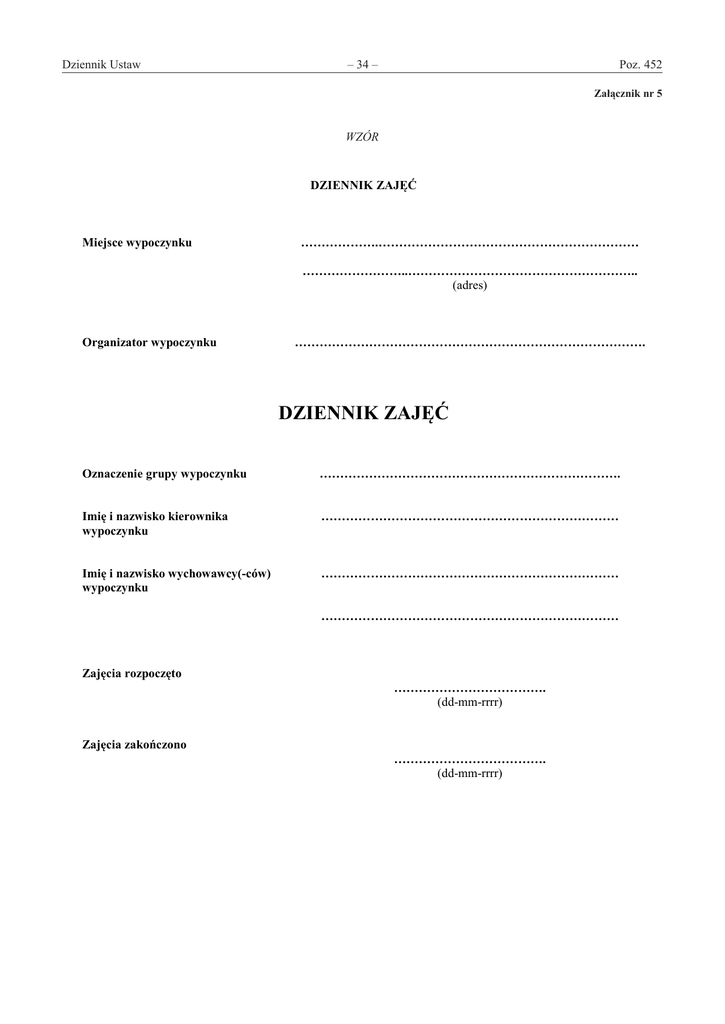 Dziennik Ustaw – 34 – Poz. 452 Załącznik nr 5 WZÓR DZIENNIK ZAJĘĆ Miejsce wypoczynku ……………….……………………………………………………… ……………………..……………………………………………….. (adres) Organizator wypoczynku …………………………………………………………………………. DZIENNIK ZAJĘĆ Oznaczenie grupy wypoczynku ………………………………………………………………. Imię i nazwisko kierownika wypoczynku ……………………………………………………………… Imię i nazwisko wychowawcy(-ców) wypoczynku ……………………………………………………………… ……………………………………………………………… Zajęcia rozpoczęto Zajęcia zakończono ………………………………. (dd-mm-rrrr) ………………………………. (dd-mm-rrrr) Dziennik Ustaw – 35 – Poz. 452 UCZESTNICY GRUPY LP. 1 NAZWISKO I IMIĘ 2 3 4 5 6 7 8 9 10 11 12 13 14 15 16 17 18 19 20 str. 1 ROK URODZENIA Dziennik Ustaw – 36 – Poz. 452 2. TYGODNIOWY PLAN PRACY* TYDZIEŃ ZADANIA DO WYKONANIA TERMIN 1. str. … ––––––––––––––– * Strona do powielania. ODPOWIEDZIALNY ZA WYKONANIE UWAGI O WYKONANIU Dziennik Ustaw DATA, GODZINA – 37 – 3. DZIENNIK ZAJĘĆ* TREŚĆ ZAJĘCIA str. … ––––––––––––––– * Strona do powielania. Poz. 452 UWAGI O PRZEBIEGU ZAJĘĆ (osiągnięcia, trudności, wnioski – podpis prowadzącego zajęcia) Dziennik Ustaw – 38 – Poz. 452 4. UWAGI I ZALECENIA* DATA TREŚĆ PODPIS str. …. ––––––––––––––– * Strona do powielania.