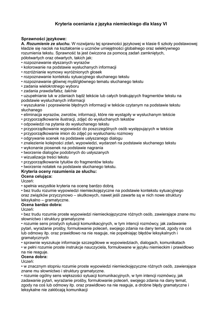Kryteria oceniania z języka niemieckiego dla klasy VI