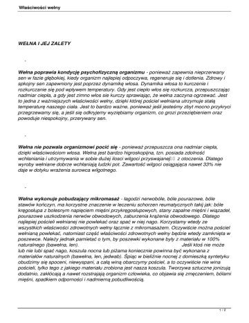 Właściwości wełny WEŁNA I JEJ ZALETY Wełna poprawia kondycję psychofizyczną organizmu - ponieważ zapewnia nieprzerwany sen w fazie głębokiej, kiedy organizm najlepiej odpoczywa, regeneruje się i dotlenia. Zdrowy i spkojny sen zapewniony jest poprzez dynamikę włosa. Dynamika włosa to kurczenie i rozkurczanie się pod wpływem temperatury. Gdy jest ciepło włos się rozkurcza, przepuszczając nadmiar ciepła, a gdy jest zimno włos sie kurczy sprawiając, że wełna zaczyna ogrzewać. Jest to jedna z ważniejszych właściwości wełny, dzięki której pościel wełniana utrzymuje stałą temperaturę naszego ciała. Jest to bardzo ważne, ponieważ jeśli jesteśmy zbyt mocno przykryci przegrzewamy się, a jeśli się odkryjemy wyziębiamy organizm, co grozi przeziębieniem oraz powoduje niespokojny, przerywany sen. Wełna nie pozwala organizmowi pocić się - ponieważ przepuszcza ona nadmiar ciepła, dzięki właściwościom włosa. Wełna jest bardzo higroskopijna, tzn. posiada zdolność wchłaniania i utrzymywania w sobie dużej ilosci wilgoci przyswajanej z otoczenia. Dlatego wyroby wełniane dobrze wchłaniają ludzki pot. Zawartość wilgoci osiągająca nawet 33% nie daje w dotyku wrażenia surowca wilgotnego. Wełna wykonuje pobudzający mikromasaż - łagodzi nerwobóle, bóle pourazowe, bóle stawów kończyn, ma korzystne znaczenie w leczeniu schorzen reumatycznych takij jak: bóle kręgosłupa z bolesnym napięciem mięśni przykręgosłupowych, stany zapalne mięśni i wiązadeł, pourazowe uszkodzenia nerwów obwodowych, zaburzenia krążenia obwodowego. Dlatego najlepiej pościeli wełnianej nie powlekać oraz spać w niej nago. Korzystamy wtedy ze wszystkich właścwości zdrowotnych wełny łącznie z mikromasażem. Oczywiście można pościel wełnianą powlekać, natomiast część właściwości zdrowotnych wełny będzie wtedy zamknięta w poszewce. Należy jednak pamietać o tym, by poszewki wykonane były z materiału w 100% naturalnego (bawełna, len). Jeśli ktoś nie może lub nie lubi spać nago, koszula nocna lub piżama koniecznie powinna być wykonana z materiałów naturalnych (bawełna, len, jedwab). Śpiąc w bieliźnie nocnej z domieszką syntetyku obudzimy się spoceni, niewyspani, a całą winą obarczymy pościel, a to oczywiście nie wina pościeli, tylko tego z jakiego materiału zrobiona jest nasza koszula. Tworzywa sztuczne jonizują dodatnio, zakłócają a nawet rozstrajają organizm człowieka, co objawia się zmęczeniem, bólami mięśni, spadkiem odporności i nadmierną pobudliwością. 1/2 Właściwości wełny Wełna eliminuje szkodliwe dla organizmu jony dodatnie, zastępując je jonami ujemnymi powoduje to, że czujemy sie wypoczęci, nie ulegamy nadmiernej pobudliwości, zmniejszają się bóle mięśni, zwiększa się odporność organizmu. Jej działanie powoduje, że mięśnie zmienione chorobowo, poddawane są stałemu, łagodnemu ciepłu. Zmniejsza to ich napięcie i ból, działa profilaktycznie pobudzając zakończenia nerwowe. 2/2