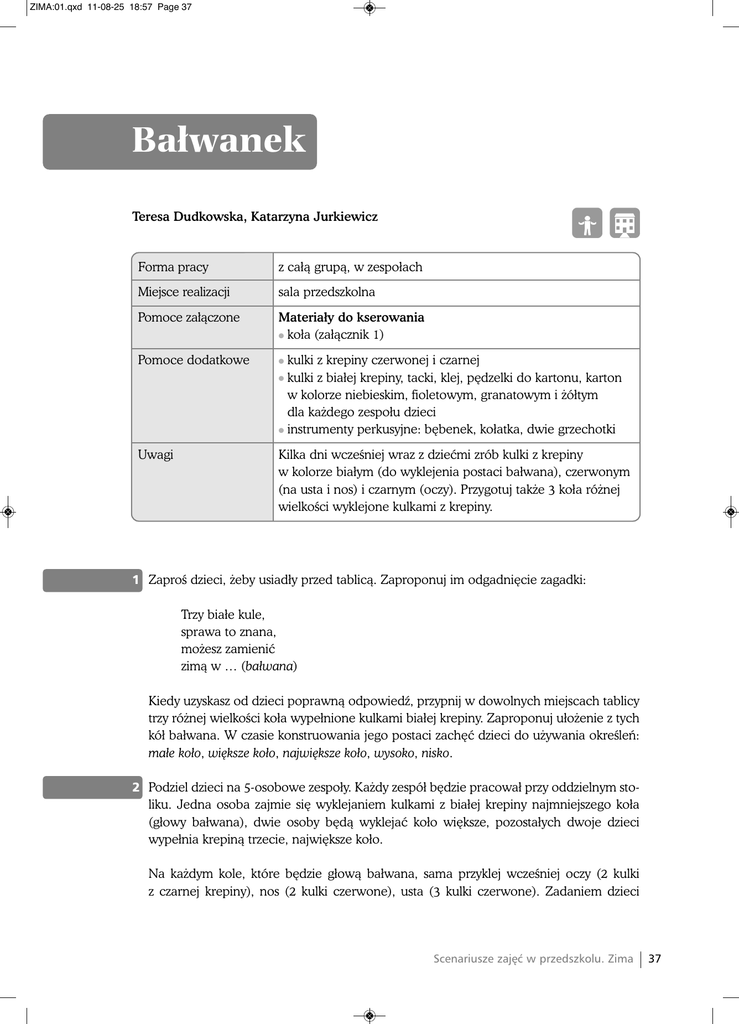 ZIMA:01.qxd 11-08-25 18:57 Page 37 Bałwanek Teresa Dudkowska, Katarzyna Jurkiewicz Forma pracy z całà grupà, w zespołach Miejsce realizacji sala przedszkolna Pomoce za∏àczone Materiały do kserowania l koła (załàcznik 1) Pomoce dodatkowe l kulki z krepiny czerwonej i czarnej kulki z białej krepiny, tacki, klej, p´dzelki do kartonu, karton w kolorze niebieskim, fioletowym, granatowym i ˝ółtym dla ka˝dego zespołu dzieci l instrumenty perkusyjne: b´benek, kołatka, dwie grzechotki l Uwagi Kilka dni wczeÊniej wraz z dzieçmi zrób kulki z krepiny w kolorze białym (do wyklejenia postaci bałwana), czerwonym (na usta i nos) i czarnym (oczy). Przygotuj tak˝e 3 koła ró˝nej wielkoÊci wyklejone kulkami z krepiny. 1 ZaproÊ dzieci, ˝eby usiadły przed tablicà. Zaproponuj im odgadni´cie zagadki: Trzy białe kule, sprawa to znana, mo˝esz zamieniç zimà w … (bałwana) Kiedy uzyskasz od dzieci poprawnà odpowiedê, przypnij w dowolnych miejscach tablicy trzy ró˝nej wielkoÊci koła wypełnione kulkami białej krepiny. Zaproponuj uło˝enie z tych kół bałwana. W czasie konstruowania jego postaci zach´ç dzieci do u˝ywania okreÊleƒ: małe koło, wi´ksze koło, najwi´ksze koło, wysoko, nisko. 2 Podziel dzieci na 5-osobowe zespoły. Ka˝dy zespół b´dzie pracował przy oddzielnym stoliku. Jedna osoba zajmie si´ wyklejaniem kulkami z białej krepiny najmniejszego koła (głowy bałwana), dwie osoby b´dà wyklejaç koło wi´ksze, pozostałych dwoje dzieci wypełnia krepinà trzecie, najwi´ksze koło. Na ka˝dym kole, które b´dzie głowà bałwana, sama przyklej wczeÊniej oczy (2 kulki z czarnej krepiny), nos (2 kulki czerwone), usta (3 kulki czerwone). Zadaniem dzieci Scenariusze zaj´ç w przedszkolu. Zima 37 ZIMA:01.qxd 11-08-25 18:57 Page 38 Bałwanek b´dzie wypełnienie białymi kulkami przestrzeni pomi´dzy ju˝ przyklejonymi przez Ciebie. Wyklejone koła dzieci układajà na kolorowym kartonie tak, ˝eby powstała postaç bałwana i przyklejajà je do kartonu. Uczul dzieci na koniecznoÊç pomocy w porzàdkowaniu swojego miejsca pracy i umycia ràk po skoƒczonej pracy. Wspólnie z dzieçmi umieÊç bałwanki w galerii dzieci´cej. 3 Zaproponuj zabaw´ przy piosence pt. Bałwankowa rodzina. Dzieci ustawiajà si´ w kole. Wybierz te, które b´dà poszczególnymi członkami rodziny bałwanków – tata, mama, dwaj bracia. ZaproÊ je do Êrodka koła. Rozdaj instrumenty perkusyjne (tata – b´benek; mama – kołatka; bracia – grzechotki). 2. Ma korale z jarz´biny bałwankowa ˝ona, ale łatwo poznaç z miny, ˝e dziÊ jest zmartwiona. Oj, tak, tak! Oj, tak, tak! Mego synka jeszcze brak. Oj, tak, tak! Oj, tak, tak! Synka jeszcze brak! 3. Stoi bałwan z bałwankowà w Êrodku zaÊ bałwanek, jeszcze chwila i rozpocznà bałwankowy taniec! Oj, tak, tak! Oj, tak, tak! Przydałby si´ jeszcze brat! Oj, tak, tak! Oj, tak, tak! Przydałby si´ brat! 4. Ju˝ wesołe dwa bałwanki taƒczà z rodzicami i my tak˝e si´ pobawmy razem z bałwankami Oj, tak, tak! Oj, tak, tak! Zataƒcz z nami raz i dwa! Oj, tak, tak! Oj, tak, tak! Zataƒcz raz i dwa! Zach´ç dzieci do zaÊpiewania razem z Tobà piosenki. W czasie refrenu gr´ na instrumencie rozpoczyna to dziecko-bałwanek, o którym mowa w piosence, pozostałe dzieci rytmicznie klaszczà. Zabaw´ mo˝na powtórzyç, wybierajàc do gry inne dzieci. 38 Scenariusze zaj´ç w przedszkolu. Zima ZIMA:01.qxd 11-08-25 18:57 Page 39 Bałwanek Załàcznik 1 # # # Scenariusze zaj´ç w przedszkolu. Zima 39