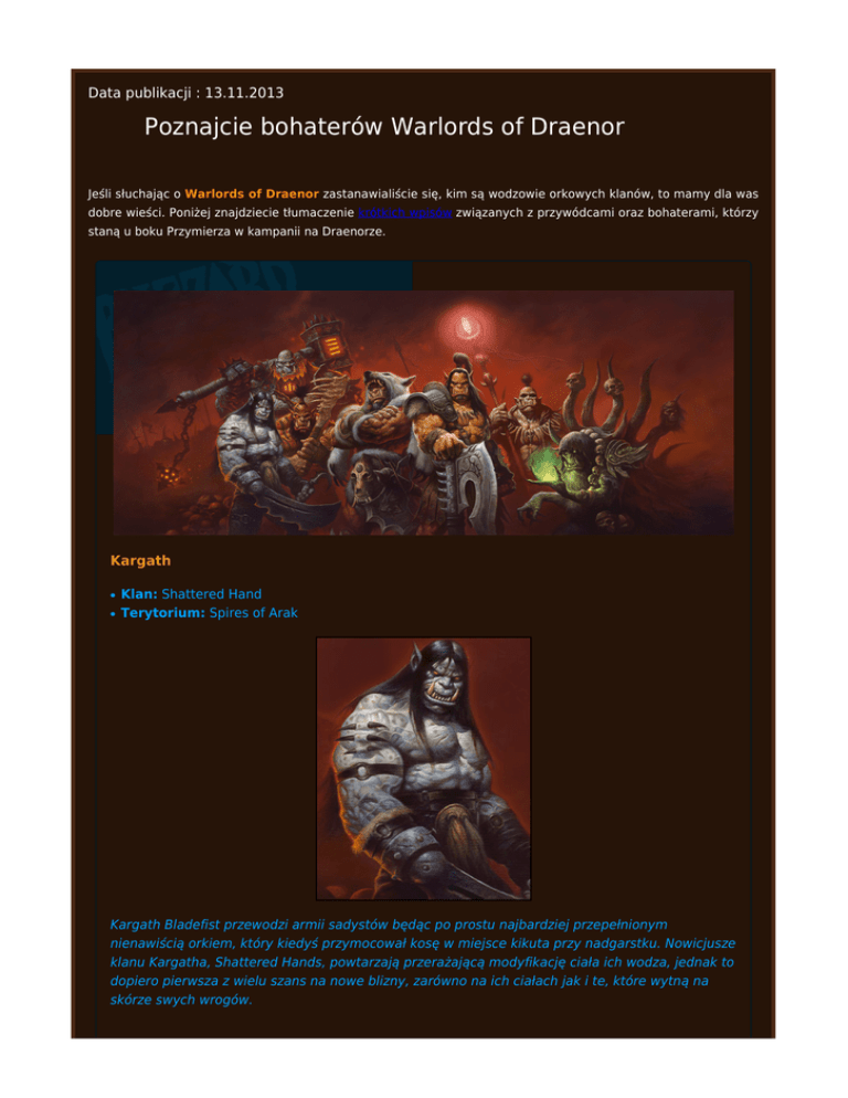 Data publikacji : 13.11.2013 Poznajcie bohaterów Warlords of Draenor Jeśli słuchając o Warlords of Draenor zastanawialiście się, kim są wodzowie orkowych klanów, to mamy dla was dobre wieści. Poniżej znajdziecie tłumaczenie krótkich wpisów związanych z przywódcami oraz bohaterami, którzy staną u boku Przymierza w kampanii na Draenorze. Kargath ● ● Klan: Shattered Hand Terytorium: Spires of Arak Kargath Bladefist przewodzi armii sadystów będąc po prostu najbardziej przepełnionym nienawiścią orkiem, który kiedyś przymocował kosę w miejsce kikuta przy nadgarstku. Nowicjusze klanu Kargatha, Shattered Hands, powtarzają przerażającą modyfikację ciała ich wodza, jednak to dopiero pierwsza z wielu szans na nowe blizny, zarówno na ich ciałach jak i te, które wytną na skórze swych wrogów. Blackhand ● ● Klan: Blackrock Terytorium: Gorgrond Pochłonięty przez obsesję władzy i genialny taktyk, Blackhand łączy w sobie ambicję do rządzenia jak i okrucieństwo niezbędne, aby zachować spokój wśród podbitych. Pod jego dowództwem, odważni orkowie z klanu Blackrock zaopatrują cały świat w wyroby ze stali. Niewolnicy klanu pracują smagani biczami na przerażających machinach oblężniczych - broni, która nieuchronnie zostanie skierowana przeciwko ich rodzinom, sąsiadom i domom. Kilrogg ● ● Klan: Bleeding Hollow Terytorium: Tanaan Jungle Po tym jak dostrzegł swą śmierć w wizji, Kilrogg "Deadeye" przyjął swój los i wyrwał swoje lewe oko w brutalnie symbolicznym geście. Członkowie klanu Kilrogga, Bleeding Hollow, przepełnieni furią berserkerów zanurzają swe bronie w halucynogennej truciźnie i atakują wrogów z czubków drzew sprawiając, że ostatnie chwile życia ich ofiar są wypełnione wizjami czystego szaleństwa. Ner'zhul ● Klan: Shadowmoon ● Terytorium: Shadowmoon Valley Mimo, że Ner'zhul jest kontemplującym i światłym orkiem, jego wizja zjednoczonej kultury orków została przyćmiona przez manipulacje jego ucznia, Gul'dana, oraz krwawą rzeczywistością Żelaznej Hordy. Jego klan, Shadowmoon, zawsze spoglądał w stronę gwiazd, aby przewodzić swym braciom. Dziś jednak, mistycyzm tych mędrców popycha Draenor w stronę zagłady. Gul'dan ● ● Klan: Stormreaver Terytorium: Shadowmoon Valley Sprzymierzony z demonicznym władcą i spiskujący przeciwko mentorowi, którego zdradził, Gul'dan jest jednym z niewielu orków chaosu na Draenorze, a jego wygląd i szamanistyczne moce zostały splugawione przez demoniczny pakt. Grupa wyrzutków, której przewodzi, klan Stormreaver, walczy teraz o wyrwanie "należnego" im miejsca w Żelaznej Hordzie z rąk byłego mentora Gul'dana, Ner'zhula... oraz o skuszenie potężnej armii orków demonicznym darem. Grommash ● ● Klan: Warsong Terytorium: Nagrand Głos dumy i furii, Grommash Hellscream wierzy jedynie w przekazywanie wieści w języku swych toporów. Jego klan, Warsong, jest koczowniczą grupą znakomitych łuczników oraz przerażających wilczych jeźdźców, którzy gromadzą się na czele Żelaznej Hordy, paląc ziemie swych wrogów i obracając ich domy w pył. Durotan ● ● ● Klan: Frostwolf Terytorium: Frostfire Ridge Frakcja: Horda Lojalny wobec swych sojuszników i przerażający dla wrogów, Durotan dowodzi klanem Frostwolf w jednym z najbardziej nieprzyjaznych miejsc, jakie można sobie wyobrazić. Lud Durotana nie odpowiedział na wezwanie do jedności w ramach Żelaznej Hordy, a zamiast tego skupił się na własnym przetrwaniu. Rezydują teraz w mroźnej krainie Frostfire Ridge, okrywając się skórami i oswajając ogromne śnieżne wilki, które towarzyszą im w czasie kolejnych bitew. Velen ● Frakcja: Przymierze Jako prastary lider draenei, prorok Velen spędził setki ludzkich żywotów ostrożnie rozważając i spisując swoje wizje przyszłości, aby siła stworzenia nigdy nie zgasła. Przewodnictwo Velena pomogło zachować jego lud przy życiu, kiedy musiał on opuścić świat Argus, jednak jego wiedza zostanie poddana próbie, kiedy Żelazna Horda pojawi się na Draenorze. Ile warty jest bowiem prorok, który nie potrafi zapobiec takiemu nieszczęściu? Khadgar ● Frakcja: Przymierze Prawdopodobnie jeden z najzdolniejszych żyjących magów, Khadgar był niegdyś uczniem u Strażnika Medivha, do czasu, kiedy pomógł w pokonaniu swego mistrza i zniszczeniu Mrocznego Portalu, który został stworzony po to, aby sprowadzić orków do Azeroth. Mimo, że jest już słaby i stary, Khadgar pozostaje bohaterem Przymierza, który dokonuje ataków na Płonący Legion i wszystkich tych, którzy zagrożą jego światu. Maraad ● Frakcja: Przymierze Podróżujący wojownik wiary, Maraad stoi u szczytu draeneiskiego społeczeństwa. Po zakończeniu kampanii w Northrend, ten dzierżący młot paladyn instruował inne nacje Przymierza w posługiwaniu się Światłością. Stawienie czoła licznym niebezpieczeństwom świata Azeroth sprawiły, że jest on bardziej skory do akcji, niż do medytacji - uderzy wtedy, kiedy inni będą jeszcze się wahać. Autor: Sigmar Liczba wyświetleń strony: 5347 Data publikacji : 13.11.2013 Data modyfikacji : 14.11.2013 Tagi: zapowiedź, Warlords of Draenor Komentarz (4) dodaj komentarz Ale brzydale :)~ElemenT Battlenet Network 2013/11/13 19:48 Do tekstu zakradł się chyba błąd: "Po tym jak dostrzegł swą śmierć w wizji, Kilrogg "Deadeye" przyjął swój lost i wyrwał swoje lewe oko w brutalnie symbolicznym geście." Tam ten cały "lost", czy to nie powinno byś los? Pozdrawiam :)~LordVader 2013/11/13 22:21 ~LordVader: Dzięki za zwrócenie uwagi. Już poprawione =)~Sigmar Battlenet Network 2013/11/14 08:10 Eh Ner'zhul z tego co pamiętam w tym okresie był dobry no ale nic zawsze w wowie to co złe to takie pozostanie bez względu na okoliczności.~Frezko11 2013/11/15 21:10 dodaj komentarz Pozostałe nowości Zapowiedź zmian w klasach - Mnich Legion wkroczył w fazę alfa testów w czasie których 
