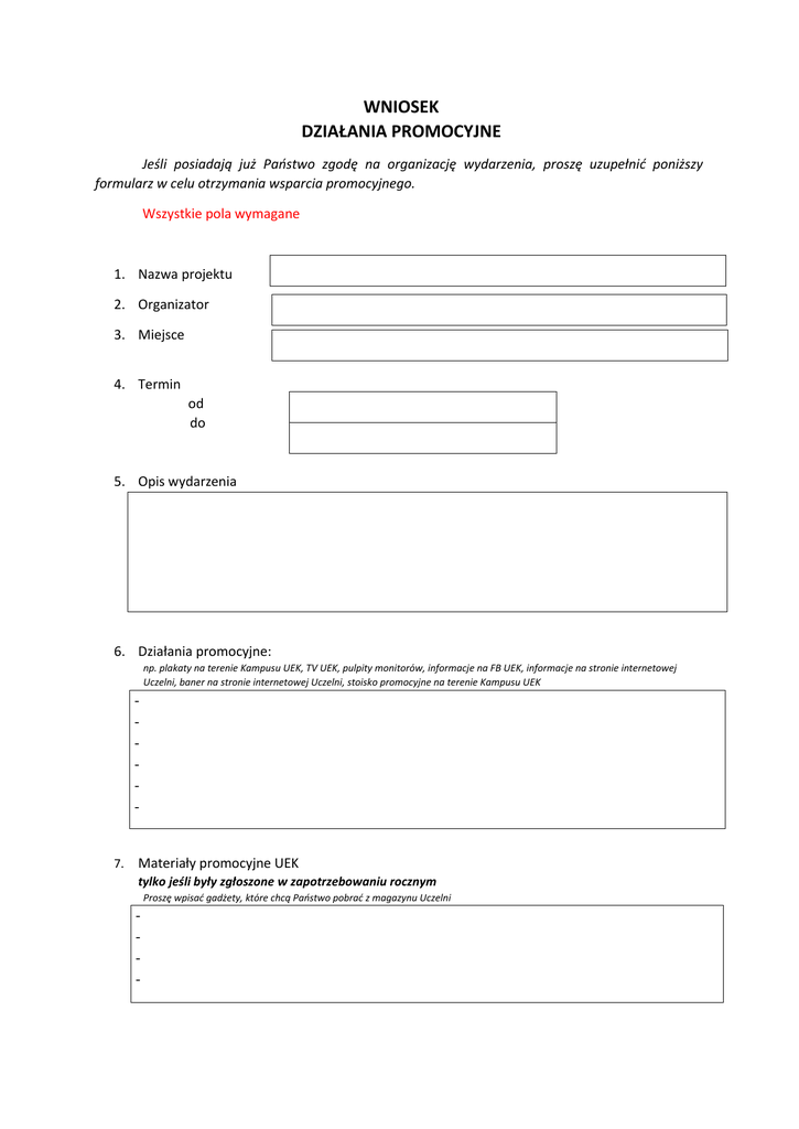 WNIOSEK DZIAŁANIA PROMOCYJNE Jeśli posiadają już Państwo zgodę na organizację wydarzenia, proszę uzupełnić poniższy formularz w celu otrzymania wsparcia promocyjnego. Wszystkie pola wymagane 1. Nazwa projektu 2. Organizator 3. Miejsce 4. Termin od do 5. Opis wydarzenia 6. Działania promocyjne: np. plakaty na terenie Kampusu UEK, TV UEK, pulpity monitorów, informacje na FB UEK, informacje na stronie internetowej Uczelni, baner na stronie internetowej Uczelni, stoisko promocyjne na terenie Kampusu UEK - 7. Materiały promocyjne UEK tylko jeśli były zgłoszone w zapotrzebowaniu rocznym Proszę wpisać gadżety, które chcą Państwo pobrać z magazynu Uczelni - 8. Druki tylko jeśli były zgłoszone w zapotrzebowaniu rocznym 9. Obsługa FOTO i/lub VIDEO 10. Osoba odpowiedzialna realizacje wydarzenia za 11. Telefon kontaktowy 12. E-mail DECYZJA: ……………………………………………………………. data i podpis osoby składającej wniosek Jeśli organizują Państwo wydarzenie z jednostką zewnętrzną prosimy o bezpośredni kontakt z p. Anetą Nagrabą (e-mail: [email protected], tel. 12 293 5496) w celu sporządzenia umowy i ustalenia szczegółów współpracy.