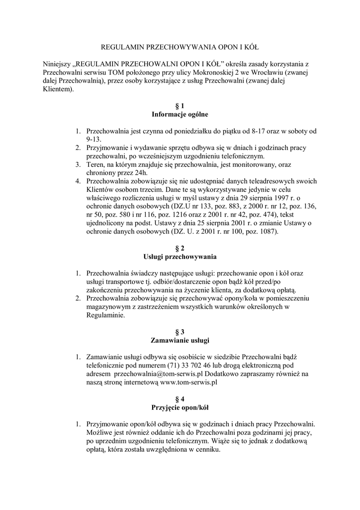 REGULAMIN PRZECHOWYWANIA OPON I KÓŁ Niniejszy „REGULAMIN PRZECHOWALNI OPON I KÓŁ” określa zasady korzystania z Przechowalni serwisu TOM położonego przy ulicy Mokronoskiej 2 we Wrocławiu (zwanej dalej Przechowalnią), przez osoby korzystające z usług Przechowalni (zwanej dalej Klientem). §1 Informacje ogólne 1. Przechowalnia jest czynna od poniedziałku do piątku od 8-17 oraz w soboty od 9-13. 2. Przyjmowanie i wydawanie sprzętu odbywa się w dniach i godzinach pracy przechowalni, po wcześniejszym uzgodnieniu telefonicznym. 3. Teren, na którym znajduje się przechowalnia, jest monitorowany, oraz chroniony przez 24h. 4. Przechowalnia zobowiązuje się nie udostępniać danych teleadresowych swoich Klientów osobom trzecim. Dane te są wykorzystywane jedynie w celu właściwego rozliczenia usługi w myśl ustawy z dnia 29 sierpnia 1997 r. o ochronie danych osobowych (DZ.U nr 133, poz. 883, z 2000 r. nr 12, poz. 136, nr 50, poz. 580 i nr 116, poz. 1216 oraz z 2001 r. nr 42, poz. 474), tekst ujednolicony na podst. Ustawy z dnia 25 sierpnia 2001 r. o zmianie Ustawy o ochronie danych osobowych (DZ. U. z 2001 r. nr 100, poz. 1087). §2 Usługi przechowywania 1. Przechowalnia świadczy następujące usługi: przechowanie opon i kół oraz usługi transportowe tj. odbiór/dostarczenie opon bądź kół przed/po zakończeniu przechowywania na życzenie klienta, za dodatkową opłatą. 2. Przechowalnia zobowiązuje się przechowywać opony/koła w pomieszczeniu magazynowym z zastrzeżeniem wszystkich warunków określonych w Regulaminie. §3 Zamawianie usługi 1. Zamawianie usługi odbywa się osobiście w siedzibie Przechowalni bądź telefonicznie pod numerem (71) 33 702 46 lub drogą elektroniczną pod adresem [email protected] Dodatkowo zapraszamy również na naszą stronę internetową www.tom-serwis.pl §4 Przyjęcie opon/kół 1. Przyjmowanie opon/kół odbywa się w godzinach i dniach pracy Przechowalni. Możliwe jest również oddanie ich do Przechowalni poza godzinami jej pracy, po uprzednim uzgodnieniu telefonicznym. Wiąże się to jednak z dodatkową opłatą, która została uwzględniona w cenniku. 2. Warunkiem przyjęcia opon/kół do przechowania jest zapoznanie się przez Klienta z niniejszym regulaminem oraz podpisanie wypełnionej karty rejestracyjnej. 3. Karta rejestracyjna zawiera niezbędne informacje, na podstawie których Klient ma prawo do odbioru opon/kół. Karta opisuje stan opon/kół, głębokość bieżnika, ich znaki szczególne oraz inne niezbędne informacje. W przypadkach szczególnych możliwe jest wykonanie zdjęcia. Zdjęcie to znajduje się w komputerowej bazie Przechowalni. 4. Opony/koła MUSZĄ BYĆ CZYSTE (pozbawione wszelkich nieczystości i ciał obcych znajdujących się w bieżnikach), aby dokonać precyzyjnej oceny ich stanu. 5. Uszkodzona opona/koło będą przyjmowane jedynie po dokonaniu wzmianki o uszkodzeniu w formularzu przyjęcia do przechowania. 6. Przechowalnia zastrzega sobie prawo do zmiany miejsca i sposobu przechowywania rzeczy oddanych na przechowanie, bez wcześniejszego poinformowania o tym fakcie klienta, jeżeli jest to niezbędne dla ich ochrony przed utratą i uszkodzeniem. §5 Odbiór opon/kół 1. Odbiór opon/kół odbywa się w godzinach i dniach pracy Przechowalni. Możliwe jest również odebranie opon/kół poza godzinami pracy, po uprzednim uzgodnieniu telefonicznym. Wiąże się to jednak z dodatkową opłatą, która została uwzględniona w cenniku. 2. Klient musi przynieść ze sobą kartę rejestracyjną, którą otrzymał przy zdawaniu opon/kół. 3. W chwili odbioru Klient zobowiązany jest sprawdzić stan opon/kół. 4. W wypadku utraty karty przechowania Klient zobowiązany jest do przedstawienia co najmniej dwóch dokumentów tożsamości, wraz z fotografią, pozwalających ustalić jego prawa do odbioru przechowywanego sprzętu. 5. W przypadku stwierdzenia jakichkolwiek niezgodności lub uszkodzeń, jedyną podstawą do złożenia reklamacji będzie karta rejestracyjna spisana w obecności pracownika Przechowalni w dniu zdawania opon/kół. Rozpatrzenie reklamacji następuje w terminie do 14 dni. 6. Opony/koła, które nie zostaną odebrane w przeciągu jednego dnia od umówionej daty odbioru, podlegają naliczeniu dodatkowej opłaty za przechowanie. 7. Klient potwierdza odbiór opon/kół pisemnym pokwitowaniem. 8. Jeżeli opony/koła ma prawo odebrać osoba trzecia, jest ona zobowiązana okazać odpowiednie upoważnienie uprawniające ją do odbioru. 9. Jeżeli opony/koła mają być dostarczone do Klienta, Klient jest zobowiązany podać wszelkie niezbędne dane dostarczenia. Opony/koła dostarczane są za dodatkową opłatą. Jeżeli pod podanym adresem nie będzie osoby upoważnionej do odbioru opon/kół, pobrana zostanie opłata w wysokości 50zł, a opony/koła zostaną umieszczone z powrotem do Przechowalni, gdzie podlegać będę odbiorowi osobistemu zgodnie z postanowieniami zawartymi w Regulaminie. §6 Cennik/Płatności 1. Opłatę za deklarowany okres przechowania Przechowalnia pobiera się z góry, w momencie przyjęcia opon/kół i podpisania karty zdania sprzętu. 2. Opłata za przechowanie opon/kół od 1 listopada do 31 marca (sezon zimowy) od 1 kwietnia do 31 października (sezon letni) wynosi: Opony: 50 zł za sezon Koła: 60 zł za sezon W związku ze zmiennymi warunkami atmosferycznymi (np. dłuższym okresem utrzymywania się warunków zimowych) przewiduję się 30 dniowy okres przejściowy za który nie będzie pobierana dodatkowa opłata. 3. W przypadku nieodebrania opon/kół w terminie określonym w zleceniu, oraz po upływie 30 dniowego okresu przejściowego, zgodnie z §5 pkt. 6, naliczona zostanie opłata w wysokości 10zł za każde rozpoczęte 14 dni. 4. Transport opon/kół do warsztatu/domu w granicach administracyjnych Oporowa 10zł. Transport w granicach pozostałych dzielnic do uzgodnienia. 5. W przypadku odebrania kół przed zakończeniem sezonu, Przecho