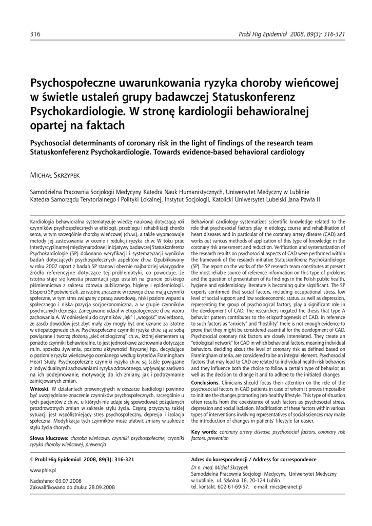 316 Probl Hig Epidemiol 2008, 89(3): 316-321 Psychospołeczne uwarunkowania ryzyka choroby wieńcowej w świetle ustaleń grupy badawczej Statuskonferenz Psychokardiologie. W stronę kardiologii behawioralnej opartej na faktach Psychosocial determinants of coronary risk in the light of findings of the research team Statuskonfeferenz Psychokardiologie. Towards evidence-based behavioral cardiology MICHAŁ SKRZYPEK Samodzielna Pracownia Socjologii Medycyny, Katedra Nauk Humanistycznych, Uniwersytet Medyczny w Lublinie Katedra Samorządu Terytorialnego i Polityki Lokalnej, Instytut Socjologii, Katolicki Uniwersytet Lubelski Jana Pawła II Kardiologia behawioralna systematyzuje wiedzę naukową dotyczącą roli czynników psychospołecznych w etiologii, przebiegu i rehabilitacji chorób serca, w tym szczególnie choroby wieńcowej (ch.w.), a także wypracowuje metody jej zastosowania w ocenie i redukcji ryzyka ch.w. W toku prac interdyscyplinarnej międzynarodowej inicjatywy badawczej Statuskonferenz Psychokardiologie (SP) dokonano weryfikacji i systematyzacji wyników badań dotyczących psychospołecznych aspektów ch.w. Opublikowany w roku 2007 raport z badań SP stanowi obecnie najbardziej wiarygodne źródło referencyjne dotyczące tej problematyki, co powoduje, że istotna staje się kwestia prezentacji jego ustaleń na gruncie polskiego piśmiennictwa z zakresu zdrowia publicznego, higieny i epidemiologii. Eksperci SP potwierdzili, że istotne znaczenie w rozwoju ch.w. mają czynniki społeczne, w tym stres związany z pracą zawodową, niski poziom wsparcia społecznego i niska pozycja socjoekonomiczna, a w grupie czynników psychicznych depresja. Zanegowano udział w etiopatogenezie ch.w. wzoru zachowania A. W odniesieniu do czynników „lęk” i „wrogość” stwierdzono, że zasób dowodów jest zbyt mały, aby mogły być one uznane za istotne w etiopatogenezie ch.w. Psychospołeczne czynniki ryzyka ch.w. są ze sobą powiązane i tworzą złożoną „sieć etiologiczną” ch.w., której elementem są ponadto czynniki behawioralne, to jest jednostkowe zachowania dotyczące m.in. sposobu żywienia, poziomu aktywności fizycznej itp., decydujące o poziomie ryzyka wieńcowego ocenianego według kryteriów Framingham Heart Study. Psychospołeczne czynniki ryzyka ch.w. są ściśle powiązane z indywidualnymi zachowaniami ryzyka zdrowotnego, wpływając zarówno na ich podejmowanie, motywację do ich zmiany, jak i podtrzymanie zainicjowanych zmian. Wnioski. W działaniach prewencyjnych w obszarze kardiologii powinno być uwzględniane znaczenie czynników psychospołecznych, szczególnie u tych pacjentów z ch.w., u których nie udaje się spowodować pożądanych prozdrowotnych zmian w zakresie stylu życia. Częstą przyczyną takiej sytuacji jest współistniejący stres psychospołeczny, depresja i izolacja społeczna. Modyfikacja tych czynników może ułatwić zmiany w zakresie stylu życia chorych. Słowa kluczowe: choroba wieńcowa, czynniki psychospołeczne, czynniki ryzyka choroby wieńcowej, prewencja Behavioral cardiology systematizes scientific knowledge related to the role that psychosocial factors play in etiology, course and rehabilitation of heart diseases and in particular of the coronary artery disease (CAD) and works out various methods of application of this type of knowledge in the coronary risk assessment and reduction. Verification and systematization of the research results on psychosocial aspects of CAD were performed within the framework of the research initiative Statuskonferenz Psychokardiologie (SP). The report on the works of the SP research team constitutes at present the most reliable source of reference information on this type of problems and the question of presentation of its findings in the Polish public health, hygiene and epidemiology literature is becoming quite significant. The SP experts confirmed that social factors, including occupational stress, low level of social support and low socioeconomic status, as well as depression, representing the group of psychological factors, play a significant role in the development of CAD. The researchers negated the thesis that type A behavior pattern contributes to the etiopathogenesis of CAD. In reference to such factors as “anxiety” and “hostility” there is not enough evidence to prove that they might be considered essential for the development of CAD. Psychosocial coronary risk factors are closely interrelated. They create an “etiological network” for CAD in which behavioral factors, meaning individual behaviors, deciding about the level of coronary risk as defined based on Framingham criteria, are considered to be an integral element. Psychosocial factors that may lead to CAD are related to individual health-risk behaviors and they influence both the choice to follow a certain type of behavior, as well as the decision to change it and to adhere to the initiated changes. Conclusions. Clinicians should focus their attention on the role of the psychosocial factors in CAD patients in case of whom it proves impossible to initiate the changes promoting pro-healthy lifestyle. This type of situation often results from the coexistence of such factors as psychosocial stress, depression and social isolation. Modification of these factors within various types of interventions involving representatives of social sciences may make the introduction of changes in patients’ lifestyle far easier. Key words: coronary artery disease, psychosocial factors, coronary risk factors, prevention © Probl Hig Epidemiol 2008, 89(3): 316-321 Adres do korespondencji / Address for correspondence www.phie.pl Dr n. med. Michał Skrzypek Samodzielna Pracownia Socjologii Medycyny, Uniwersytet Medyczny w Lublinie, ul. Szkolna 18, 20-124 Lublin tel. kontakt. 602-61-69-57, e-mail: [email protected] Nadesłano: 03.07.2008 Zakwalifikowano do druku: 28.09.2008 Skrzypek M. Psychospołeczne uwarunkowania ryzyka choroby wie