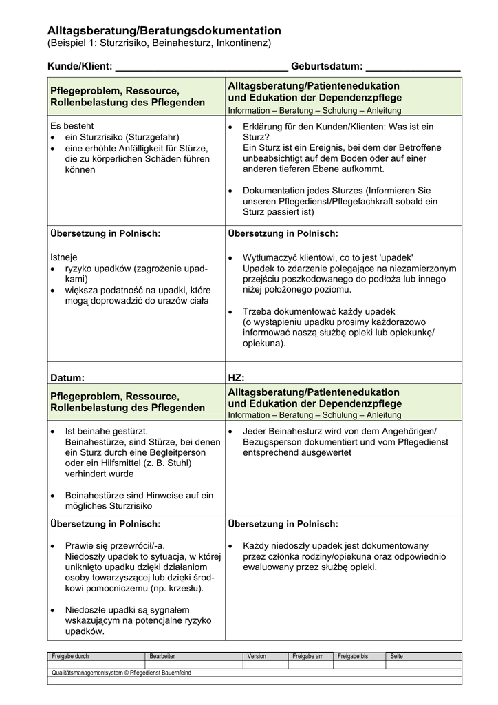 Alltagsberatung/Beratungsdokumentation (Beispiel 1: Sturzrisiko, Beinahesturz, Inkontinenz) Kunde/Klient: _______________________________ Geburtsdatum: _________________ Pflegeproblem, Ressource, Rollenbelastung des Pflegenden Es besteht • ein Sturzrisiko (Sturzgefahr) • eine erhöhte Anfälligkeit für Stürze, die zu körperlichen Schäden führen können Alltagsberatung/Patientenedukation und Edukation der Dependenzpflege Information – Beratung – Schulung – Anleitung • Erklärung für den Kunden/Klienten: Was ist ein Sturz? Ein Sturz ist ein Ereignis, bei dem der Betroffene unbeabsichtigt auf dem Boden oder auf einer anderen tieferen Ebene aufkommt. • Dokumentation jedes Sturzes (Informieren Sie unseren Pflegedienst/Pflegefachkraft sobald ein Sturz passiert ist) Übersetzung in Polnisch: Übersetzung in Polnisch: Istneje • ryzyko upadków (zagrożenie upadkami) • większa podatność na upadki, które mogą doprowadzić do urazów ciała • Wytłumaczyć klientowi, co to jest 'upadek' Upadek to zdarzenie polegające na niezamierzonym przejściu poszkodowanego do podłoża lub innego niżej położonego poziomu. • Trzeba dokumentować każdy upadek (o wystąpieniu upadku prosimy każdorazowo informować naszą służbę opieki lub opiekunkę/ opiekuna). Datum: Pflegeproblem, Ressource, Rollenbelastung des Pflegenden HZ: Alltagsberatung/Patientenedukation und Edukation der Dependenzpflege Information – Beratung – Schulung – Anleitung • • Ist beinahe gestürzt. Beinahestürze, sind Stürze, bei denen ein Sturz durch eine Begleitperson oder ein Hilfsmittel (z. B. Stuhl) verhindert wurde • Beinahestürze sind Hinweise auf ein mögliches Sturzrisiko Übersetzung in Polnisch: Übersetzung in Polnisch: • • Prawie się przewrócił/-a. Niedoszły upadek to sytuacja, w której uniknięto upadku dzięki działaniom osoby towarzyszącej lub dzięki środkowi pomocniczemu (np. krzesłu). • Niedoszłe upadki są sygnałem wskazującym na potencjalne ryzyko upadków. Freigabe durch Bearbeiter Qualitätsmanagementsystem © Pflegedienst Bauernfeind Jeder Beinahesturz wird von dem Angehörigen/ Bezugsperson dokumentiert und vom Pflegedienst entsprechend ausgewertet Każdy niedoszły upadek jest dokumentowany przez członka rodziny/opiekuna oraz odpowiednio ewaluowany przez służbę opieki. Version Freigabe am Freigabe bis Seite Alltagsberatung/Beratungsdokumentation (Beispiel 1: Sturzrisiko, Beinahesturz, Inkontinenz) Kunde/Klient: _______________________________ Geburtsdatum: _________________ Datum: HZ: Pflegeproblem, Ressource, Rollenbelastung des Pflegenden Alltagsberatung/Patientenedukation und Edukation der Dependenzpflege Information – Beratung – Schulung – Anleitung • Durch Kontinenzprobleme besteht ein • Sturzrisiko • Um die Toilette rechtzeitig zu erreichen, muss sich der Kunde/Klient beeilen Den Kunden/Klienten und seine Angehörigen über folgende Möglichkeiten informieren: − Sich bewusst Zeit nehmen beim Toilettengang − Hilfsmittel helfen nur, wenn die Gangsicherheit behoben wurde − Mit einer Begleitperson zur Toilette gehen − Einen Toilettenstuhl, der am Bett steht, benutzen Übersetzung in Polnisch: Übersetzung in Polnisch: • Problemy nietrzymania moczu stanowią zagrożenie upadkiem. • • Klient musi się spieszyć, by zdążyć na czas do toalety. Datum: Freigabe durch Udzielić klientowi i jego rodzinie następujących informacji: − Przeznaczyć odpowiedni czas na każde chodzenie do toalety − Środki pomocnicze są skuteczne jedynie wtedy, gdy zapewniona jest stabilność chodu − Chodzić do toalety z osobą towarzyszącą − Korzystać z krzesła toaletowego, znajdującego się w pobliżu łóżka HZ: Bearbeiter Qualitätsmanagementsystem © Pflegedienst Bauernfeind Version Freigabe am Freigabe bis Seite
