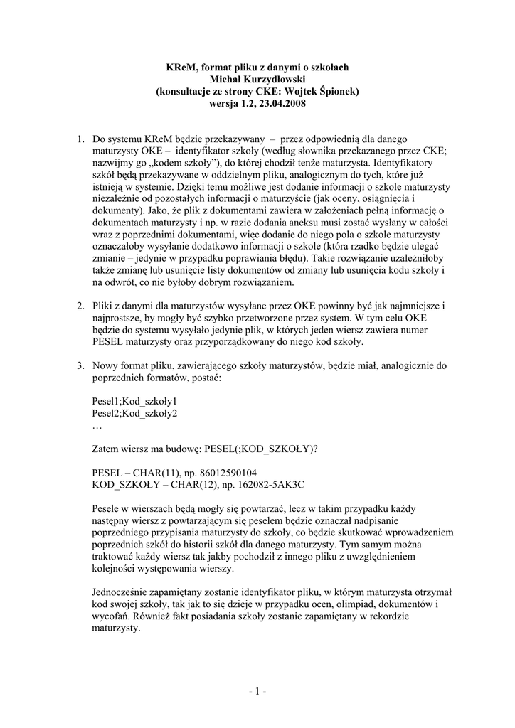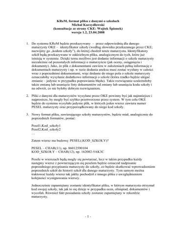 KReM, format pliku z danymi o szkołach Michał Kurzydłowski (konsultacje ze strony CKE: Wojtek Śpionek) wersja 1.2, 23.04.2008 1. Do systemu KReM będzie przekazywany – przez odpowiednią dla danego maturzysty OKE – identyfikator szkoły (według słownika przekazanego przez CKE; nazwijmy go „kodem szkoły”), do której chodził tenże maturzysta. Identyfikatory szkół będą przekazywane w oddzielnym pliku, analogicznym do tych, które już istnieją w systemie. Dzięki temu możliwe jest dodanie informacji o szkole maturzysty niezależnie od pozostałych informacji o maturzyście (jak oceny, osiągnięcia i dokumenty). Jako, że plik z dokumentami zawiera w założeniach pełną informację o dokumentach maturzysty i np. w razie dodania aneksu musi zostać wysłany w całości wraz z poprzednimi dokumentami, więc dodanie do niego pola o szkole maturzysty oznaczałoby wysyłanie dodatkowo informacji o szkole (która rzadko będzie ulegać zmianie – jedynie w przypadku poprawiania błędu). Takie rozwiązanie uzależniłoby także zmianę lub usunięcie listy dokumentów od zmiany lub usunięcia kodu szkoły i na odwrót, co nie byłoby dobrym rozwiązaniem. 2. Pliki z danymi dla maturzystów wysyłane przez OKE powinny być jak najmniejsze i najprostsze, by mogły być szybko przetworzone przez system. W tym celu OKE będzie do systemu wysyłało jedynie plik, w których jeden wiersz zawiera numer PESEL maturzysty oraz przyporządkowany do niego kod szkoły. 3. Nowy format pliku, zawierającego szkoły maturzystów, będzie miał, analogicznie do poprzednich formatów, postać: Pesel1;Kod_szkoły1 Pesel2;Kod_szkoły2 … Zatem wiersz ma budowę: PESEL(;KOD_SZKOŁY)? PESEL – CHAR(11), np. 86012590104 KOD_SZKOŁY – CHAR(12), np. 162082-5AK3C Pesele w wierszach będą mogły się powtarzać, lecz w takim przypadku każdy następny wiersz z powtarzającym się peselem będzie oznaczał nadpisanie poprzedniego przypisania maturzysty do szkoły, co będzie skutkować wprowadzeniem poprzednich szkół do historii szkół dla danego maturzysty. Tym samym można traktować każdy wiersz tak jakby pochodził z innego pliku z uwzględnieniem kolejności występowania wierszy. Jednocześnie zapamiętany zostanie identyfikator pliku, w którym maturzysta otrzymał kod swojej szkoły, tak jak to się dzieje w przypadku ocen, olimpiad, dokumentów i wycofań. Również fakt posiadania szkoły zostanie zapamiętany w rekordzie maturzysty. -1- W przypadku, gdy przy peselu nie występuje kod szkoły, dotychczasowy kod szkoły zostaje usunięty (przeniesiony do historii szkół dla maturzysty) oraz zaznaczony będzie fakt nie posiadania przez maturzysty kodu szkoły. 4. W przypadku, gdy informacja o szkole maturzysty przyjdzie z dwóch różnych OKE, zgłoszony zostanie konflikt. Administrator systemu będzie mógł rozwiązać konflikt, a informacje o wprowadzonych przez oba OKE kodach szkół zostaną zachowane. 5. Aby przetłumaczyć kod szkoły na dane o szkole (takie jak jej nazwa) oraz publiczny kod szkoły (kod używany przez system KReM i przekazywany uczelniom), należy dodać do bazy danych słownik szkół. Słownik ten będzie wysyłany do systemu w postaci pliku z interfejsu administratora oraz eksportowany do pliku (bez kolumny zawierającej kod) i wysyłany uczelniom poprzez ich interfejs. W tym celu interfejs administratora zostanie wzbogacony o nową zakładkę „Słownik szkół”. Będzie ona umożliwiała wysłanie pliku zawierającego aktualizację do słownika szkół znajdującego się w systemie. Najlepszym rozwiązaniem wydaje się w obu przypadkach przyjęcie formatu CSV (ze średnikiem jako separatorem kolejnych pól w wierszu), gdyż w przypadku importu kodów do KReM można by użyć do tego celu zmodyfikowany parser, który obsługuje już wszystkie pliki wprowadzające dane do systemu. Z drugiej zaś strony format ten łatwo przekształcić z i do arkuszy kalkulacyjnych. Podczas importu do systemu kodów szkół wygenerowany zostanie publiczny kod szkoły odpowiadający kodowi przekazanemu przez OKE. Nie będzie istniała w systemie funkcja odwrotna, gdyż istotne jest by publiczny kod nie umożliwiał odnalezienie kodu stosowanego przez OKE. 6. Słownik będzie zawierał następujące pola: kod szkoły, nazwa szkoły, miejscowość, ulica, numer budynku, kod pocztowy, kod publiczny szkoły. W pliku wysyłanym przez administratora nie będzie jedynie widniał kod publiczny szkoły (zostanie wygenerowany przez system), zaś w pliku pobieranym przez uczelnię nie będzie widniał kod szkoły. Unikatowym polem w słowniku będzie kod szkoły, względem którego będą wykonywane aktualizacje pozostałych pól (unikatowy będzie zatem także publiczny kod szkoły wygenerowany przez funkcję przyjmującą jako parametr kod szkoły). 7. Plik w formacie CSV zawierający nowe kody i aktualizacje starych kodów będzie się składał z wierszy postaci: Kod_szkoły;Nazwa_szkoły;Miejscowość;Ulica;Budynek_nr;Poczta;Kod_pocztowy Kod_szkoły - CHAR(12), np. 162082-5AK3C Nazwa_szkoły – VARCHAR(200) Miejscowość – VARCHAR(50) Ulica – VARCHAR(50) Budynek_nr – VARCHAR(20) Poczta – VARCHAR(50) Kod_pocztowy – CHAR(6), np. 05-077 -2- W przypadku, gdy dla pewnego wiersza w pliku, kod szkoły już istnieje w bazie następuje aktualizacja pozostałych pól przez nadpisanie tych pól nowymi wartościami (prócz pola z kodem publicznym, które nie musi być zmieniane). Zatem gdyby w pliku wystąpiło kilka wierszy z tym samym kodem, nastąpi nadpisanie danych o szkole informacjami z kolejnych wierszy, tak, iż pozostanie jedynie informacja zawarta w ostatnim wierszu opisującym tę szkołę, a pozostałe informacje przepadną. Jeśli nie ma jeszcze w bazie szkoły o danych kodzie, to dany kod i informacja o szkole zostaną dodane do systemu oraz wyliczony zostanie publiczny kod odpowiadający danej szkole, a wyliczony na podstawie kodu. Informacja o zaimportowany