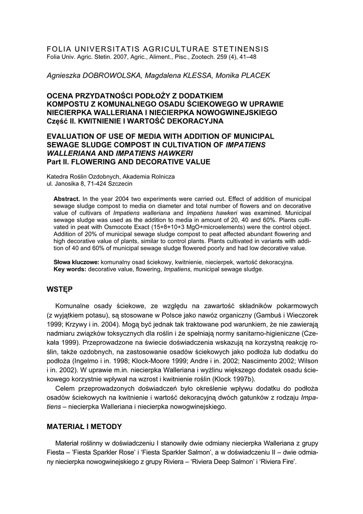 FOLIA UNIVERSITATIS AGRICULTURAE STETINENSIS Folia Univ. Agric. Stetin. 2007, Agric., Aliment., Pisc., Zootech. 259 (4), 41–48 Agnieszka DOBROWOLSKA, Magdalena KLESSA, Monika PLACEK OCENA PRZYDATNOŚCI PODŁOŻY Z DODATKIEM KOMPOSTU Z KOMUNALNEGO OSADU ŚCIEKOWEGO W UPRAWIE NIECIERPKA WALLERIANA I NIECIERPKA NOWOGWINEJSKIEGO Część II. KWITNIENIE I WARTOŚĆ DEKORACYJNA EVALUATION OF USE OF MEDIA WITH ADDITION OF MUNICIPAL SEWAGE SLUDGE COMPOST IN CULTIVATION OF IMPATIENS WALLERIANA AND IMPATIENS HAWKERI Part II. FLOWERING AND DECORATIVE VALUE Katedra Roślin Ozdobnych, Akademia Rolnicza ul. Janosika 8, 71-424 Szczecin Abstract. In the year 2004 two experiments were carried out. Effect of addition of municipal sewage sludge compost to media on diameter and total number of flowers and on decorative value of cultivars of Impatiens walleriana and Impatiens hawkeri was examined. Municipal sewage sludge was used as the addition to media in amount of 20, 40 and 60%. Plants cultivated in peat with Osmocote Exact (15+8+10+3 MgO+microelements) were the control object. Addition of 20% of municipal sewage sludge compost to peat affected abundant flowering and high decorative value of plants, similar to control plants. Plants cultivated in variants with addition of 40 and 60% of municipal sewage sludge flowered poorly and had low decorative value. Słowa kluczowe: komunalny osad ściekowy, kwitnienie, niecierpek, wartość dekoracyjna. Key words: decorative value, flowering, Impatiens, municipal sewage sludge. WSTĘP Komunalne osady ściekowe, ze względu na zawartość składników pokarmowych (z wyjątkiem potasu), są stosowane w Polsce jako nawóz organiczny (Gambuś i Wieczorek 1999; Krzywy i in. 2004). Mogą być jednak tak traktowane pod warunkiem, że nie zawierają nadmiaru związków toksycznych dla roślin i że spełniają normy sanitarno-higieniczne (Czekała 1999). Przeprowadzone na świecie doświadczenia wskazują na korzystną reakcję roślin, także ozdobnych, na zastosowanie osadów ściekowych jako podłoża lub dodatku do podłoża (Ingelmo i in. 1998; Klock-Moore 1999; Andre i in. 2002; Nascimento 2002; Wilson i in. 2002). W uprawie m.in. niecierpka Walleriana i wyżlinu większego dodatek osadu ściekowego korzystnie wpływał na wzrost i kwitnienie roślin (Klock 1997b). Celem przeprowadzonych doświadczeń było określenie wpływu dodatku do podłoża osadów ściekowych na kwitnienie i wartość dekoracyjną dwóch gatunków z rodzaju Impatiens – niecierpka Walleriana i niecierpka nowogwinejskiego. MATERIAŁ I METODY Materiał roślinny w doświadczeniu I stanowiły dwie odmiany niecierpka Walleriana z grupy Fiesta – ’Fiesta Sparkler Rose’ i ‘Fiesta Sparkler Salmon’, a w doświadczeniu II – dwie odmiany niecierpka nowogwinejskiego z grupy Riviera – ‘Riviera Deep Salmon’ i ‘Riviera Fire’. 42 A. Dobrowolska i in. Oba doświadczenia przeprowadzono, według tej samej metody, od 1 kwietnia do 15 września 2004 roku. Sadzonki niecierpków posadzono w doniczkach o pojemności 0,75 dm–3, w następujących wariantach podłożowych: 1) kontrolny – torf wysoki odkwaszony z dodatkiem 5 g·dm–3 nawozu Osmocote Exact Lo-Start (15+8+10+3MgO+mikroelementy) oraz mieszanki kompostu z komunalnego osadu ściekowego z torfem; 2) 20% kompostu + 80% torfu; 3) 40% kompostu + 60% torfu; 4) 60% kompostu + 40% torfu. Wszystkie podłoża odkwaszono kredą i dolomitem do pH 5,9–6,1. Metodykę doświadczeń przedstawiono w I części pracy. Niecierpki we wszystkich kombinacjach rozpoczęły kwitnienie w tym samym czasie. W obu doświadczeniach od momentu rozpoczęcia kwitnienia (od ósmego tygodnia uprawy), w odstępach tygodniowych, liczono kwiaty, po czym je usuwano. Po dwóch i czterech miesiącach od posadzenia roślin przeprowadzono pomiary średnicy kwiatów oraz ocenę bonitacyjną niecierpków w skali 1–9, obejmującą takie cechy, jak: pokrój roślin, rozkrzewienie, liczbę wytworzonych kwiatów, obfitość ulistnienia i zdrowotność. Ocenę tę przeprowadziły niezależnie 3 osoby. Wyniki pomiarów średnicy kwiatów oraz całkowitej liczby kwiatów na roślinie zweryfikowano statystycznie za pomocą analizy wariancji, przy poziomie istotności α = 0,05, oraz testu Tukeya i przedstawiono w tab. 1, 2, a ocenę bonitacyjną przedstawiono na rys. 1–4. WYNIKI Stwierdzono, że niecierpek nowogwinejski oraz niecierpek Walleriana w podobny sposób reagowały na zastosowane w doświadczeniu podłoża (tab. 1, 2). Po dwóch miesiącach prowadzenia doświadczenia największe kwiaty miały niecierpki w podłożu z 20-procentowym dodatkiem komunalnego osadu ściekowego, a także niecierpki w wariancie kontrolnym. Większa zawartość komunalnego osadu ściekowego wpływała na zmniejszenie średnicy kwiatów obu gatunków. Po czterech miesiącach od założenia doświadczenia dodatek komunalnego osadu ściekowego do podłoża ograniczał wielkość kwiatów u niecierpka nowogwinejskiego. Komunalny osad ściekowy bardzo silnie wpłynął na obfitość kwitnienia niecierpków. Niezależnie od gatunku i odmiany najwięcej kwiatów w ciągu całego okresu uprawy wytworzyły rośliny rosnące w podłożu torfowym z dodatkiem Osmocote Exact w dawce 5 g·dm–3. Dużo kwiatów wytworzyły także niecierpki w podłożu z 20-procentowym dodatkiem komunalnego osadu ściekowego. Najmniej kwiatów miały niecierpki nowogwinejskie, które uprawiano w podłożu z 60-procentowym dodatkiem tego osadu, przy czym niektóre rośliny odmiany ‘Riviera Fire’ w ogóle nie zakwitły. Stwierdzono, że odmiany niecierpka Walleriana niejednakowo reagowały na zastosowane podłoża. Odmiana ‘Fiesta Sparkler Salmon’ była bardziej odporna na początku uprawy na większą zawartość komunalnego osadu ściekowego. W wariantach z dodatkiem 40 i 60% komunalnego osadu ściekowego miała ona czterokrotnie więcej kwiatów (o średnicy zbliżonej do roślin kontrolnych) niż rośliny odm