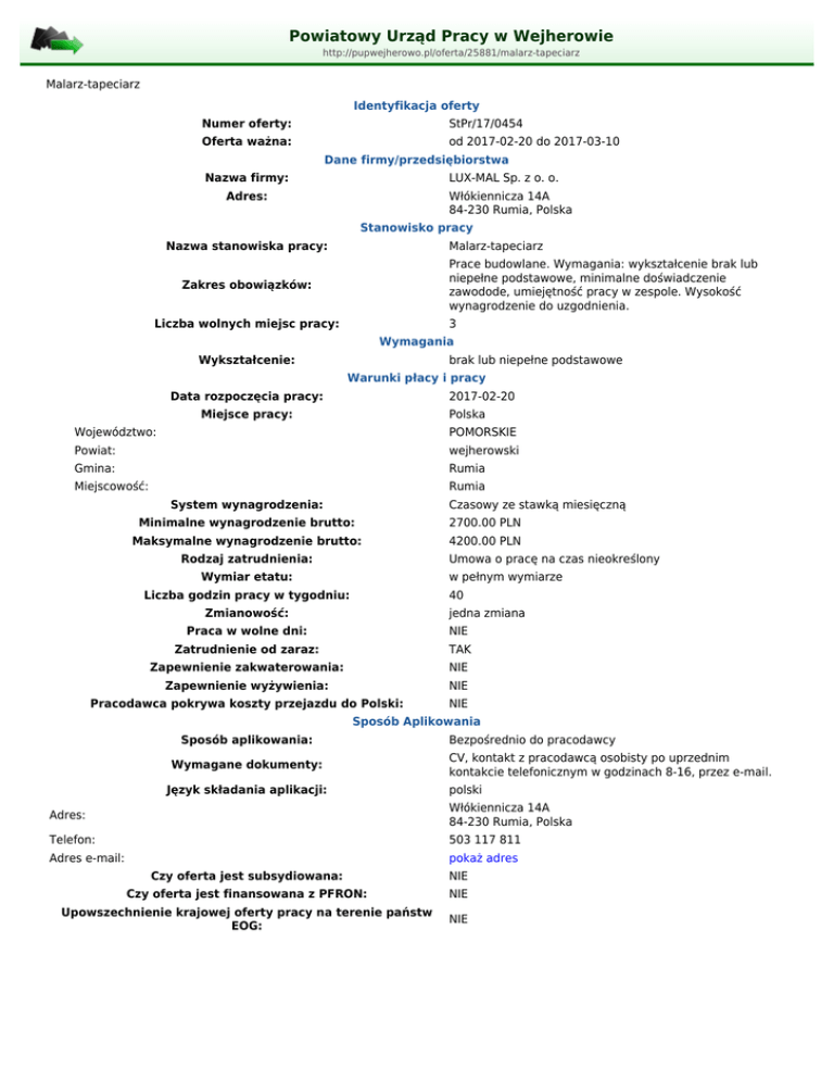 Powiatowy Urząd Pracy w Wejherowie http://pupwejherowo.pl/oferta/25881/malarz-tapeciarz Malarz-tapeciarz Identyfikacja oferty Numer oferty: StPr/17/0454 Oferta ważna: od 2017-02-20 do 2017-03-10 Dane firmy/przedsiębiorstwa Nazwa firmy: LUX-MAL Sp. z o. o. Adres: Włókiennicza 14A 84-230 Rumia, Polska Stanowisko pracy Nazwa stanowiska pracy: Malarz-tapeciarz Prace budowlane. Wymagania: wykształcenie brak lub niepełne podstawowe, minimalne doświadczenie zawodode, umiejętność pracy w zespole. Wysokość wynagrodzenie do uzgodnienia. Zakres obowiązków: Liczba wolnych miejsc pracy: 3 Wymagania Wykształcenie: brak lub niepełne podstawowe Warunki płacy i pracy Data rozpoczęcia pracy: 2017-02-20 Miejsce pracy: Polska Województwo: POMORSKIE Powiat: wejherowski Gmina: Rumia Miejscowość: Rumia System wynagrodzenia: Czasowy ze stawką miesięczną Minimalne wynagrodzenie brutto: 2700.00 PLN Maksymalne wynagrodzenie brutto: 4200.00 PLN Rodzaj zatrudnienia: Umowa o pracę na czas nieokreślony Wymiar etatu: w pełnym wymiarze Liczba godzin pracy w tygodniu: 40 Zmianowość: jedna zmiana Praca w wolne dni: NIE Zatrudnienie od zaraz: TAK Zapewnienie zakwaterowania: NIE Zapewnienie wyżywienia: NIE Pracodawca pokrywa koszty przejazdu do Polski: NIE Sposób Aplikowania Sposób aplikowania: Wymagane dokumenty: Język składania aplikacji: Bezpośrednio do pracodawcy CV, kontakt z pracodawcą osobisty po uprzednim kontakcie telefonicznym w godzinach 8-16, przez e-mail. polski Adres: Włókiennicza 14A 84-230 Rumia, Polska Telefon: 503 117 811 Adres e-mail: pokaż adres Czy oferta jest subsydiowana: NIE Czy oferta jest finansowana z PFRON: NIE Upowszechnienie krajowej oferty pracy na terenie państw EOG: NIE