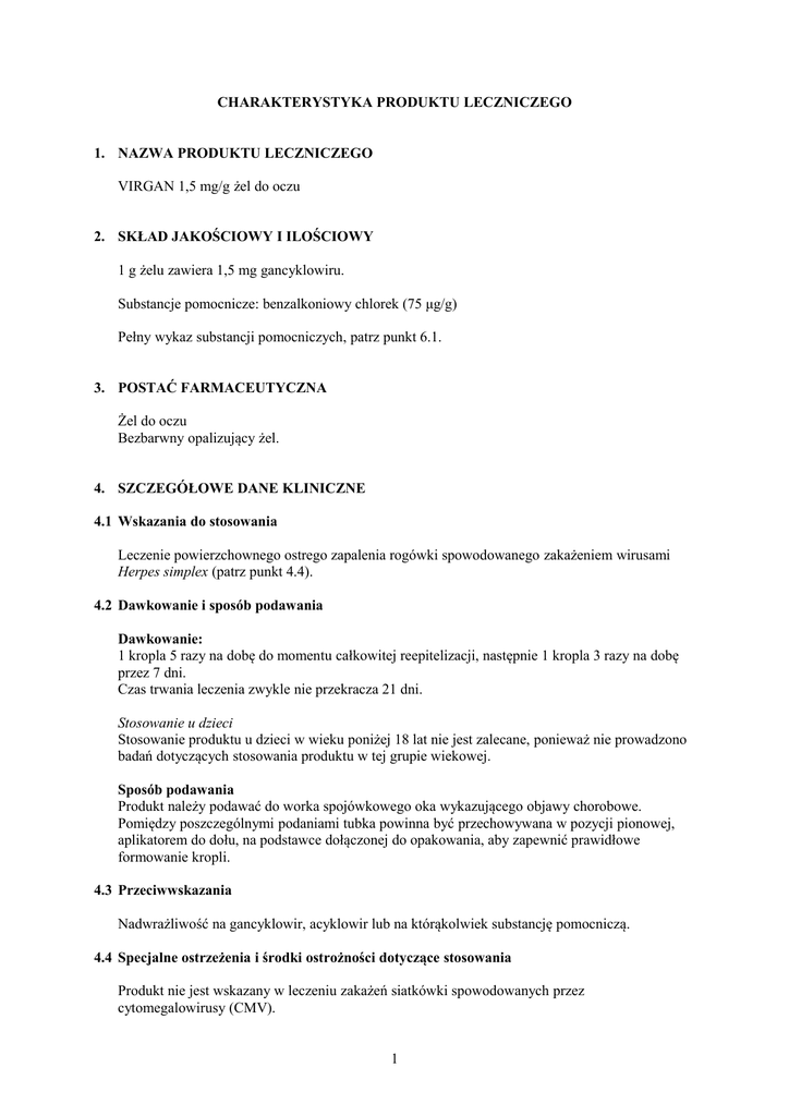 CHARAKTERYSTYKA PRODUKTU LECZNICZEGO 1. NAZWA PRODUKTU LECZNICZEGO VIRGAN 1,5 mg/g żel do oczu 2. SKŁAD JAKOŚCIOWY I ILOŚCIOWY 1 g żelu zawiera 1,5 mg gancyklowiru. Substancje pomocnicze: benzalkoniowy chlorek (75 μg/g) Pełny wykaz substancji pomocniczych, patrz punkt 6.1. 3. POSTAĆ FARMACEUTYCZNA Żel do oczu Bezbarwny opalizujący żel. 4. SZCZEGÓŁOWE DANE KLINICZNE 4.1 Wskazania do stosowania Leczenie powierzchownego ostrego zapalenia rogówki spowodowanego zakażeniem wirusami Herpes simplex (patrz punkt 4.4). 4.2 Dawkowanie i sposób podawania Dawkowanie: 1 kropla 5 razy na dobę do momentu całkowitej reepitelizacji, następnie 1 kropla 3 razy na dobę przez 7 dni. Czas trwania leczenia zwykle nie przekracza 21 dni. Stosowanie u dzieci Stosowanie produktu u dzieci w wieku poniżej 18 lat nie jest zalecane, ponieważ nie prowadzono badań dotyczących stosowania produktu w tej grupie wiekowej. Sposób podawania Produkt należy podawać do worka spojówkowego oka wykazującego objawy chorobowe. Pomiędzy poszczególnymi podaniami tubka powinna być przechowywana w pozycji pionowej, aplikatorem do dołu, na podstawce dołączonej do opakowania, aby zapewnić prawidłowe formowanie kropli. 4.3 Przeciwwskazania Nadwrażliwość na gancyklowir, acyklowir lub na którąkolwiek substancję pomocniczą. 4.4 Specjalne ostrzeżenia i środki ostrożności dotyczące stosowania Produkt nie jest wskazany w leczeniu zakażeń siatkówki spowodowanych przez cytomegalowirusy (CMV). 1 Nie potwierdzono skuteczności produktu w leczeniu stanów zapalnych rogówki i spojówki spowodowanych przez inne wirusy. Nie prowadzono badań klinicznych u pacjentów o osłabionej odporności. Chlorek benzalkoniowy może powodować podrażnienie oczu. Należy unikać kontaktu leku z miękkimi soczewkami kontaktowymi. Należy usunąć soczewki kontaktowe przed zakropleniem i odczekać co najmniej 15 minut przed ponownym założeniem. Substancja zmienia zabarwienie miękkich soczewek kontaktowych. 4.5 Interakcje z innymi lekami i inne rodzaje interakcji Nie dotyczy 4.6 Ciąża i laktacja Brak jest wystarczających danych pozwalających na ocenę bezpieczeństwa stosowania produktu VIRGAN w okresie ciąży i karmienia piersią. Właściwości teratogenne i wpływ na płodność stwierdzono na podstawie badań na zwierzętach, podczas których gancyklowir podawano doustnie lub dożylnie. Stwierdzono także możliwość genotoksycznego działania produktu o małym marginesie bezpieczeństwa (patrz punkt 5.3). W związku z tym stosowanie produktu VIRGAN w okresie ciąży i karmienia piersią nie jest wskazane, za wyjątkiem przypadków gdy nie ma możliwości alternatywnego leczenia. U kobiet w wieku rozrodczym należy zastosować odpowiednie metody zapobiegania ciąży. Z uwagi na to, że w badaniach na zwierzętach stwierdzono genotoksyczność produktu, zaleca się, aby mężczyźni stosujący VIRGAN używali mechanicznych środków antykoncepcyjnych (prezerwatyw) w czasie trwania terapii i 3 miesiące po jej zakończeniu. 4.7 Wpływ na zdolność prowadzenia pojazdów mechanicznych i obsługiwanie urządzeń mechanicznych w ruchu Pacjenci powinni wstrzymać się od prowadzenia pojazdów lub obsługi urządzeń mechanicznych, jeśli po podaniu produktu występują u nich jakiekolwiek zaburzenia widzenia. 4.8 Działania niepożądane Zaburzenia oka • Bardzo częste (>1/10) : przemijające pieczenie i kłucie • Częste (>1/100, <1/10): powierzchniowe punkcikowate zapalenie rogówki 4.9 Przedawkowanie Nie dotyczy 5. WŁAŚCIWOŚCI FARMAKOLOGICZNE 5.1 Właściwości farmakodynamiczne Grupa farmakoterapeutyczna : S 01 AD09 – leki stosowane w zakażeniach oczu, preparaty przeciwwirusowe 2 Gancyklowir, 9-[(1,3- dihydroksy-2-propoksy)metylo]guanina lub DHPG, jest nukleozydem, który hamuje in vitro replikację ludzkich wirusów grupy Herpes (Herpes simplex 1 i 2, cytomegalowirusów), jak również adenowirusów o serotypach l, 2, 4, 6, 8, 10, 19, 22, 28. Gancyklowir w zainfekowanej komórce przekształcany jest do trifosforanu gancyklowiru, aktywnej formy substancji czynnej. Fosforylacja następuje głównie w zainfekowanych komórkach, gdzie stężenie trifosforanu gancyklowiru jest 10 razy niższe w komórkach nie zainfekowanych. Trifosforan gancyklowiru wywiera działanie przeciwwirusowe poprzez hamowanie syntezy DNA wirusa w drodze dwóch mechanizmów: kompetycyjnego hamowania polimerazy DNA wirusa i bezpośredniego wbudowywania związku do cząsteczki DNA wirusa, które blokuje jej wydłużenie. 5.2 Właściwości farmakokinetyczne U ludzi po zakropleniu produktu 5 razy na dobę przez 11 do 15 dni w trakcie leczenia wirusowego zapalenia rogówki stężenia leku w osoczu, określane za pomocą czułych metod analitycznych (granica kwantyfikacji: 0,005 μg/ml), są bardzo małe: średnio 0,013 μg/ml (0 - 0,037). Badania farmakokinetyki produktu prowadzone na oku królika potwierdziły szybką i skuteczną penetrację gancyklowiru do rogówki i przedniego odcinka oka, co pozwala na utrzymywanie się stężeń wyższych niż mediana dawki skutecznej terapeutycznie (ED50) przez kilka godzin. 5.3 Przedkliniczne dane o bezpieczeństwie. Właściwości rakotwórcze i mutagenne Działanie rakotwórcze u zwierząt obserwowano tylko po długim okresie ekspozycji ogólnoustrojowej (20 mg/kg doustnie), co przekraczało 50-krotnie dawkę, jaka może być wchłonięta ogólnoustrojowo przez pacjentów leczonych produktem VIRGAN. Gancyklowir dał pozytywny wynik w trzech z pięciu różnych typów testów genotoksyczności. Pozytywne wyniki uzyskano w najbardziej czułej metodzie (badanie komórek chłoniaka myszy) po zastosowaniu dawki 7500 razy większej niż dawka wchłonięta ogólnoustrojowo przez pacjentów leczonych produktem VIRGAN, oraz w teście mikrojąderkowym u myszy po podawaniu dawki 50 mg/kg dożylnie, co odpowiada 15000 razy większemu stężeniu w osoczu niż podczas podawania produktu VIRGAN do oka u