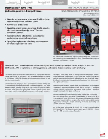 Ograniczniki kombinowane typu 1 Ograniczniki typu 1 Ograniczniki N-PE typu 1 DEHNguard® 1000 (FM) jednobiegunowe, kompaktowe Ograniczniki typu 2 Ograniczniki typu 3 Akcesoria INSTALACJE ELEKTRYCZNE OGRANICZNIKI PRZEPIĘĆ TYPU 2 Typ 2 wg PN-EN 61643-11 Klasa II wg PN-IEC 61643-1 • Wysoka wytrzymałość udarowa dzięki zastosowaniu warystorów z tlenku cynku • Krótki czas zadziałania • Wysoki poziom bezpieczeństwa dzięki urządzeniu kontrolno-odłączającemu ”ThermoDynamik-Control” • Wskaźnik stanu (działania / uszkodzenia) widoczny w okienku kontrolnym • Specjalne wykonanie obudowy dostosowane do wyższego napięcia sieci Ograniczniki typu 2 Do ochrony instalacji niskiego napięcia przed przepięciami. Do stosowania zgodnie ze Strefową Koncepcją Ochrony Odgromowej jako przejście pomiędzy strefami 0B – 1 i wyżej. DEHNguard 1000: jednobiegunowy, kompaktowy ogranicznik o największym napięciu trwałej pracy UC = 1000 V AC DEHNguard ... FM: w wykonaniu ze zdalną sygnalizacją uszkodzenia (bezpotencjałowy zestyk przełączny) Do ochrony przed przepięciami w instalacjach o największym napięciu trwałej pracy AC/DC do 1000 V służą wytrzymałe kompaktowe ograniczniki DEHNguard 1000 (FM). Wykonanie jednobiegunowe ułatwia ich uniwersalne zastosowanie. Uniwersalność nie jest jedyną cechą ograniczników z rodziny DEHNguard. O wiele bardziej znaczące są parametry, światowe osiągnięcia, jak: wysoka wytrzymałość udarowa, niski napięciowy poziom ochrony i podwójny skuteczny układ kontrolno-odłączający Thermo-Dynamik-Control, które stanowią o wysokim stopniu bezpieczeństwa produkowanych urządzeń. Szczególną cechą firmy DEHN są układy kontrolno-odłączające ThermoDynamik-Control, które dbają o to aby ogranicznik, również przy ekstremalnym przeciążeniu, bezpiecznie odłączył się od sieci. Układ taki reaguje jednocześnie na temperaturę powierzchni warystora oraz na przeciążenia prądem udarowym. Również sama obudowa ogranicznika jest dopasowana do warunków zastosowań. Obudowa DEHNguard 1000 (FM) o szerokości 2 modułów spełnia wszystkie mechaniczne wymagania, jakie wynikają z wysokich napięć instalacji, do której jest przyłączany. Obok standardowego wskaźnika optycznego ograniczniki DEHNguard ... FM umożliwiają zdalną sygnalizację uszkodzenia za pomocą złączki z trzema stykami. Te trzy styki tworzą dwie pary zestyków wykonanych jako przełączne bezpotencjałowe, co pozwala, zależnie od przyjętej zasady sygnalizacji, wykorzystać zestyk rozwierny (normalnie zamknięty) lub zwierny (normalnie otwarty). Do podłączenia uziemienia do trzech lub czterech ograniczników DEHNguard 1000 (FM) służą szyny uziemiające typu EB DG 1000 1 3 oraz typu EB 1 4 9, wymienione jako akcesoria. 112 www.dehn.pl Ograniczniki kombinowane typu 1 Ograniczniki typu 1 Ograniczniki N-PE typu 1 Ograniczniki typu 2 Ograniczniki typu 3 Akcesoria DEHNguard® 1000 (FM) DEHNguard 1000 (FM) INSTALACJE ELEKTRYCZNE OGRANICZNIKI PRZEPIĘĆ TYPU 2 12 11 14 Rysunek wymiarowy DG 1000 FM Schemat połączeń DG 1000 FM Ogranicznik przepięć wg PN-EN 61643-11 Ogranicznik przepięć wg PN-IEC 61643-1 Największe napięcie trwałej pracy AC UC Największe napięcie trwałej pracy DC UC Znamionowy prąd wyładowczy (8/20) In Maksymalny prąd wyładowczy (8/20) Imax Napięciowy poziom ochrony Up Napięciowy poziom ochrony przy 5 kA UP Czas zadziałania tA Maksymalny bezpiecznik dodatkowy Maks. bezpiecznik przy U ≤ 690 V AC Wytrzymałość zwarciowa przy maks. bezpieczniku Zakres temperatur pracy TU Wskaźnik działania / uszkodzenia Przekroje przewodów (min.) Przekroje przewodów (maks.) Montaż Materiał obudowy Stopień ochrony Szerokość montażowa Sygnalizacja uszkodzenia FM / Typ zestyku Parametry obwodu sygnalizacji AC Parametry obwodu sygnalizacji DC Przekroje przewodów sygnalizacji FM Dane potrzebne do zamówienia Typ Numer katalogowy Opakowanie jednostkowe Akcesoria do DEHNguard® 1000 (FM) EB DG 3-biegunowa, jednofazowa www.dehn.pl Zacisk do 25 mm2 DG 1000 FM Typ 2 Klasa II 1000 V 1000 V 15 kA 30 kA ≤ 4,2 kV ≤ 3,5 kV ≤ 25 ns 100 A aM 125 A gL/gG 25 kAeff -40°C...+80°C zielony / czerwony 1,5 mm2 drut / linka 35 mm2 wielodrutowo /25 mm2 linka szyna 35 mm wg EN 60715 Thermoplast, kolor czerwony, UL 94 V-0 IP 20 2 moduły, DIN 43880 — — — Typ 2 Klasa II 1000 V 1000 V 15 kA 30 kA ≤ 4,2 kV ≤ 3,5 kV ≤ 25 ns 100 A aM 125 A gL/gG 25 kAeff -40°C...+80°C zielony / czerwony 1,5 mm2 drut / linka 35 mm2 wielodrutowo /25 mm2 linka szyna 35 mm wg EN 60715 Thermoplast, kolor czerwony, UL 94 V-0 IP 20 2 moduły, DIN 43880 przełączny 250 V/0,5 A 250 V/0,1 A; 125 V/0,2 A; 75 V/0,5 A — maks. 1,5 mm2 drut / linka DG 1000 950 102 1 szt. DG 1000 FM 950 112 1 szt. Akcesoria do DEHNguard® 1000 (FM) EB 4-biegunowa, jednofazowa szyna do uziemienia 3 ograniczników DEHNguard 1000 (FM) Typ Wymiary EB DG 1000 1 3 34 x 112 x 3 mm DG 1000 Ograniczniki typu 2 DG 1000 (FM): jednobiegunowe, kompaktowe ograniczniki z największym napięciem trwałej pracy UC = 1000 V AC; w wykonaniu FM ze zdalną sygnalizacją uszkodzenia (bezpotencjałowy zestyk przełączny) Opak. jedn. Numer szt. katalogowy 1 900 411 szyna do uziemienia 4 ograniczników DEHNguard 1000 (FM) Typ EB 1 4 9 Wymiary 34 x 148 x 3 mm Zacisk do 25 mm2 Opak. jedn. Numer szt. katalogowy 1 900 417 113