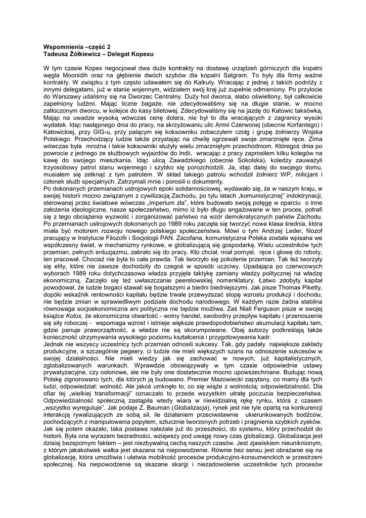 Wspomnienia –część 2 Tadeusz Żółkiewicz – Delegat Kopexu W tym czasie Kopex negocjował dwa duże kontrakty na dostawę urządzeń górniczych dla kopalni węgla Moonidih oraz na głębienie dwóch szybów dla kopalni Satgram. To były dla firmy ważne kontrakty. W związku z tym często udawałem się do Kalkuty. Wracając z jednej z takich podróży z innymi delegatami, już w stanie wojennym, widziałem swój kraj już zupełnie odmieniony. Po przylocie do Warszawy udaliśmy się na Dworzec Centralny. Duży hol dworca, słabo oświetlony, był całkowicie zapełniony ludźmi. Mając liczne bagaże, nie zdecydowaliśmy się na długie stanie, w mocno zatłoczonym dworcu, w kolejce do kasy biletowej. Zdecydowaliśmy się na jazdę do Katowic taksówką. Mając na uwadze wysoką wówczas cenę dolara, nie był to dla wracających z zagranicy wysoki wydatek. Idąc następnego dnia do pracy, na skrzyżowaniu ulic Armii Czerwonej (obecnie Korfantego) i Katowickiej, przy GIG-u, przy palącym się koksowniku zobaczyłem czołg i grupę żołnierzy Wojska Polskiego. Przechodzący ludzie także przystając na chwilę ogrzewali swoje zmarznięte ręce. Zima wówczas była mroźna i takie koksowniki służyły wielu zmarzniętym przechodniom. Któregoś dnia po powrocie z jednego ze służbowych wyjazdów do Indii, wracając z pracy zaprosiłem kilku kolegów na kawę do swojego mieszkania. Idąc ulicą Zawadzkiego (obecnie Sokolska), koledzy zauważyli trzyosobowy patrol stanu wojennego i szybko się porozchodzili. Ja, idąc dalej do swojego domu, musiałem się zetknąć z tym patrolem. W skład takiego patrolu wchodził żołnierz WP, milicjant i członek służb specjalnych. Zatrzymali mnie i porosili o dokumenty. Po dokonanych przemianach ustrojowych epoki solidarnościowej, wydawało się, że w naszym kraju, w swojej historii mocno związanym z cywilizacją Zachodu, po tylu latach „komunistycznej” indoktrynacji, sterowanej przez światowe wówczas „imperium zła”, które budowało swoją potęgę w oparciu o inne założenia ideologiczne, nasze społeczeństwo, mimo iż było długo angażowane w ten proces, potrafi się z tego obciążenia wyzwolić i zorganizować państwo na wzór demokratycznych państw Zachodu. Po przemianach ustrojowych dokonanych po 1989 roku zaczęła się tworzyć nowa klasa średnia, która miała być motorem rozwoju nowego polskiego społeczeństwa. Mówi o tym Andrzej Leder, filozof pracujący w Instytucie Filozofii i Socjologii PAN. Zacofana, komunistyczna Polska została wpisana we współczesny świat, w mechanizmy rynkowe, w globalizującą się gospodarkę. Wielu uczestników tych przemian, pełnych entuzjazmu, zabrało się do pracy. Kto chciał, miał pomysł, ręce i głowę do roboty, ten pracował. Chociaż nie była to cała prawda. Tak tworzyło się pokolenie przemian. Tak też tworzyły się elity, które nie zawsze dochodziły do czegoś w sposób uczciwy. Upadająca po czerwcowych wyborach 1989 roku dotychczasowa władza przyjęła taktykę zamiany władzy politycznej na władzę ekonomiczną. Zaczęło się też uwłaszczanie peerelowskiej nomenklatury. Łatwo zdobyty kapitał powodował, że ludzie bogaci stawali się bogatszymi a biedni biedniejszymi. Jak pisze Thomas Piketty, dopóki wskaźnik rentowności kapitału będzie trwale przewyższać stopę wzrostu produkcji i dochodu, nie będzie zmian w sprawiedliwym podziale dochodu narodowego. W każdym razie żadna stabilna równowaga socjoekonomiczna ani polityczna nie będzie możliwa. Zaś Niall Ferguson pisze w swojej książce Kolos, że ekonomiczna otwartość - wolny handel, swobodny przepływ kapitału i przenoszenie się siły roboczej - wspomaga wzrost i istnieje większe prawdopodobieństwo akumulacji kapitału tam, gdzie panuje praworządność, a władze nie są skorumpowane. Obaj autorzy podkreślają także konieczność utrzymywania wysokiego poziomu kształcenia i przygotowywania kadr. Jednak nie wszyscy uczestnicy tych przemian odnosili sukcesy. Tak, gdy padały największe zakłady produkcyjne, a szczególnie pegeery, ci ludzie nie mieli większych szans na odnoszenie sukcesów w swojej działalności. Nie mieli wiedzy jak się zachować w nowych, już kapitalistycznych, zglobalizowanych warunkach. Wprawdzie obowiązywały w tym czasie odpowiednie ustawy prywatyzacyjne, czy osłonowe, ale nie były one dostatecznie mocno upowszechniane. Budując nową Polskę zignorowano tych, dla których ją budowano. Premier Mazowiecki zapytany, co mamy dla tych ludzi, odpowiedział: wolność. Ale jakoś umknęło to, co się wiąże z wolnością: odpowiedzialność. Dla ofiar tej „wielkiej transformacji” oznaczało to przede wszystkim utratę poczucia bezpieczeństwa. Odpowiedzialność społeczną zastąpiła wtedy wiara w niewidzialną rękę rynku, która z czasem „wszystko wyreguluje”. Jak podaje Z. Bauman (Globalizacja), rynek jest nie tyle opartą na konkurencji interakcją rywalizujących ze sobą sił, ile działaniem przeciwstawnie ukierunkowanych bodźców, pochodzących z manipulowania popytem, sztucznie tworzonych potrzeb i pragnienia szybkich zysków. Jak się potem okazało, taka postawa należała już do przeszłości, do systemu, który przechodził do historii. Była ona wyrazem bezradności, wziąwszy pod uwagę nowy czas globalizacji. Globalizacja jest dzisiaj bezspornym faktem – jest niezbywalną cechą naszych czasów. Jest zjawiskiem nieuniknionym, z którym jakakolwiek walka jest skazana na niepowodzenie. Równie bez sensu jest obrażanie się na globalizację, która umożliwia i ułatwia mobilność procesów produkcyjno-konsumenckich w przestrzeni społecznej. Na niepowodzenie są skazane skargi i niezadowolenie uczestników tych procesów produkcyjnych, którzy nie mogą podążać za zmieniającym swoją lokalizację kapitałem. Globalizacja umożliwia optymalny wybór nowej lokalizacji, nad którym żadna państwowa władza ni