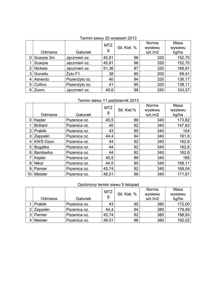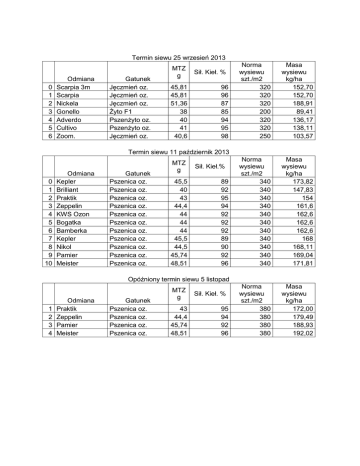 Termin siewu 25 wrzesień 2013 0 1 2 3 4 5 6 Odmiana Scarpia 3m Scarpia Nickela Gonello Adverdo Cultivo Zoom. Gatunek Jęczmień oz. Jęczmień oz. Jęczmień oz. Żyto F1 Pszenżyto oz. Pszenżyto oz. Jęczmień oz. MTZ g 45,81 45,81 51,36 38 40 41 40,6 Sił. Kieł. % 96 96 87 85 94 95 98 Norma wysiewu szt./m2 320 320 320 200 320 320 250 Masa wysiewu kg/ha 152,70 152,70 188,91 89,41 136,17 138,11 103,57 Norma wysiewu szt./m2 340 340 340 340 340 340 340 340 340 340 340 Masa wysiewu kg/ha 173,82 147,83 154 161,6 162,6 162,6 162,6 168 168,11 169,04 171,81 Norma wysiewu szt./m2 380 380 380 380 Masa wysiewu kg/ha 172,00 179,49 188,93 192,02 Termin siewu 11 październik 2013 0 1 2 3 4 5 6 7 8 9 10 Odmiana Kepler Brilliant Praktik Zeppelin KWS Ozon Bogatka Bamberka Kepler Nikol Pamier Meister Gatunek Pszenica oz. Pszenica oz. Pszenica oz. Pszenica oz. Pszenica oz. Pszenica oz. Pszenica oz. Pszenica oz. Pszenica oz. Pszenica oz. Pszenica oz. MTZ g 45,5 40 43 44,4 44 44 44 45,5 44,5 45,74 48,51 Sił. Kieł.% 89 92 95 94 92 92 92 89 90 92 96 Opóźniony termin siewu 5 listopad 1 2 3 4 Odmiana Praktik Zeppelin Pamier Meister Gatunek Pszenica oz. Pszenica oz. Pszenica oz. Pszenica oz. MTZ g 43 44,4 45,74 48,51 Sił. Kieł. % 95 94 92 96