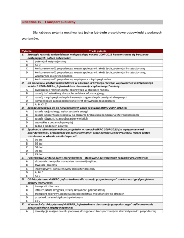 Dziedzina 15 – Transport publiczny Dla każdego pytania możliwa jest jedna lub dwie prawidłowe odpowiedzi z podanych wariantów. Pytanie Treść pytania 1. Strategia rozwoju województwa małopolskiego na lata 2007-2013 koncentrować się będzie na następujących polach aktywności: A potencjał instytucjonalny B AiD C konkurencyjność gospodarcza, rozwój społeczny i jakość życia, potencjał instytucjonalny D konkurencyjność gospodarcza, rozwój społeczny i jakość życia, potencjał instytucjonalny, współpraca międzyregionalna E konkurencyjność gospodarcza, współpraca międzyregionalna 2. Do kierunków polityki województwa w obszarze III Strategii rozwoju województwa małopolskiego w latach 2007-2013 – „Infrastruktura dla rozwoju regionalnego” należą: A zwiększenie roli transportu zbiorowego w obsłudze regionu B rozwój infrastruktury dla społeczeństwa informacyjnego C rozwój międzyregionalnych i wewnątrzregionalnych powiązań drogowych D kompleksowe zagospodarowanie stref aktywności gospodarczej E A, B, C i D 3. Zasada odnosząca się do horyzontalnych zasad realizacji MRPO 2007-2013 to: A zasada racjonalnego wykorzystania energii B zasada koncentracji środków na obszarze Krakowskiego Obszaru Metropolitarnego C zasada równości szans obszarów wiejskich D wszystkie z podanych powyżej E żadna z podanych powyżej 4. Zgodnie ze schematem wyboru projektów w ramach MRPO 2007-2013 (za wyłączeniem osi priorytetowej 9), prowadzone po ocenie formalnej prace Komisji Oceny Projektów muszą zostać zakończone w okresie nie dłuższym niż: A 30 dni B 60 dni C 50 dni D 90 dni E 45 dni 5. Podstawowe kryteria oceny merytorycznej – stosowane do wszystkich rodzajów projektów to: A ekonomiczno-społeczny wpływ na rozwój regionu B trwałość projektu C innowacyjny i konkurencyjny charakter projektu D A, B i C E AiC 6. Oś Priorytetowa 4 MRPO „Infrastruktura dla rozwoju gospodarczego” zawiera następujące główne obszary interwencji: A transport zbiorowy B infrastruktura drogowa, strefy aktywności gospodarczej C transport zbiorowy, poprawa bezpieczeństwa mieszkańców na drogach D przeciwdziałanie klęskom żywiołowym E BiC 7. W ramach Osi Priorytetowej 4 MRPO „Infrastruktura dla rozwoju gospodarczego” dofinansowanie będzie udzielane między innymi na: A inwestycje mające na celu poprawę dostępności transportowej do stref aktywności gospodarczej Pytanie B Treść pytania inwestycje w rozwiązania umożliwiające integrację różnych środków transportu (np. węzły przesiadkowe, systemy Park & Ride) C przedsięwzięcia z zakresu tworzenia nowoczesnych technik zarządzania ruchem drogowym D inwestycje zmierzające do utworzenia i uruchomienia inkubatorów przedsiębiorczości oraz polegające na rozwijaniu lub tworzeniu stref o charakterze parków technologicznych ukierunkowanych na współpracę z instytucjami badawczo-rozwojowymi E A, B, C i D 8. Celem działania 4.2 „Zwiększenie roli transportu zbiorowego w obsłudze regionu”, jest: A poprawa i wzmocnienie na obszarze województwa, systemów transportu publicznego, przyczyniających się do zwiększenia jego atrakcyjności gospodarczej, w tym: miejskich systemów transportu publicznego i systemu kolejowych regionalnych przewozów pasażerskich oraz regionalnej sieci kolejowej B stworzenie silnego i konkurencyjnego sektora MŚP, poprzez bezpośrednią pomoc finansową oraz zapewnienie alternatywnych, pozabankowych źródeł finansowania działalności przedsiębiorstw C zwiększenie poziomu innowacyjności i konkurencyjności firm poprzez uaktywnienie ich współpracy z szerokim zapleczem instytucjonalnym w sferze nauki, prac badawczo-rozwojowych oraz transferu technologii D wspieranie rozwoju Województwa Małopolskiego poprzez rozbudowę regionalnej i lokalnej infrastruktury społeczeństwa informacyjnego, a także zwiększenie wykorzystania Internetu oraz innych technologii informacyjnych i komunikacyjnych (ICT) do świadczenia usług publicznych E AiD 9. Przykładowe rodzaje projektów w działaniu 4.2 schemat A: „Transport miejski”, to: A zakup taboru kolejowego służącego pasażerskim przewozom regionalnym, także na obszarze KOM B modernizacja torów kolejowych C zakup nowego taboru autobusowego – wyłącznie autobusy o zmniejszonej emisji zanieczyszczeń D budowa inteligentnych systemów zarządzania komunikacją publiczną E AiC 10. Zgodnie z zasadami kwalifikowania wydatków ogólne zasady uznania danego wydatku za kwalifikowany to: A zgodność wydatku z postanowieniami Małopolskiego Regionalnego Programu Operacyjnego B zasada A, C i E C niezbędność wydatku dla wdrażania i realizacji projektu D zgodność wydatku postanowieniami Strategii „Małopolska 2015” E dokonanie wydatku w sposób oszczędny 11. Wydatki niekwalifikowane dla działania 4.2 schemat A: „Transport miejski”, obejmują: A wydatki poniesione na nabycie nowego taboru autobusowego, wyłącznie nowe autobusy miejskie o zmniejszonej emisji zanieczyszczeń B zakup niezbędnego dla realizacji projektu sprzętu i wyposażenia w zakresie transportu publicznego C wydatki na zakup używanego taboru autobusowego oraz wydatki na zakup nowego taboru autobusowego – autobusy miejskie nie spełniające wymogu obniżonej emisji zanieczyszczeń a także zakup taboru który nie spełnia (zgodnie z obowiązującymi przepisami prawa) wymogów bezpieczeństwa, środowiskowych, technicznych D AiC E BiC 12. W działaniu 4.2. schemat A, minimalny wkład własny Beneficjent (jeśli dotyczy), wynosi: A 20% B 25% C 30% D 40% E 50% 13. Minimalna kwota wsparcia dla projektu w ramach działania 4.2. schemat A „Transport miejski”, wynosi: A 1 mln zł B 3 mln zł Pytanie Treść pytania C 5 mln zł D 7 mln zł E 10 mln zł 14. Maksymalna kwota wsparcia dla projektu w ramach działania 4.2. schemat A „Transport miejski”, wynosi: A 5 mln zł B 10 mln zł C 15 mln zł D 20 mln zł E 30 mln zł 15. 